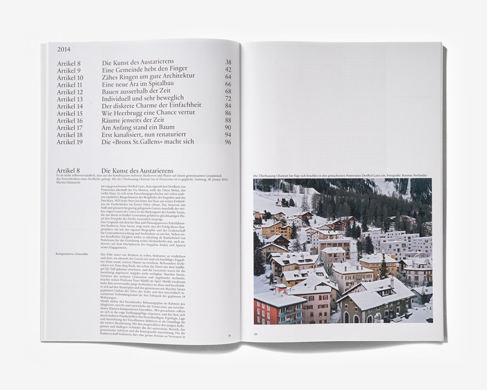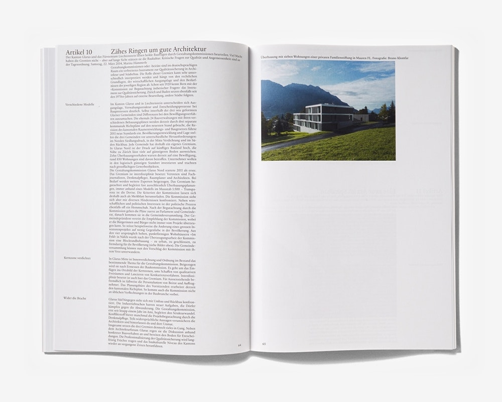 Das Architekturforum Ostschweiz initiierte eine Serie von Zeitungsartikeln zu bemerkenswerten regionalen Bauten und Planungen. Ergänzt um einige thematische Essays erscheinen die Artikel nun in einem grossformatigen, vergleichsweise dünnen weissen Band mit kleiner schwarzer Titelschrift und Inhaltsangabe auf dem Cover. Auch im Inneren operieren die Layouts mit grossen Weissräumen. Die meisten Seiten weisen nur eine auffällig schmale Spalte auf, die entweder mit Text (oft links) oder Bildern (oft rechts) gefüllt ist. So ergibt sich eine ungewohnte Konstruktion des Buchraums, die stark an der Vertikalen ausgerichtet ist und das Architekturthema weiterführt. Durch fast gleiche Behandlung von Text- und Bildspalten, die zudem oft auf Doppelseiten nebeneinanderstehen, wird ein paralleler Lesefluss erzeugt. Die Typografie ist ausgezeichnet, und insgesamt wirkt der Band ruhig und effizient.