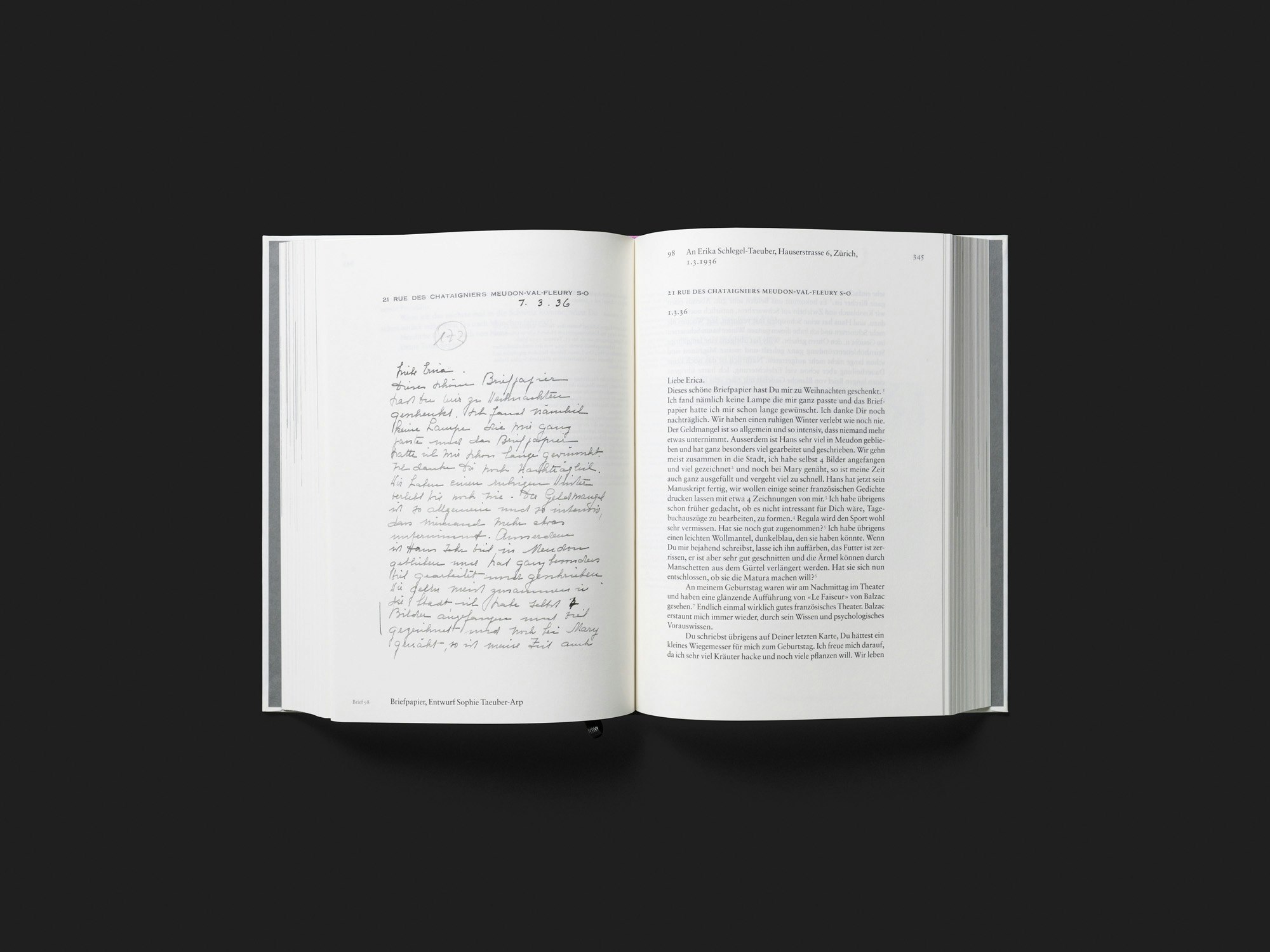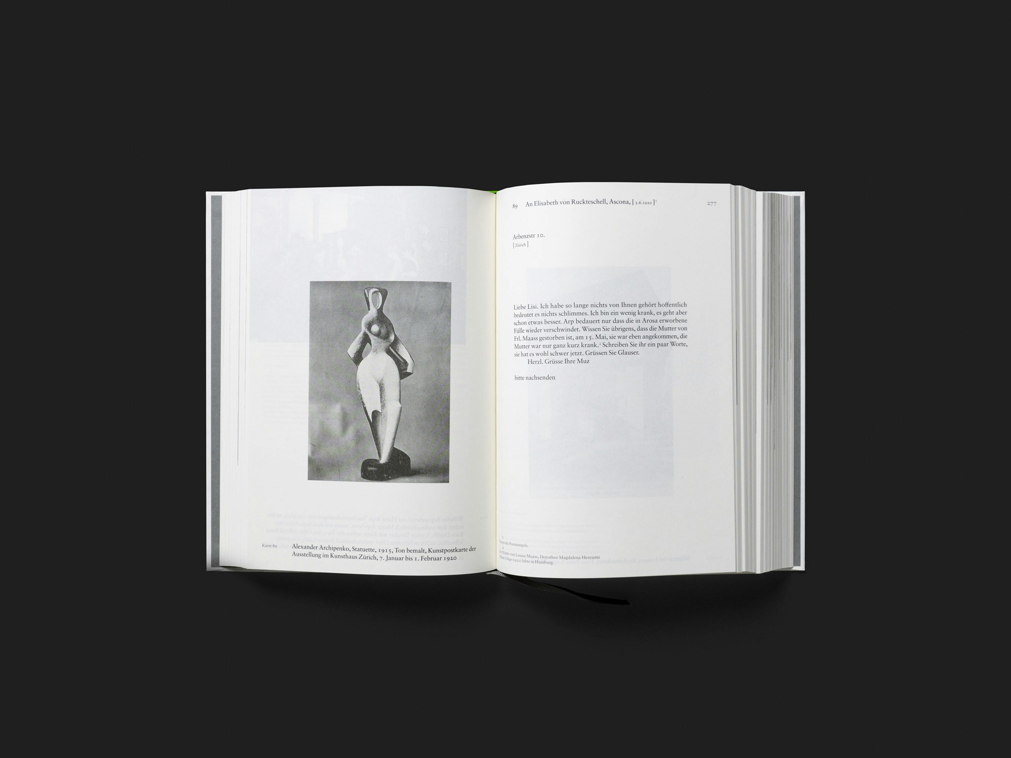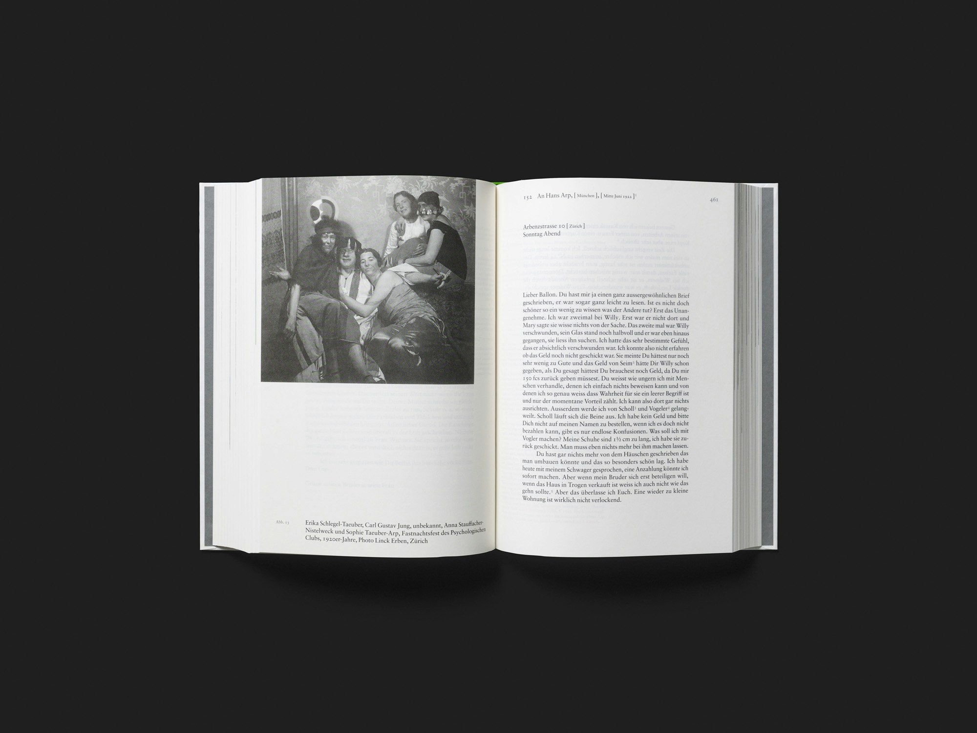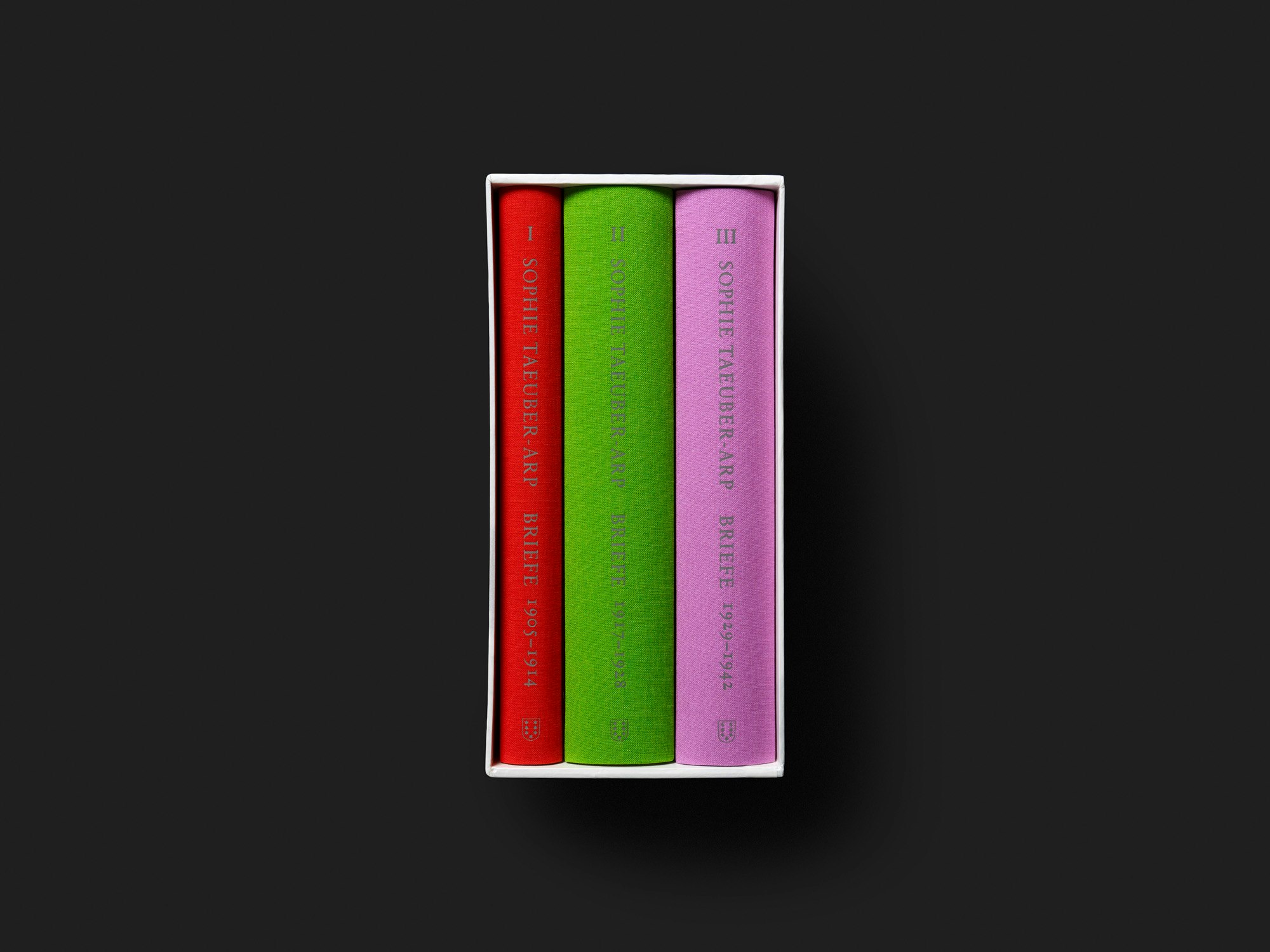 Drei weisse Bände mit verschiedenfarbigen Halbleinen, die insgesamt fast 500 Briefe von Sophie Taeuber-Arp (1889–1943) enthalten, beeindrucken durch den Materialreichtum und den hohen Einsatz aller Beteiligten. Keine der annähernd zweitausend Seiten wirkt überflüssig, weil die facettenreiche Stimme der biografisch wenig erforschten Künstlerin gehört zu werden verdient; weil sie durch präzise Erläuterungen des Herausgeberinnen-Teams erhellt wird; und weil die zurückhaltende Gestaltung alles mit ebenso viel Sorgfalt präsentiert. Zwischen den reichhaltig kommentierten Briefen sind einzelne Fotos aus Taeuber-Arps Leben eingefügt, und am Ende jedes Bandes steht ein Teil mit dem Essay einer Herausgeberin und mit Nachweisen. Obwohl die Teile systematisch und sehr kontrolliert gestaltet sind, wird Monotonie geschickt vermieden. Die Gestaltung geht nicht spezifisch auf die Inhalte ein und leistet keine Interpretationen, sondern schafft Strukturen, um das recherchelastige Material zugänglich zu machen. Die massive Buchform wirkt zwar kaum noch zeitgemäss, aber Taeuber-Arp gebührt eine solche Präsentation sicherlich ebenso sehr wie vielen schon länger damit beehrten Kollegen.