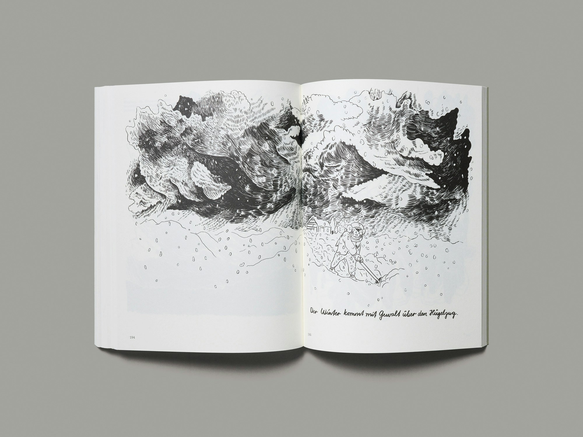 In dieser schwarz-weissen Graphic Novel aus dickem Papier interagiert die Gestaltung vielfach geschickt mit den Illustrationen. Die Geschichte handelt vom Vater der Autorin Lika Nüssli, der Anfang der 1950er-Jahre im Toggenburg als Verdingbub arbeiten musste. Unterschiedlich grosse Zeichnungen mit starkem schwarzem Strich und handgeschriebene Texte – sowohl unter den Bildern als auch in den Sprechblasen – sind ohne die genretypischen Bildrahmen frei auf den weissen Seiten arrangiert. Dazwischen sind einzelne fast leere Seiten eingefügt, die in einer Schreibmaschinenschrift jeweils ein oder zwei tagebuchartige Notizen von Nüsslis Vater aus den 2000er- Jahren (oft mit Wetterberichten) zeigen und eine assoziationsreiche Parallelgeschichte ergeben. In derselben Schrift stehen am unteren Rand die Seitenzahlen sowie gelegentliche lexikalische Erläuterungen zu Dialektwörtern im Text. Die enge Zusammenarbeit von Autorin und Gestaltungsteam zeigt sich exemplarisch an einer schwarz bedruckten Seite, die bereits von Aussen im Schnitt sichtbar ist, und die in der Geschichte den Moment markiert, als der Junge von seinen Eltern als Verdingbub abgegeben wird. Das Material wird äusserst sorgfältig behandelt, und Geschwindigkeit und Rhythmus sind hervorragend. Dass die aus der Erinnerung konstruierte Geschichte lückenhaft sein muss, kommt ebenso zum Ausdruck wie die Dringlichkeit und Intensität, mit der sie während der Pandemie – als der Vater schon über 80 Jahre alt war – erzählt wurde.