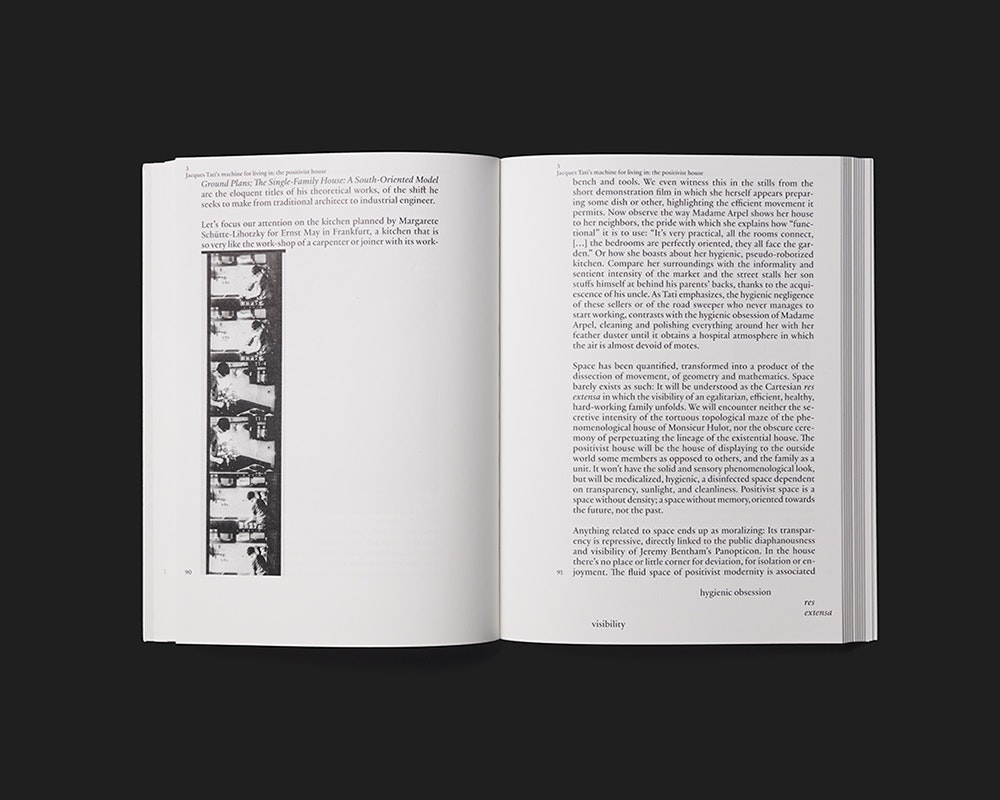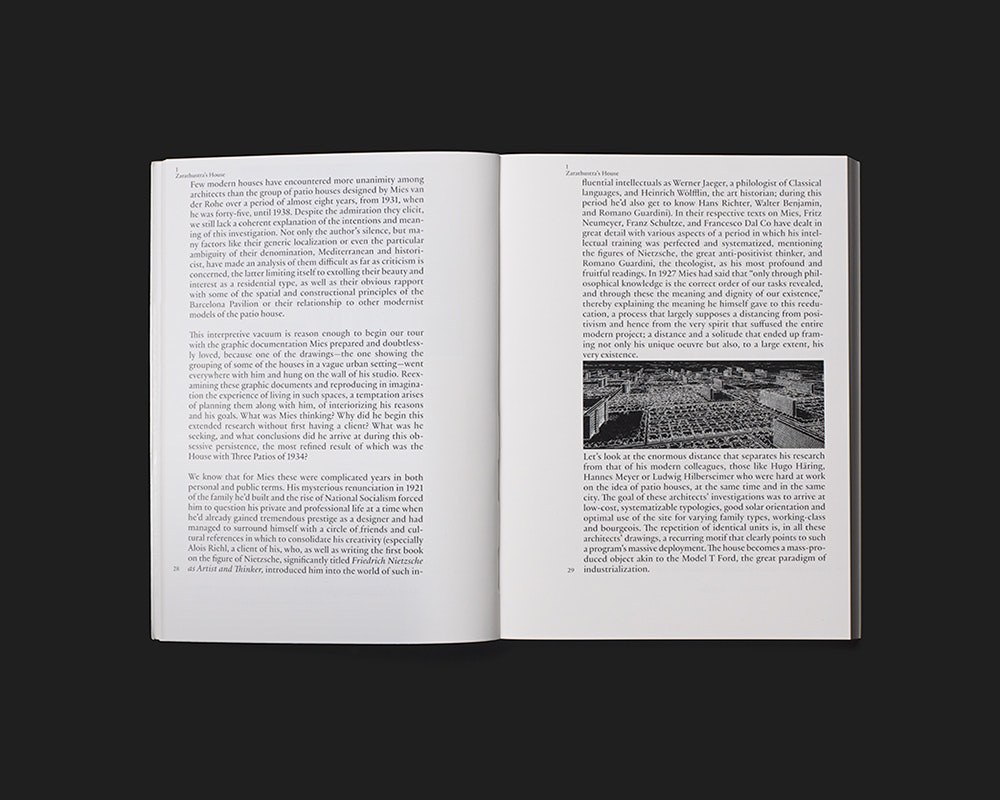 Die bebilderte Analyse von sieben realen und fiktiven Häusern aus dem 20. Jahrhundert, die der spanische Architekt Iñaki Ábalos 2001 veröffentlichte, erscheint in neuer Auflage und Gestaltung. Die Stilmittel sind explizit zeitgenössisch – Beschränkung auf Schwarz / Weiss, Softcover mit zwei Bildern und seitengrossen Klappen, einspaltiger Haupttext in relativ grosser Schrift, etc. –, doch dient dies in dem Fall dazu, die anhaltende Aktualität des Werks oder gar seine Zeitlosigkeit zu unterstreichen. Das relativ kleine Format wirkt für ein Architekturbuch angenehm bescheiden. Die Kapitel beginnen mit einer typografischen Titelseite, dann folgen einige grosse Bilder auf je einer Seite und anschliessend der Text. Hier sind kleinere Bilder mitten in den Paragraphen – und manchmal mitten in einem Satz – linksbündig im Satzspiegel eingeschaltet, sodass sie als integrale Bestandteile erscheinen. Kapitelnummer und -titel in der Kopfzeile, sowie Seitenzahlen und ein bis vier Keywords am unteren Rand rahmen die einzelne Seite und bieten zugleich ein Leitsystem. Der Gesamteindruck ist leicht, elegant und attraktiv.
