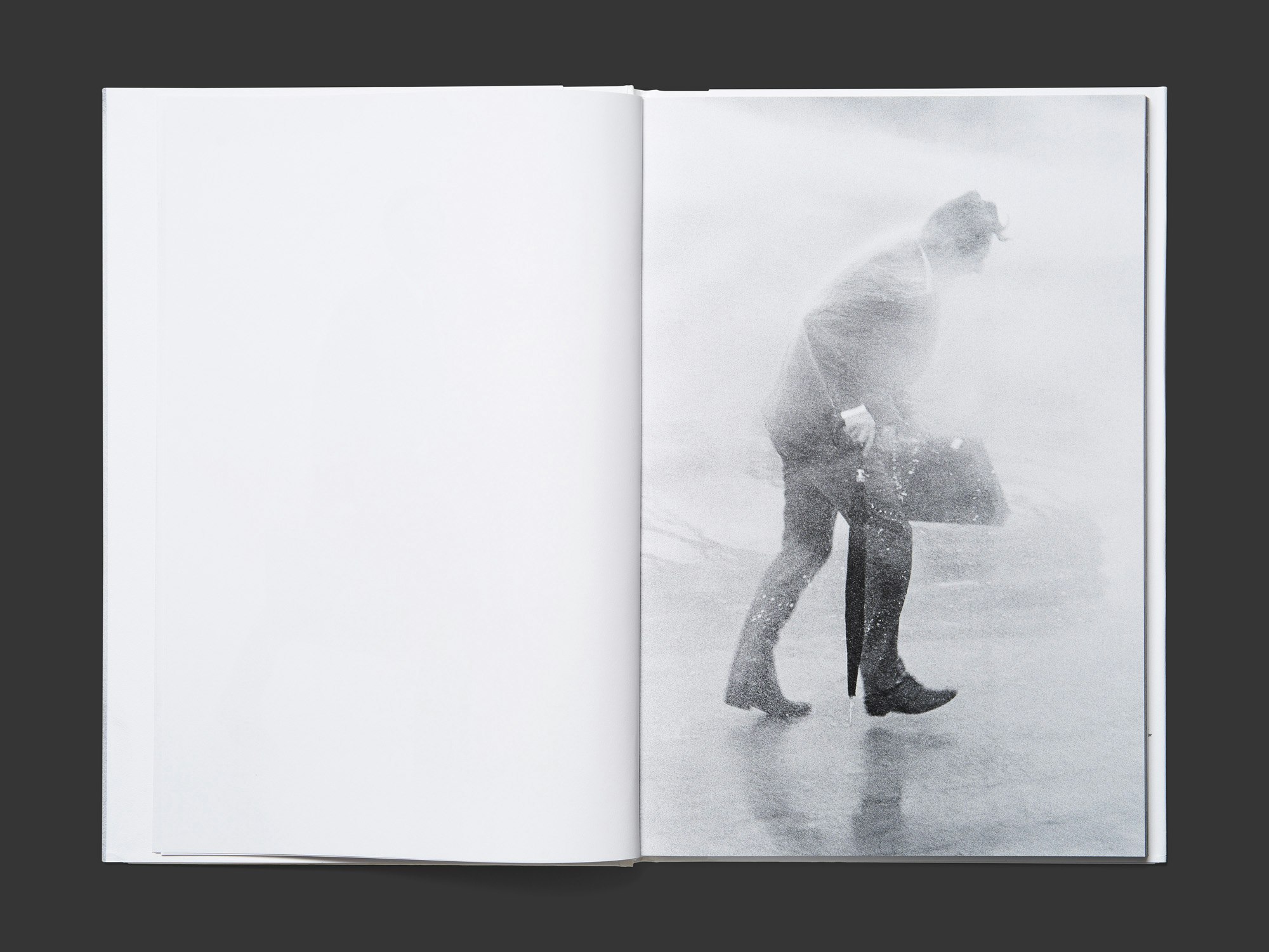 Ein dünnes, aber schweres Fotobuch mit Hardcover und Schutzumschlag, das eine unveröffentlichte Bildserie vom Mai 1969 präsentiert, findet einen ebenso originellen wie erhellenden Zugang zum Archivmaterial. Ganz ohne Typographie zeigen die über 60 schwarzweissen Fotos, immer randabfallend auf einer rechten Seite platziert, wie sich ein adrett gekleideter Journalist der Zeitschrift «Sie und Er» mit Aktenkoffer und Regenschirm bei einem Test vor die damals neuen Wasserwerfer der Stadtpolizei Zürich stellte, bis er komplett durchnässt war. Während die Bilder für journalistische Zwecke gemacht wurden und nicht zur seriellen Veröffentlichung vorgesehen waren, evozieren sie in der neuen Präsentation die Konzeptund Performancekunst der damaligen Zeit. Zugleich fungieren sie als visuelles Gedächtnis, das mit einer neuartigen Figur eines Demonstranten einen überraschenden Blick auf die politischen Unruhen in Zürich bietet. Von Grösse und Format über das dicke Papier bis zur breiten Schrift sind sämtliche gestalterischen Entscheidungen geglückt. Das ungewohnte, rutschfeste Papier des Schutzumschlags unterstreicht die Körnigkeit der historischen Fotos.