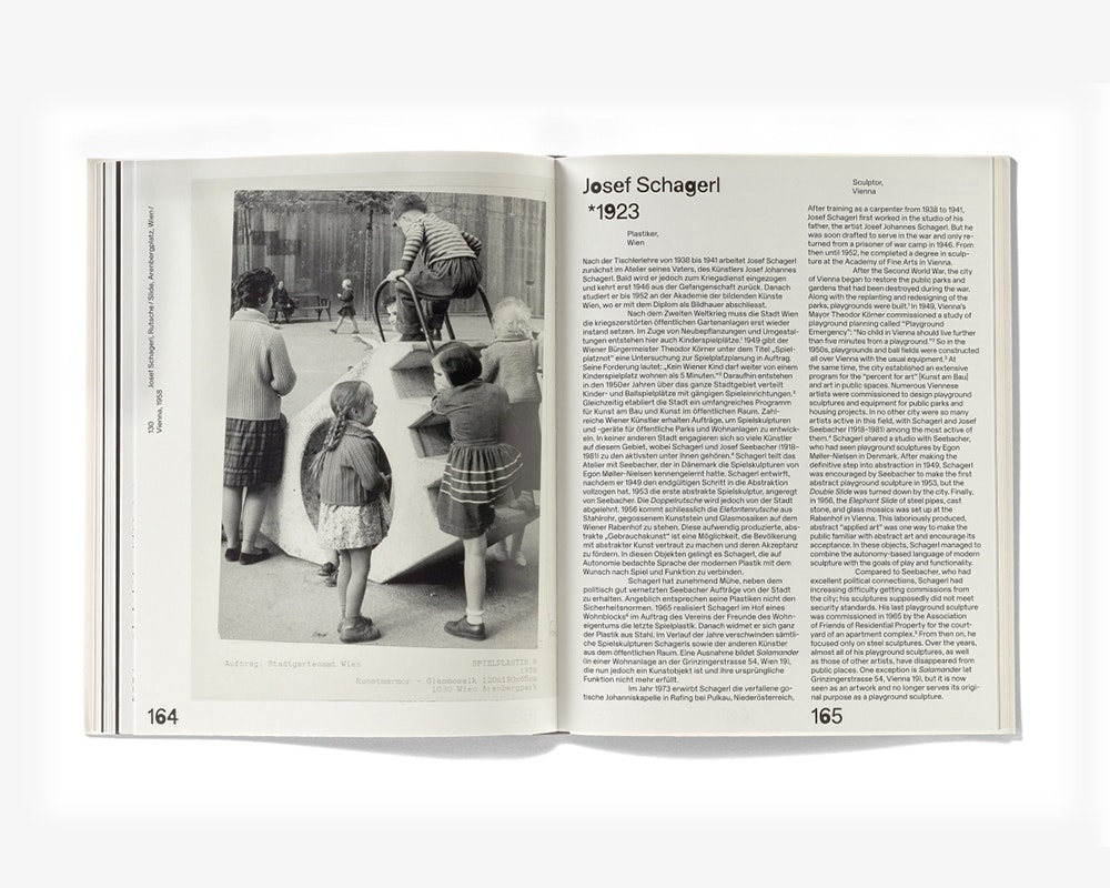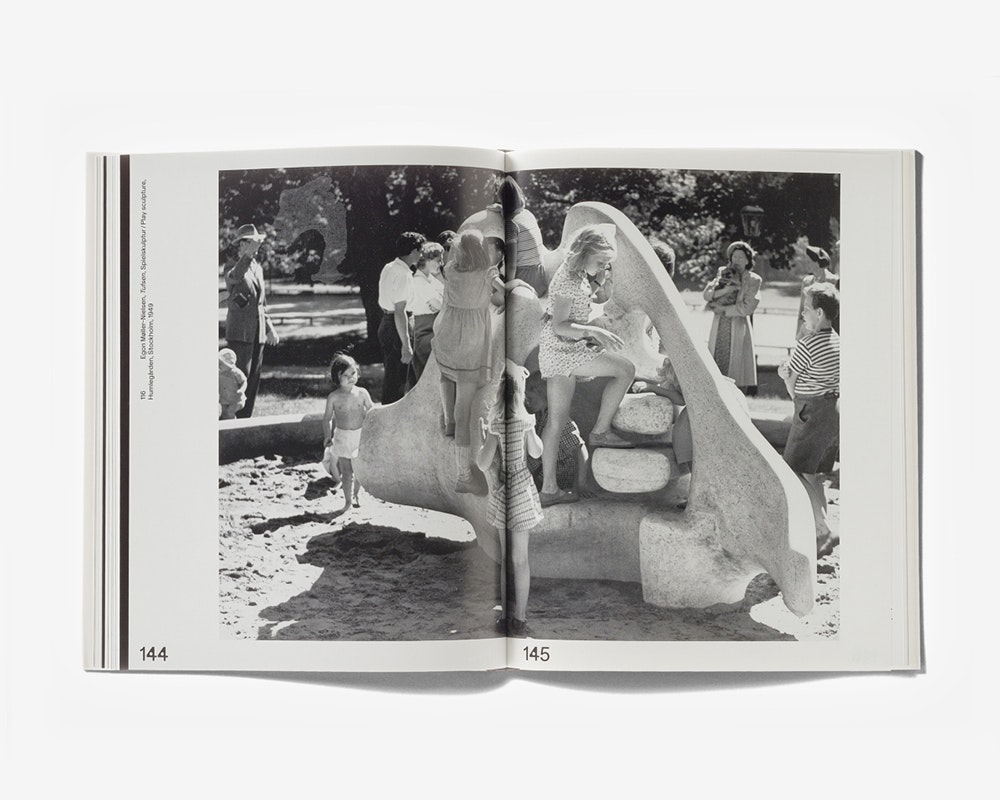 Eine Ausstellung der Kunsthalle Zürich war Entwürfen, Geräten und Modulsystemen für Kinderspielplätze aus den 1950er- bis 1980er-Jahren gewidmet. Der mittelgrosse Katalog mit weissem Hardcover kombiniert viel attraktives Bildmaterial mit informationsreichen Texten über Gestalterinnen und Wissenschaftler, sodass er gleichermassen zum Durchblättern wie zu vertiefter Lektüre einlädt. Die Gestaltung orientiert sich am Spielplatzthema, indem sie etablierte Restriktionen und neue Freiräume austestet. Die auffällige rote Coverschrift mit einzelnen fetten Buchstaben kehrt im Inneren verkleinert und schwarz-weiss als Titelschrift wieder. Zusammen mit dem knapp bemessenen Zeilendurchschuss und mit den grossen Seitenzahlen, die zwischen zwei Positionen wechseln können, prägt sie das eigenständige typografische Erscheinungsbild. Die zweisprachigen Texte verlaufen in einer breiteren Spalte (Deutsch) und einer schmaleren (Englisch) nebeneinander, was bisweilen irritierende, doch auch überraschende Effekte erzeugt.