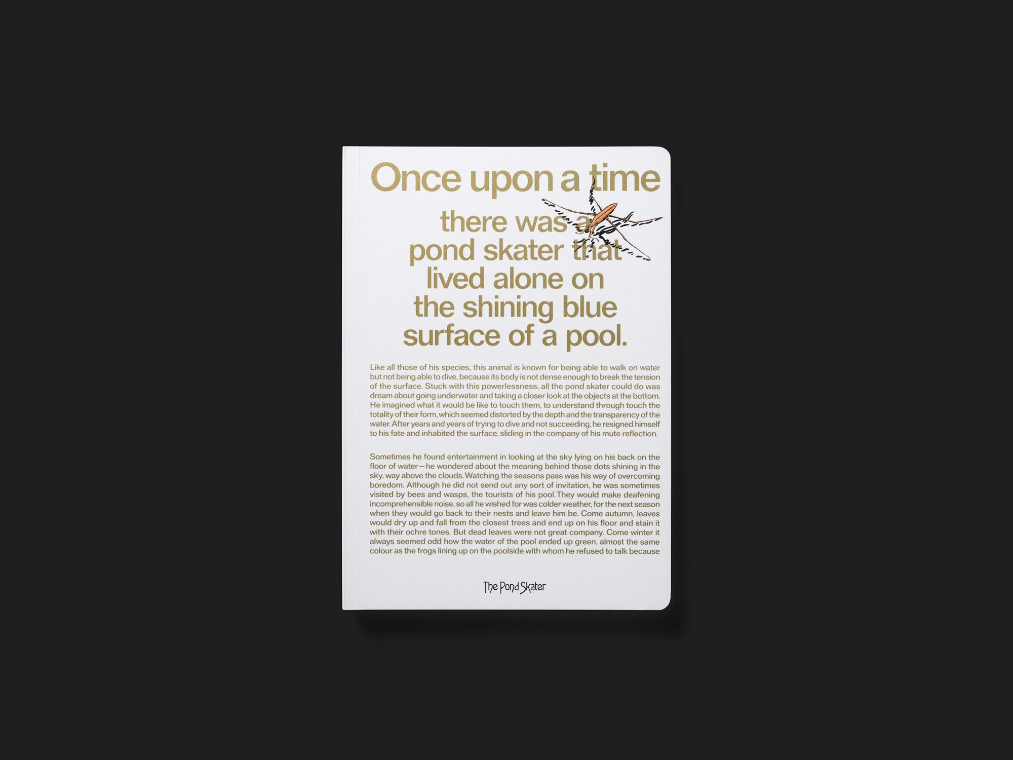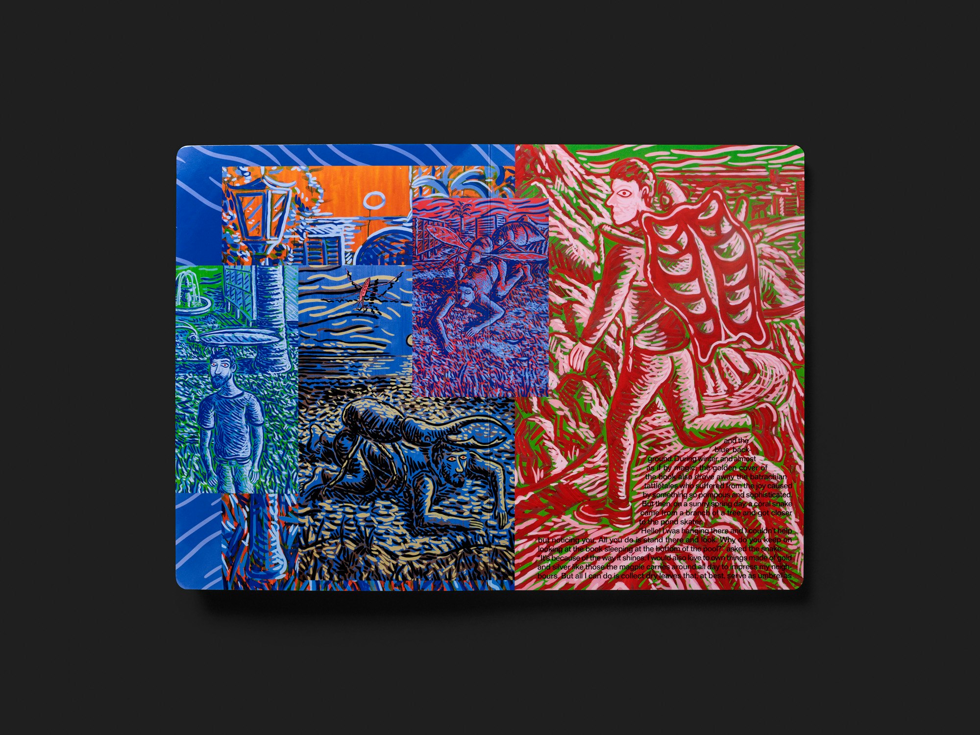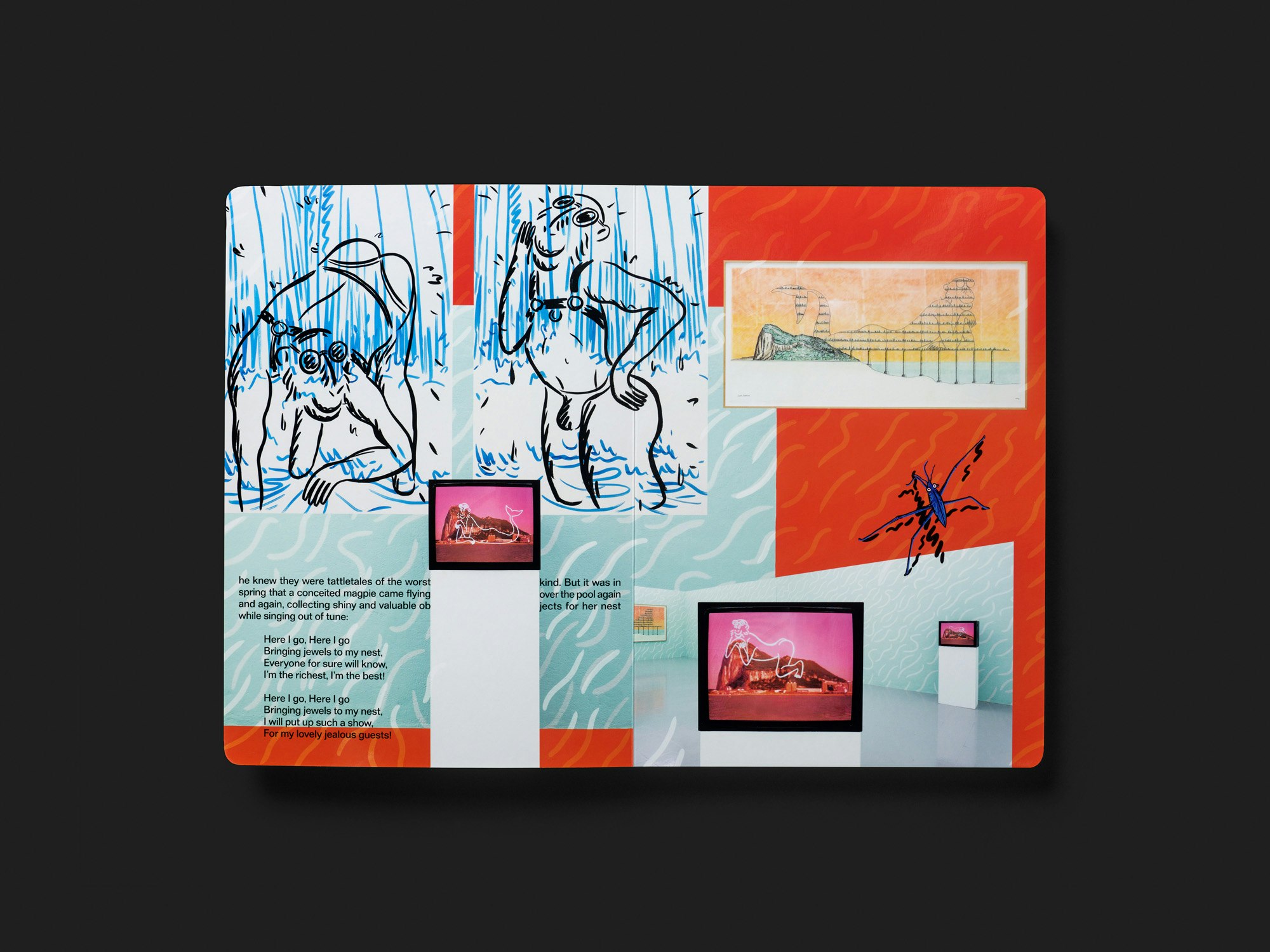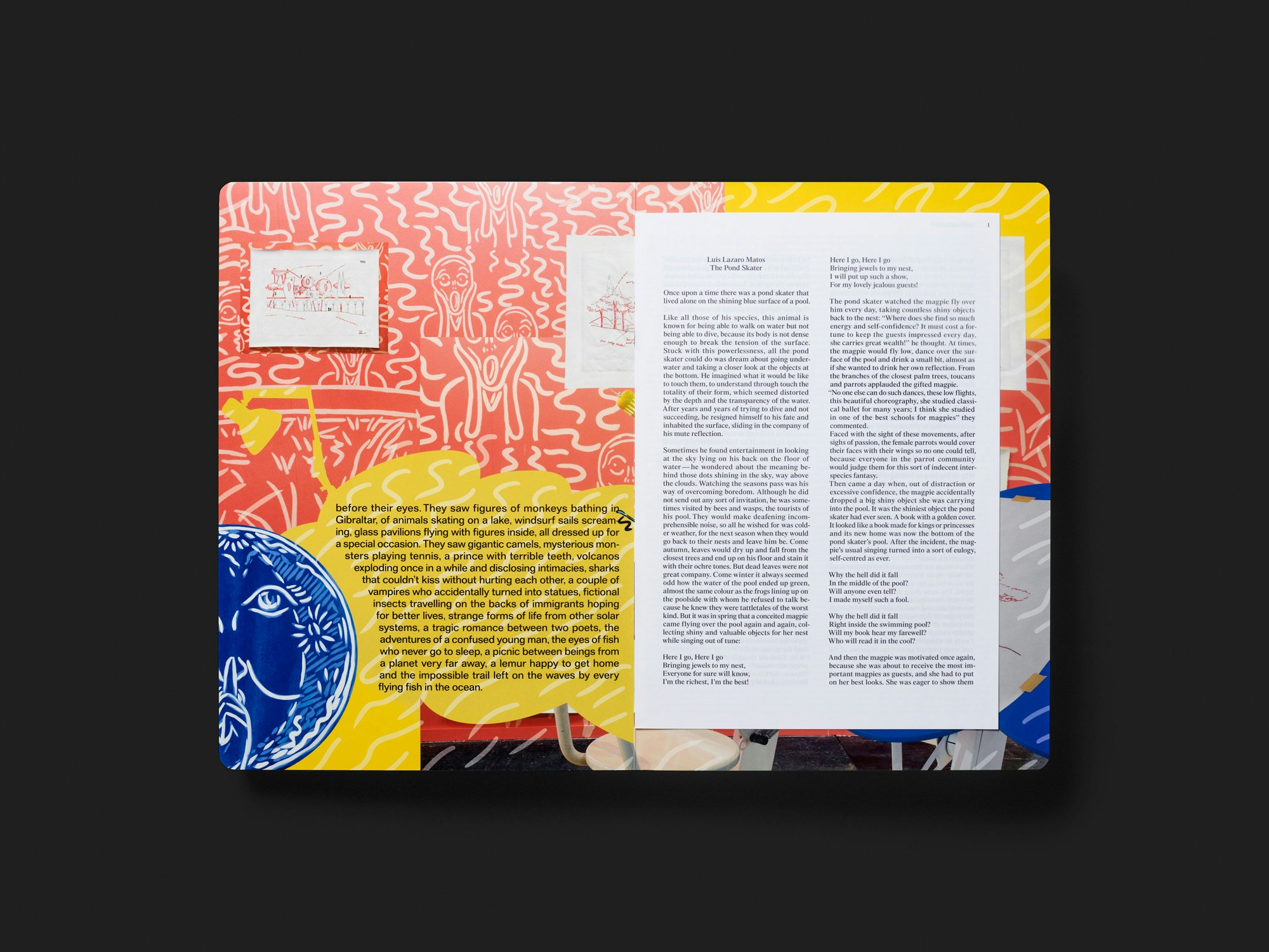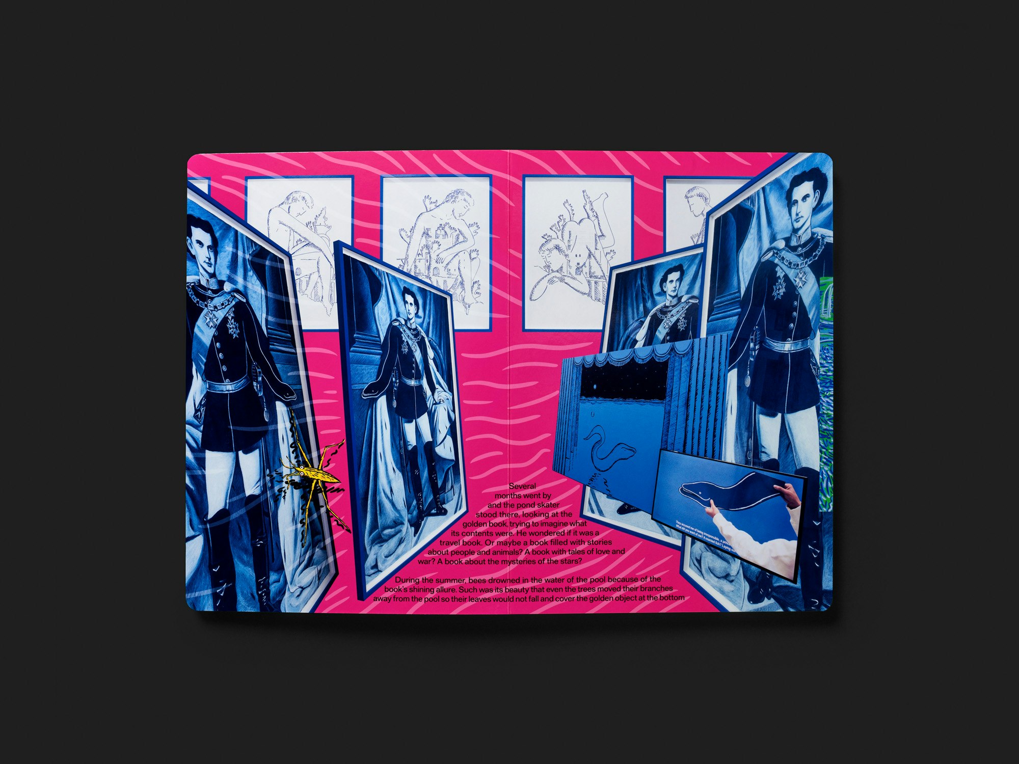 Eine grossformatige Publikation aus dicken Kartonseiten des Portugiesen Luís Lázaro Matos wirkt wie ein illustriertes Kinderbuch, bietet aber auch eine Reflexion über künstlerische Praxis in Buchform. Auf dem weissen Umschlag beginnt in grosser goldener Schrift eine vom Künstler verfasste Fabel über einen Wasserläufer, eine Elster und eine Schlange. Im Inneren bieten doppelseitige Bildcollagen eine ganz andere visuelle Sprache, doch wird der Fabeltext kontinuierlich (in kleinerer, schwarzer Schrift) fortgesetzt. Auf jeder Doppelseite werden dazu mehrere Gemälde, Zeichnungen oder auch Fotografien von Performances des Künstlers vor ebenfalls gezeichneten Hintergründen arrangiert. Mit dem Buch als Ausstellungsraum wird eine nicht unproblematische Metapher aufgerufen, doch die Collagen führen die vielfältige künstlerische Praxis in interessanter Weise im Buchmedium weiter. Der Wasserläufer steht gezeichnet auf jeder Doppelseite, so wie er in der Fabel auf der Oberfläche des Wassers steht und in die Tiefe schaut, wo ein von der Elster verlorenes, goldenes Buch liegt. Zwischen Zwei- und Dreidimensionalität sowie zwischen Handwerk und Rendering schwankend, hinterfragen die Collagen den Status verschiedener bildgebender Medien. Die bisweilen evozierte Ästhetik der Hässlichkeit wirkt sehr zeitgenössisch.