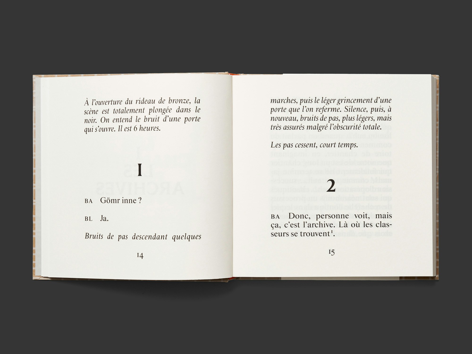 Ein quadratisches, eher kleines Textbuch mit dickem, beige-rotem Hardcover setzt ein Gespräch zwischen den Lausanner Architekten Bakker & Blanc betont performativ in Szene. Ganz ohne Bilder erscheint der Dialog als Theaterstück mit Akten, Regieanweisungen, Besetzungsliste etc. Die grosse Serifenschrift und die kurzen, einspaltigen Textblöcke erinnern phasenweise an frühneuzeitliche Drucke. Zwischendurch wirkt es auch wie ein Schriftmusterbuch, da die markante Schrift vielfältig variiert wird: einzelne seitenfüllende Buchstaben am Anfang; sehr grosse Zwischentitel mitten auf der Seite; aufrechte und kursive Schnitte im Dramentext; kleinere Schriftgrösse in einem rot gedruckten Literaturverzeichnis auf vier schmäleren grauen Seiten. Für den Überzug des Umschlags wurde ein isolierendes Baumaterial verwendet, und im hinteren Buchdeckel ist eine kleine Vinyl-Spielplatte eingelegt. Alles ist äusserst stylisch und schön. Das Objekt würde auch als stage prop auf der Theaterbühne eine gute Figur machen.