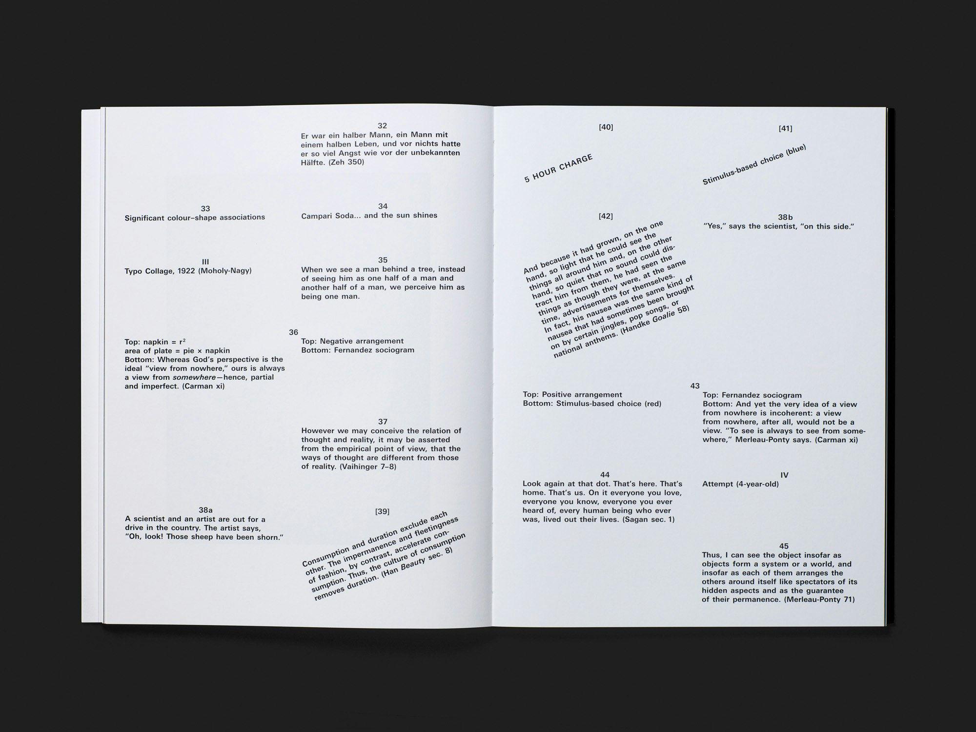 Das zweite Buch in der Kollaboration zwischen der Fotografin Uta Eisenreich und der Gestalterin Julia Born erkundet virtuos wechselseitige Austauschverhältnisse zwischen Text- und Bildsprache. Im Vergleich zum ersten Buch, das ein gutes Jahrzehnt zurückliegt, präsentieren sich die zahlreichen bunten, sachlich-formalen Objektfotos nun weniger als verdichtete Narrative, sondern eher als einzelne bildsprachliche Zeichen. Nach jeweils 22 Seiten folgt eine Doppelseite mit Bildlegenden, die sich in sehr unterschiedlicher Weise auf die fotografierten Objekte, formale Eigenheiten, Bildsprache etc. beziehen. Manche Legenden sind rein deskriptiv, andere bieten Zitate aus Philosophie, Wahrnehmungspsychologie, Werbehandbüchern, usw., und wieder andere sind Witze. Die einzelnen Konstellationen von Bild und Text wirken wie magische Momente – auch wenn nicht auf Anhieb klar wird, wie es im Einzelnen funktioniert, so funktioniert es auf jeden Fall. Die Typografie der Legenden variiert subtil, während das Raster und die Anordnung auf der Doppelseite konstant bleiben. In der Ausstattung werden souverän unterschiedliche Materialen kombiniert: ein Hochglanz- und ein mattes Papier, eine spiegelnde Folie für das Hardcover und ein dünnes Papier für den Schutzumschlag mit einem Loch, das wie ein Bildelement aussieht. Was ist ein Bild? Zu dieser grossen Frage gibt das Buch zahlreiche Hinweise, ohne je didaktisch, kryptisch oder ironisch zu wirken.