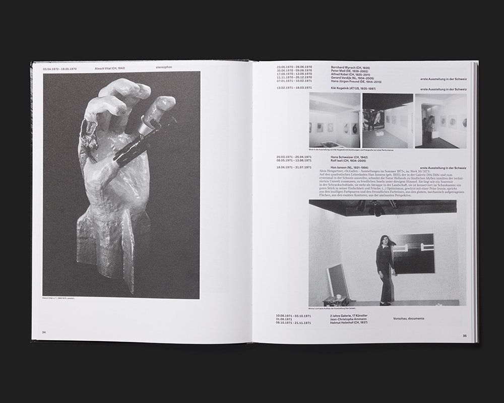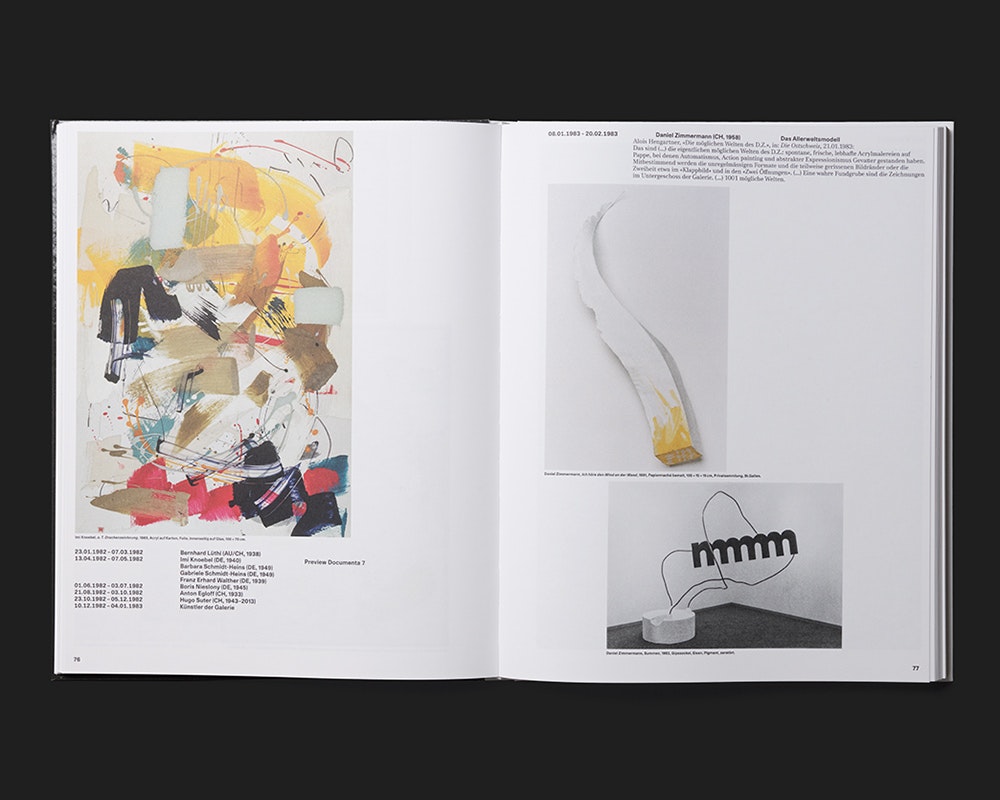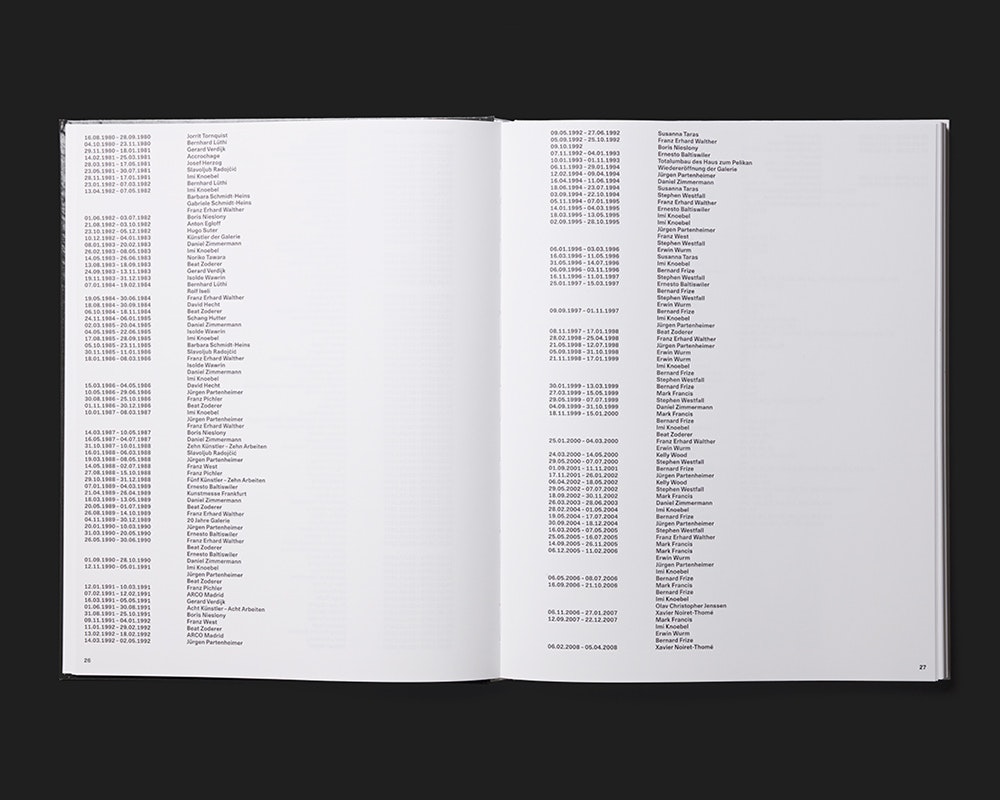 Der Band zum 40-jährigen Bestehen von Wilma Locks Galerie verwendet ein effizientes Ordnungs- und Gestaltungssystem. Nach einem in Media 77 gesetzten Interview mit der Galeristin folgt auf vier Seiten eine chronologische Auflistung aller Ausstellungen, die in relativ fetter Unica 77 meist auf einer Zeile aufgeführt sind. Dieselbe Auflistung im identischen Satz erscheint über die folgenden gut 150 Seiten verstreut noch einmal, doch nun fungieren die Zeilen als Zwischentitel. Dazwischen sind kurze Zeitungstexte (wieder in Media 77) und / oder dokumentarische Fotos eingefügt. Die Texte sind einspaltig untereinander angeordnet, aber die Bilder variieren in Anzahl, Grösse und Platzierung nach einem schlichten System. So entsteht ein wechselnder Rhythmus, doch bleibt alles extrem kontrolliert. Lithografie und Druck sind überdurchschnittlich. Die beiden Schriften des «Team 77» rufen das Gründungsjahr der Galerie in Erinnerung und unterstreichen typografisch den im Titel formulierten Anspruch auf eine 40 Jahre anhaltende Zeitgemässheit.