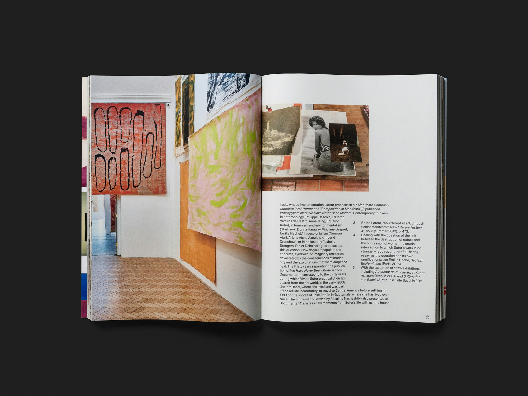Der Ausstellungskatalog des Kunstmuseums Luzern überträgt die künstlerische Arbeitsweise von Vivian Suter durch ungewohnte gestalterische Entscheidungen in ein sehr eigenständiges Buch. Ein gefaltetes Softcover, dünnes Papier und japanische Bindung machen das Objekt weich und beweglich, was auf Suters lose in den Raum gehängte Leinwände anspielt. Die oftmals von Seite zu Seite wechselnden Layouts mit variablen Einzügen für einzelne Textblöcke führen Suters freie Zusammenstellung von abstrakten Formen weiter. Da die losen Leinwände im Buch – meist einzeln auf einer Seite – freigestellt abgebildet sind, resultieren keine exakten Rechtecke, sondern stets leicht variierende Formate. Auch Suters Papierarbeiten sind freigestellt und werden oft minimal schräg platziert, so als wären sie von Hand abgelegt worden. Alles wirkt sehr dynamisch und frei, und in jedem Moment bleibt deutlich, dass die gewählte Anordnung und Präsentation ebenso gut hätte anders ausfallen können. Anstatt die künstlerische Arbeit in ein gestalterisches System zu zwängen, werden etablierte Hierarchien des Buchdesigns hinterfragt, doch geschieht dies ohne programmatisches Statement, da die Interventionen unmittelbar in der Praxis stattfinden.