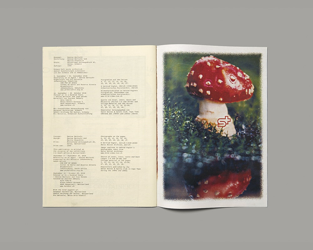 Die dünne, aber dicht mit Bildern gefüllte Publikation legt auf 44 Seiten Fundstücke eines bildkünstlerischen Forschungsprojekts aus, das verschiedenartige Beziehungen von Schweizern zum südafrikanischen Apartheidregime in den 1980er- und 1990er-Jahren untersuchte. Ganzseitig abgedruckte und meist collagierte Werbungen und Beiträge aus dem Vereinsblatt eines Schweizerischen Sportclubs in Kapstadt bieten Einblick in Aktivitäten und Haltungen der Schweizer Exilgemeinschaft. Alternierend sind Seiten mit einzelnen gerahmten Fotografien von Anti-Apartheid-Kundgebungen in der Schweiz eingefügt, die Gertrud Vogler (1936–2018) in den 1980er-Jahren machte. Trotz des geringen Umfangs der Publikation entsteht der Eindruck von vertiefter Forschung und destillierten Ergebnissen – z.B. wenn auf Transparenten der Anti-Apartheid-Kundgebungen rassistische Wörter oder Darstellungen auftauchen. Format und Ästhetik des Vereinsblatts werden mit wenigen gestalterischen Mitteln in ein starkes neues Objekt übertragen. Die Publikation ist Teil eines grösseren künstlerischen Projekts zu Ambivalenzen der Schweizerischen Aussenpolitik. Die hier verfolgte Methode der Bildforschung dürfte sich auch in anderen Fallbeispielen als produktiv erweisen.