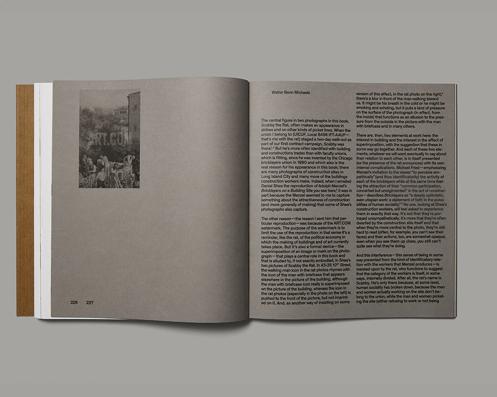 This medium-sized but weighty artist’s book with a brown cardboard fold-out cover and Swiss binding presents a multifaceted photographic essay on urban planning, building sites and gentrification by the American Daniel Shea. Images from the area around Shea’s studio address at 43–35 10th Street in Long Island City, New York – a neighbourhood increasingly dominated by new luxury high-rises – are combined with photos including Oscar Niemeyer’s planned city of Brasilia and Searles Valley, California. A series of image sections arranged by topic feature between one and eight images of differing size and layout per double page without commentary. Two of these sections contain pictures framed as actual works of art, superimposing a second, curatorial level over the documentary photographic work. The sequencing of the images is exceptional and creates a narrative that is both meaningful and mysterious. An additional effect of layering is generated through the use of individual inlaid pages of tracing paper containing abstracted plan drawings and projections of buildings. The cover design, with an uncaptioned black-and-white image on the front and another on the back, is very appealing.