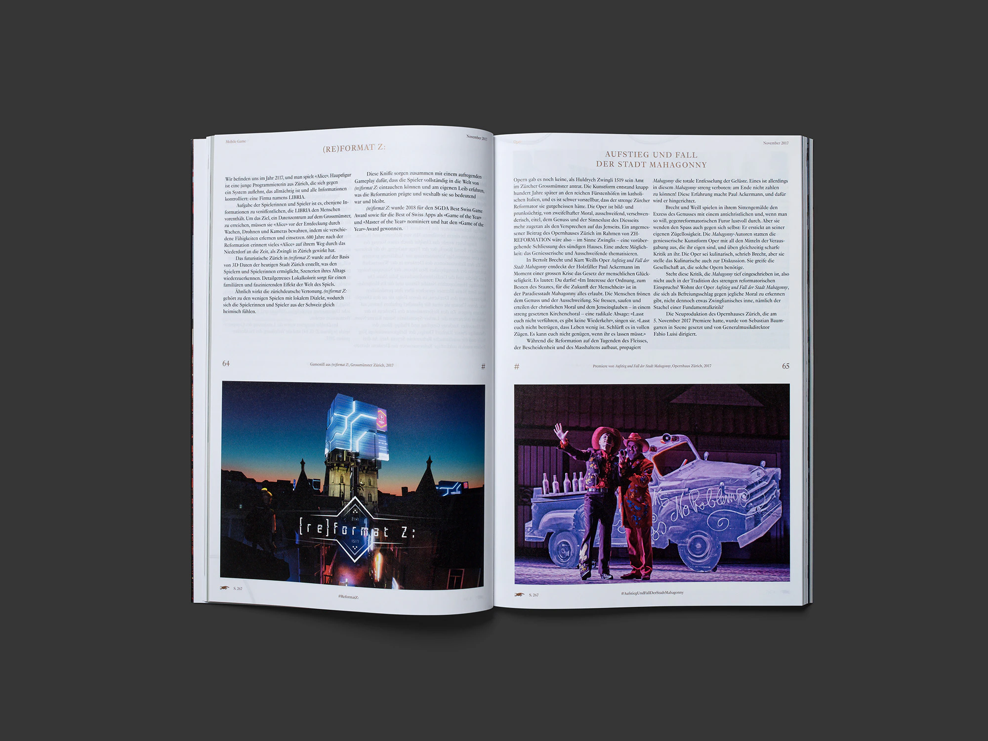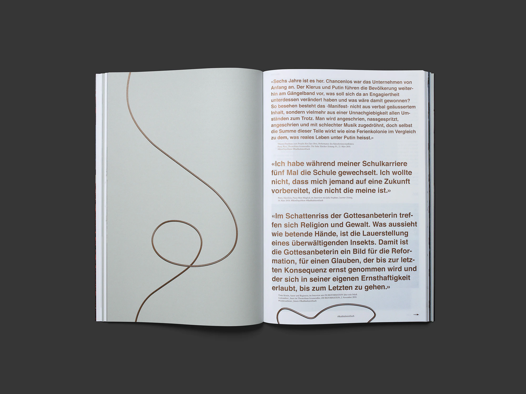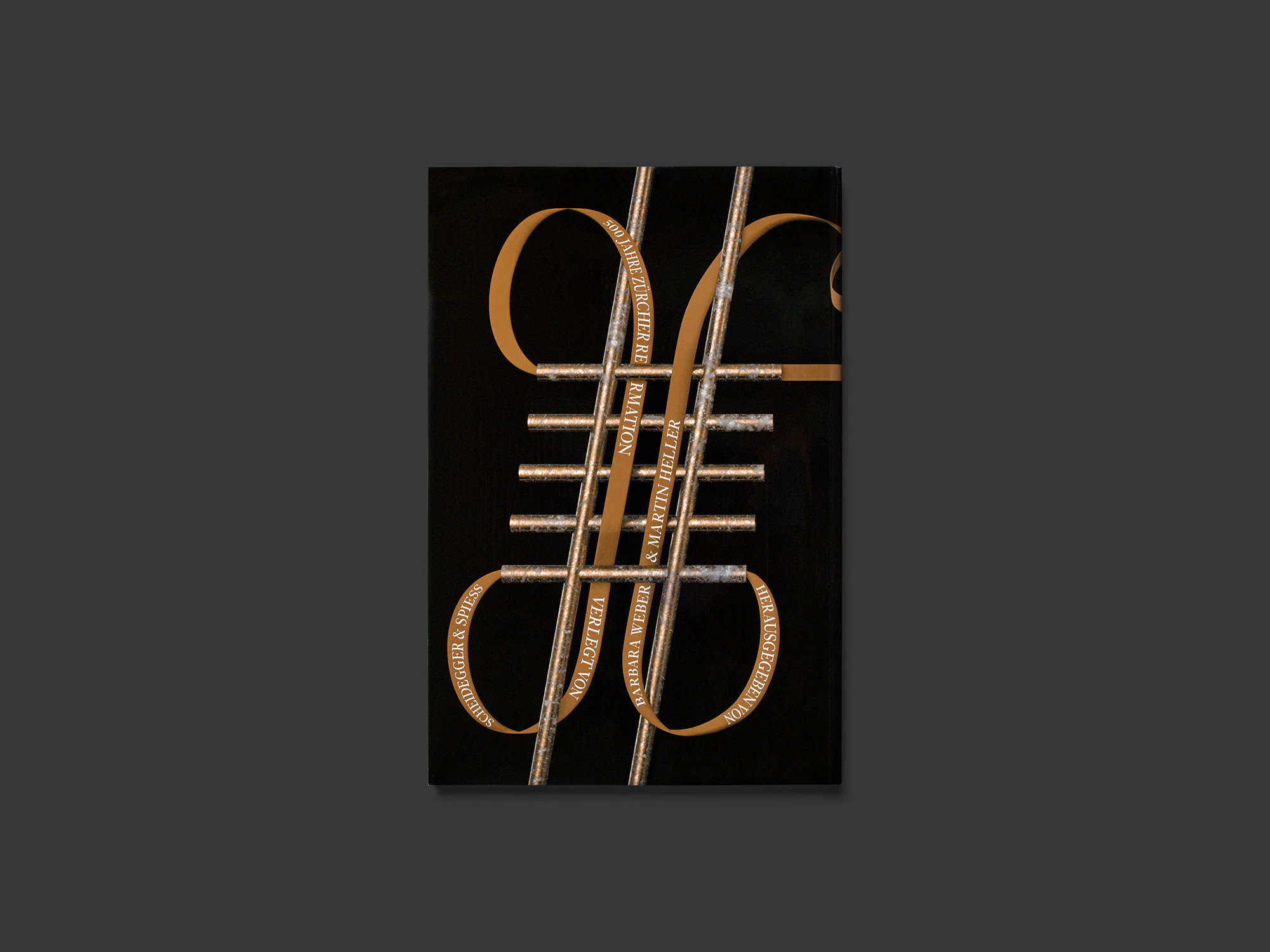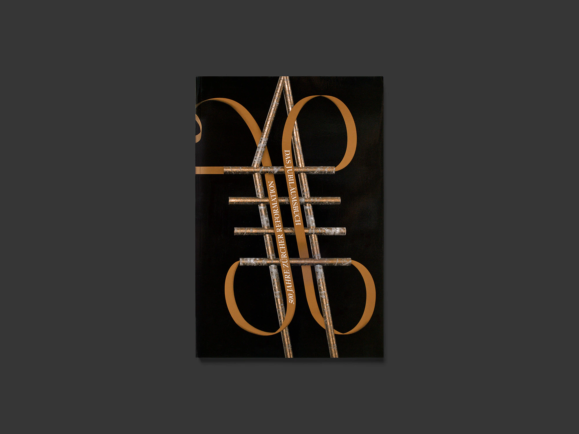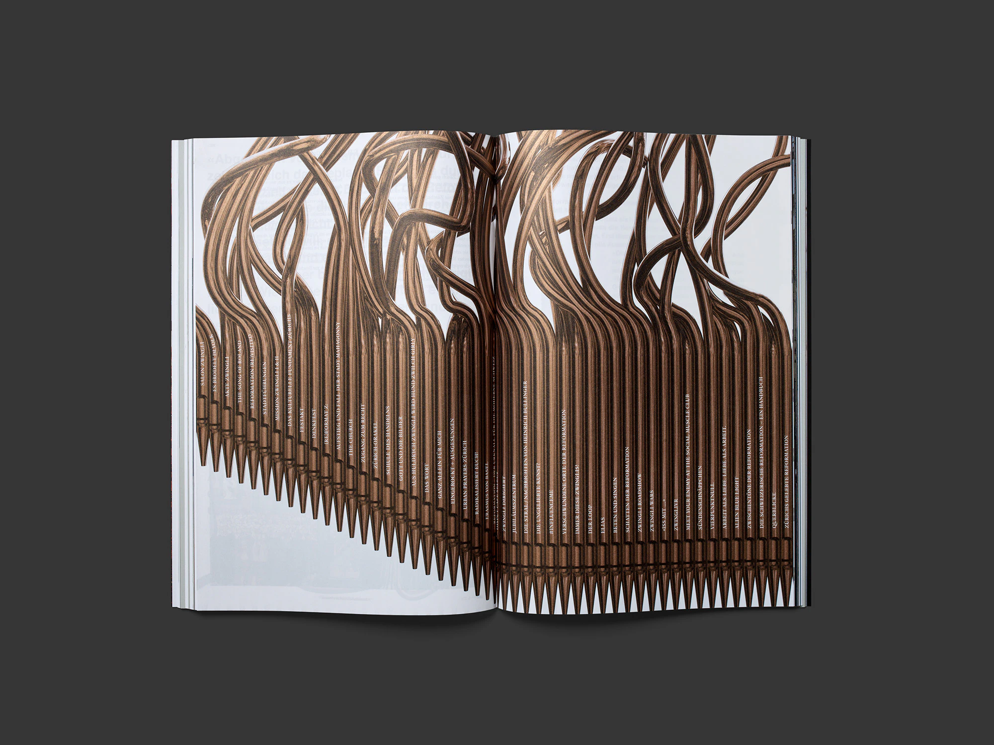 The design of this medium-format brochure on Zurich’s Reformation commemorations deploys a dazzling variety of unconventional stylistic resources that reflect the diversity of the 18-month event series and subvert the aesthetic dichotomy of ‘beautiful’ and ‘ugly’. While the pictorial and textual documentation on the individual events is presented in a uniform two-column layout, it is interspersed with essay sections (on grey paper), full-bleed photo series (featuring subjects such as church interiors) and various graphic representations of the events and the history of the Reformed Church in Zurich. The use of two colours – black and copper – for the cover, texts, graphics and some of the photos lends a degree of continuity. A recurring ornament suggestive of a copper wire runs like the proverbial thread through the book. The various collage and rendering techniques employed for the graphic elements are especially striking. The black-and-copper cover with its singular ornament is among the best of the year.