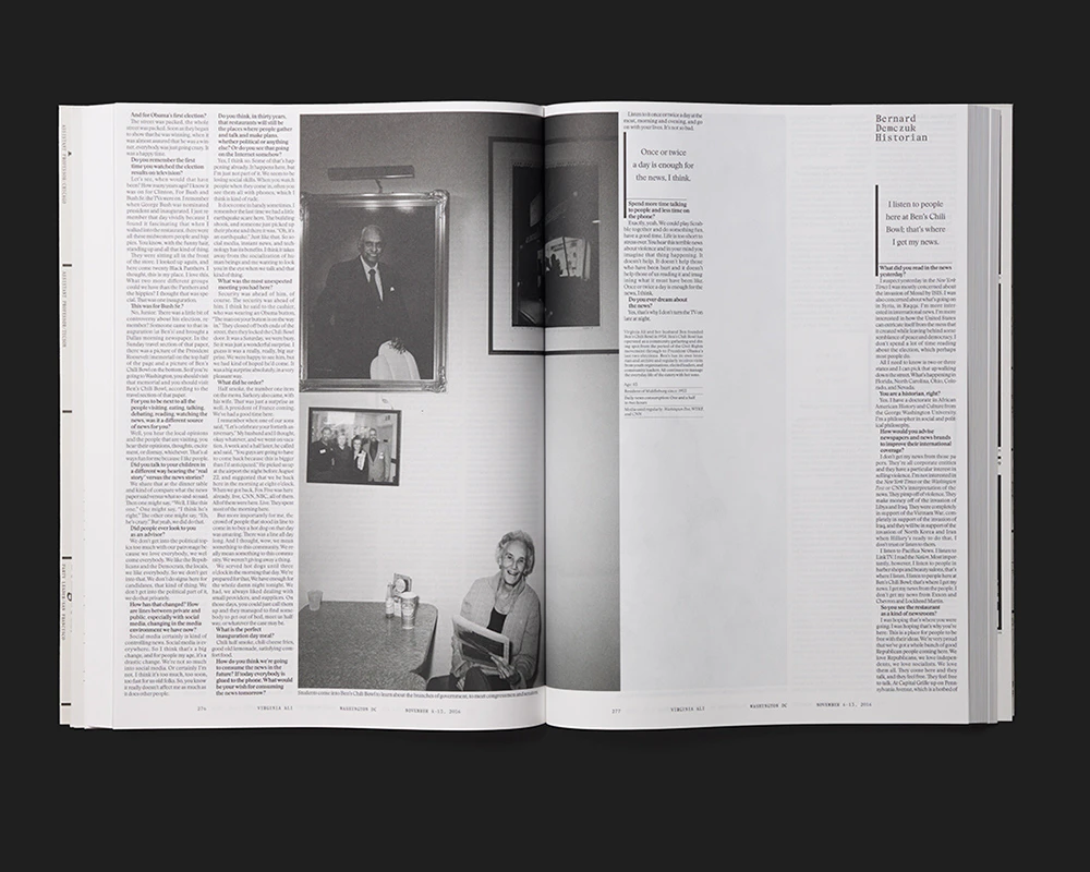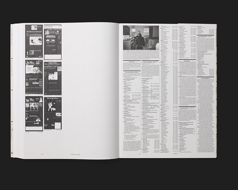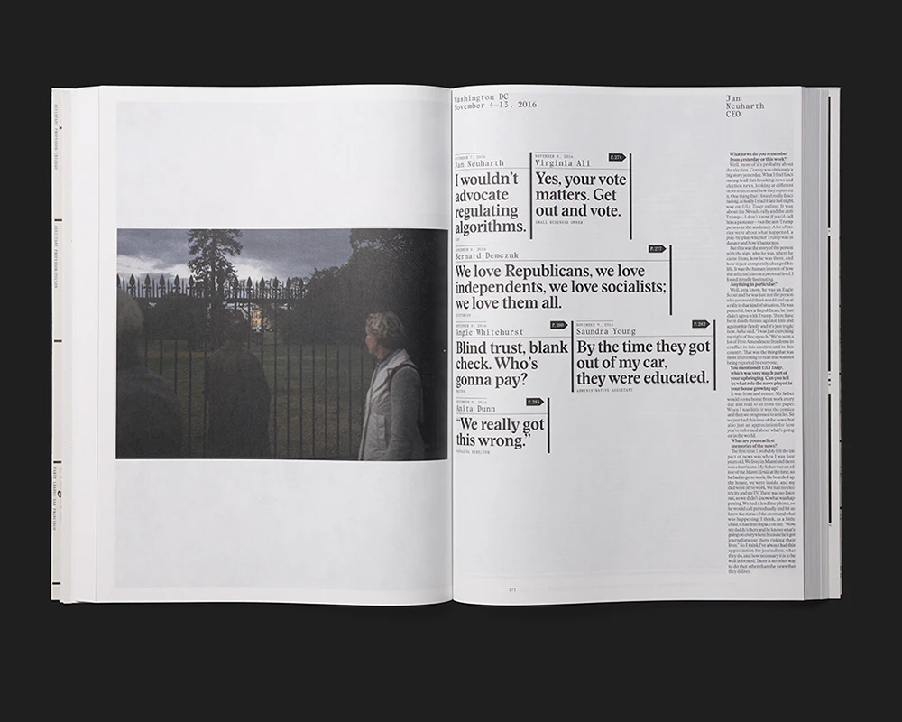 A large volume of reportage presenting photographs of a trip to America alongside interviews with newspaper readers conveys a greatly expanded conception of graphic design as information transmission. The designer is responsible for every level of information in the book, from the interviews and photographs to the typeface and layouts. The material was gathered on a trip undertaken during the presidential election campaign in autumn 2016, and the book is divided into around 20 chapters on individual cities. Each contains large colour photos of the city as well as interviews with people who live there discussing the newspapers they read and their perception of the media landscape. The five-column text is interspersed with large black-and-white portrait photographs of the interviewees in variable heights spread across a number of columns to leave white spaces. Parts of the material were previously available online, but here the book design emphasises the linearity and prescribed viewpoint of the print medium. The folded dust jacket in newspaper format, the very thin paper and the small serif font transpose features of the newspaper medium into the book. reprennent les caractéristiques formelles du support journal.