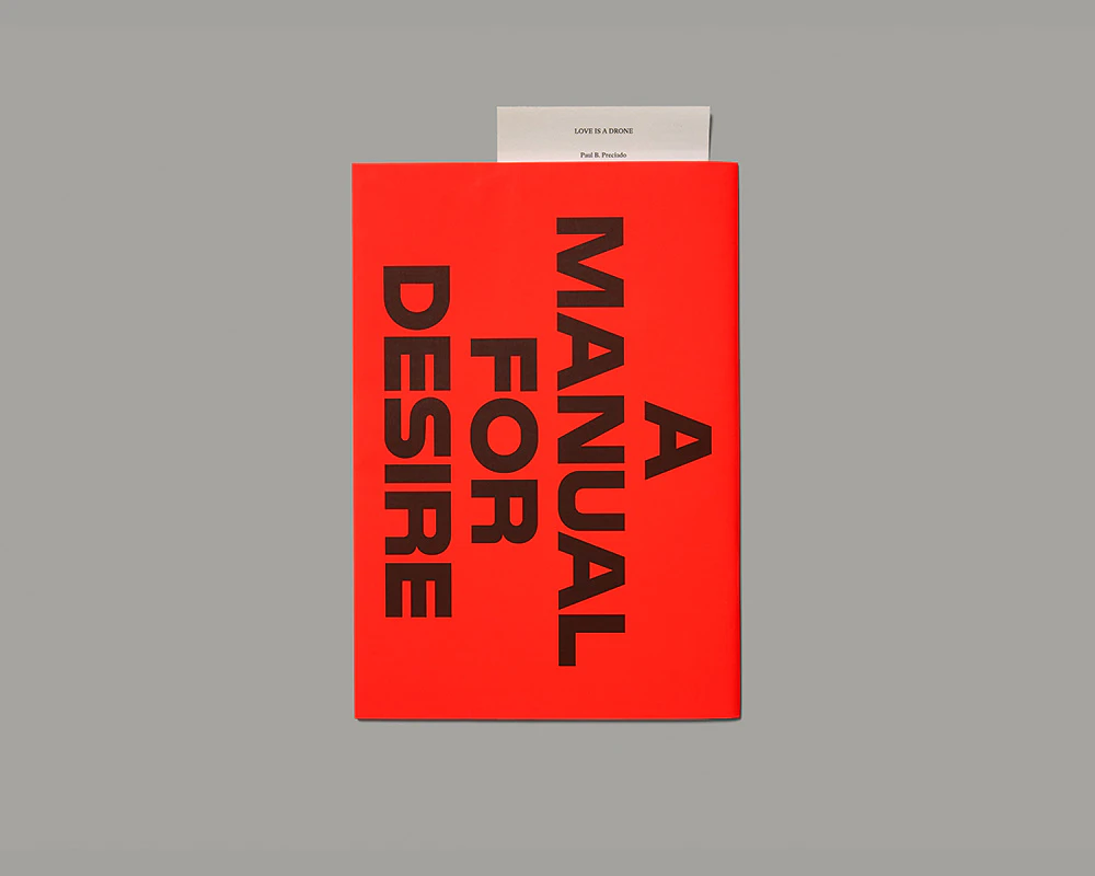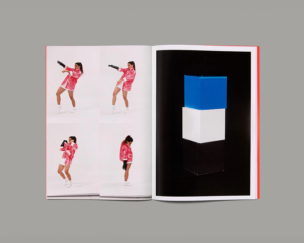 Performance artist Alexandra Bachzetsis and designer Julia Born present a slender, highly distinctive book with an orange dust jacket that investigates the importance of gestures for social identities and gender roles. Although it was produced to accompany an exhibition and relates to a performance, it creates an impression of novelty by specifically adapting individual components of the work to the book medium. On thin pages telegrammatic stage directions run across the orange rectos in large letters, from top to bottom, while on the white versos short statements from participants in the drag-queen documentary Paris is Burning appear in a second, smaller typeface. On a different, high-gloss paper, full-bleed portraits of Bachzetsis’s performers in unconventional poses, each on a single or double page, alternate with somewhat smaller photographs of individual objects, some of which reappear in the hands or on the bodies of the performers. The simple interleaving of the pages weaves the two levels of text and two levels of images together into a dramaturgy of different voices and gestures. An introduction by gender philosopher Paul P. Preciado and a detailed colophon supply contextual information, while a long insert, folded over a number of times and with circular perforations, displays an automatic poem by Preciado.