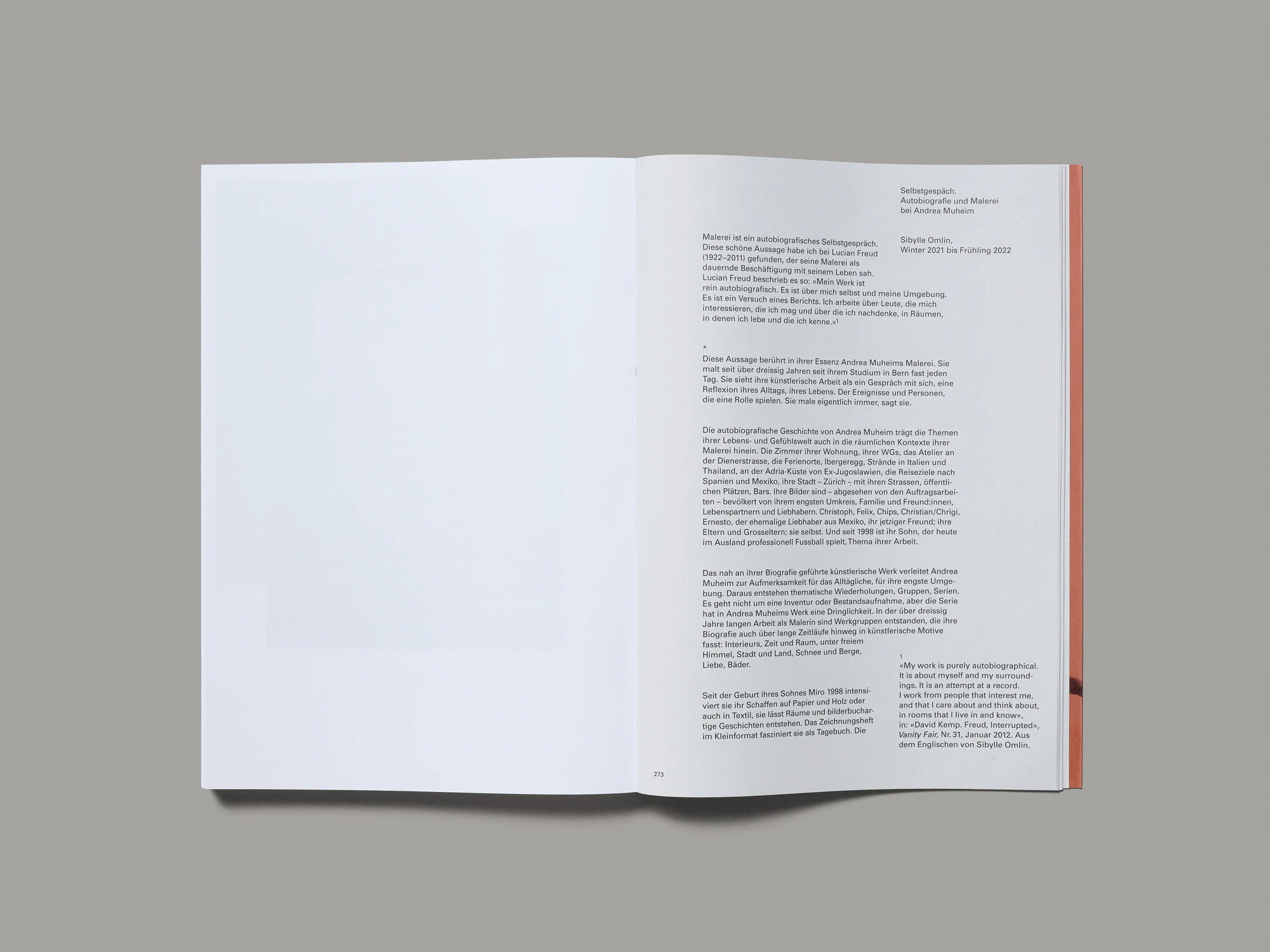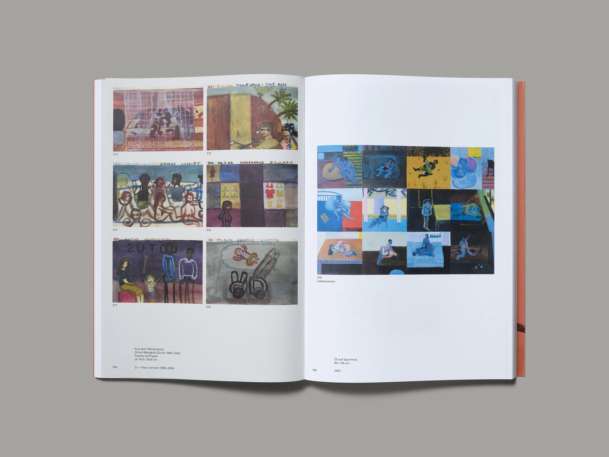 Beneath its softcover and salmon-pink dust jacket, this catalogue of works presents more than 800 paintings by Zurich artist Andrea Muheim. Its greatest design achievement lies in the extensive and innovative picture editing. The works are minimally labelled by title and ordered by year; however, within each year they are freely assembled by theme, in varying sizes and layouts, with between 1 and 15 paintings per page. Sometimes the book comes across like a graphic novel, while at other times it is reminiscent of a typologically arranged photo book or an iPhone photo gallery. As Muheim predominantly paints herself and her surroundings, it is possible to track certain characters and locations over the decades. Diary-like insights open up, and the titles of the works start to combine to tell stories. It takes a little while to become immersed, but as soon as the manifold connections between the paintings emerge, they facilitate a unique reading of a life and oeuvre. The fact that hardly any of the paintings stand alone and many are only reproduced in small form reveals the strong faith that the artist has in the design. The extensive technical information on all the works can be found in an index which, together with an art-historical essay, forms the final section of the book.