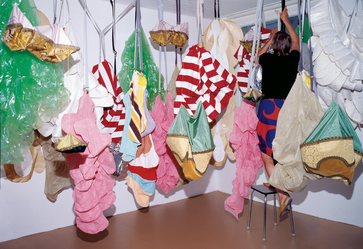 Who doesn't play with the idea of changing the shape of his or her body from time to time? Making it look completely different, just temporarily? The textile designer Andrea Vogel has developed a series of elements for her 'Anschnallen' (Fasten it) collection and intends to see them tried out as a kind of experimental device for the body. They are fabric units intended to be fastened on to the body in an unusual way, using braces. The designer plans to try these add-on elements out on the public. She wonders what would happen if an Appenzell mountain farmer, for example, were to try some of these items on. We don't know either, but one thing is certain: anyone who takes part in this 'work in progress' will certainly find their body is not decently covered.