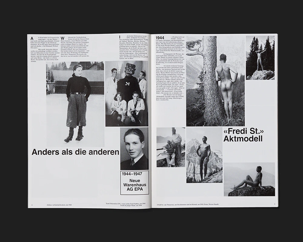 A volume packed with historical images looks back at the life and work of Bernese decorator, dandy and jet-setter ‘Bob’ Steffen (1928–2012). Taking its cue from the topic and era, its design attempts a reappraisal of magazine typology in conjunction with 1960s Swiss design. Magazine sections such as the editorial, the illustrated essay and the photo gallery are presented in grid layouts with an adapted Helvetica as title font. With up to 12 photos per double page, varying sizes, formats and positionings, and large areas of white space, the book offers up a series of constantly changing, invariably interesting combinations of image and text. Freely positioned titles and plentiful, identically sized cross-headings add extra variation. The photo galleries are often full-bleed on both sides of the double page, though sometimes with a white margin at the bottom. The impression is perhaps of a lost formal language rediscovered, perhaps of a facsimile of a fictional magazine from fifty years ago.