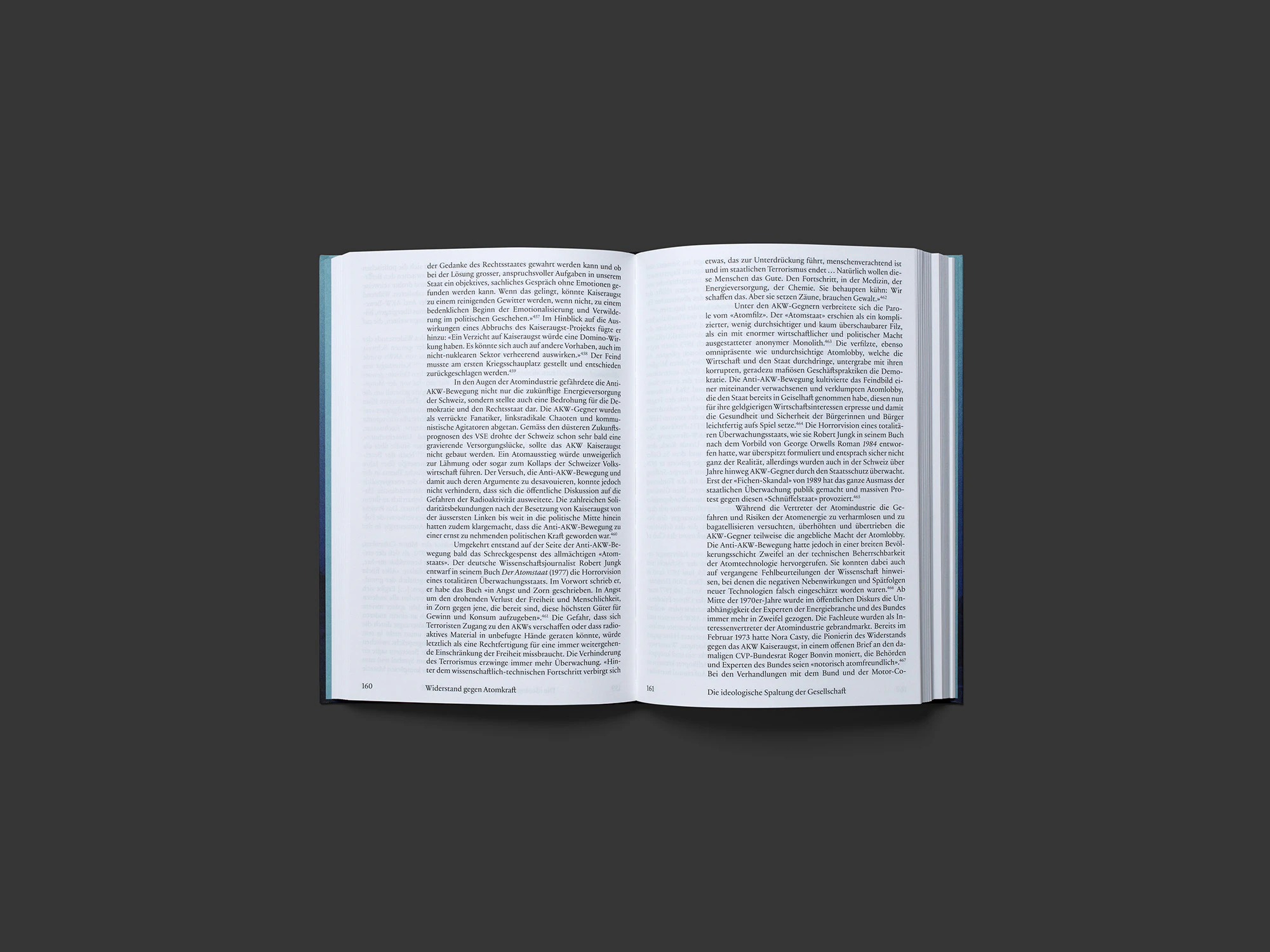 This extensive study of the history of Swiss nuclear power is as attractive as it is accessible thanks to some spot-on design decisions. The first section, comprising over 300 pages of text, has an asymmetrical layout with striking proportions that always leaves room for the footnotes in the left hand margin. All text elements – including the page numbers and page titles at the bottom – are in a uniform font and size. Only the individual pages with chapter titles employ a second, larger typeface and a two-column layout that is also used on the cover – here printed on top of a photograph of a cooling tower at dusk extending across the back. The second section of the book comprises three dozen pictures arranged chronologically, each in isolation and aligned with the page edge at top left, with detailed captions beneath. The result is a layout that is pared down and easy to navigate and creates a very attractive overall impression. This is a successful example of the commendable practice of a publisher whose declared aim is to archive Swiss contemporary history in book form.