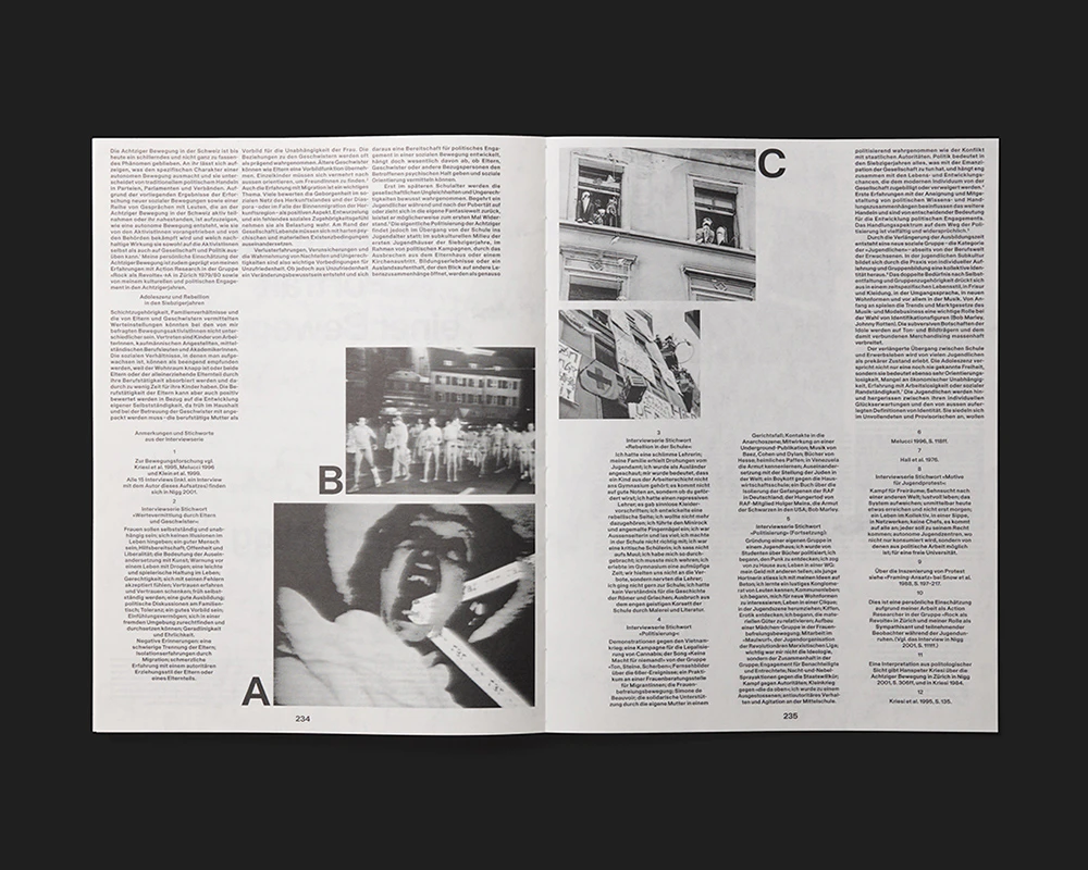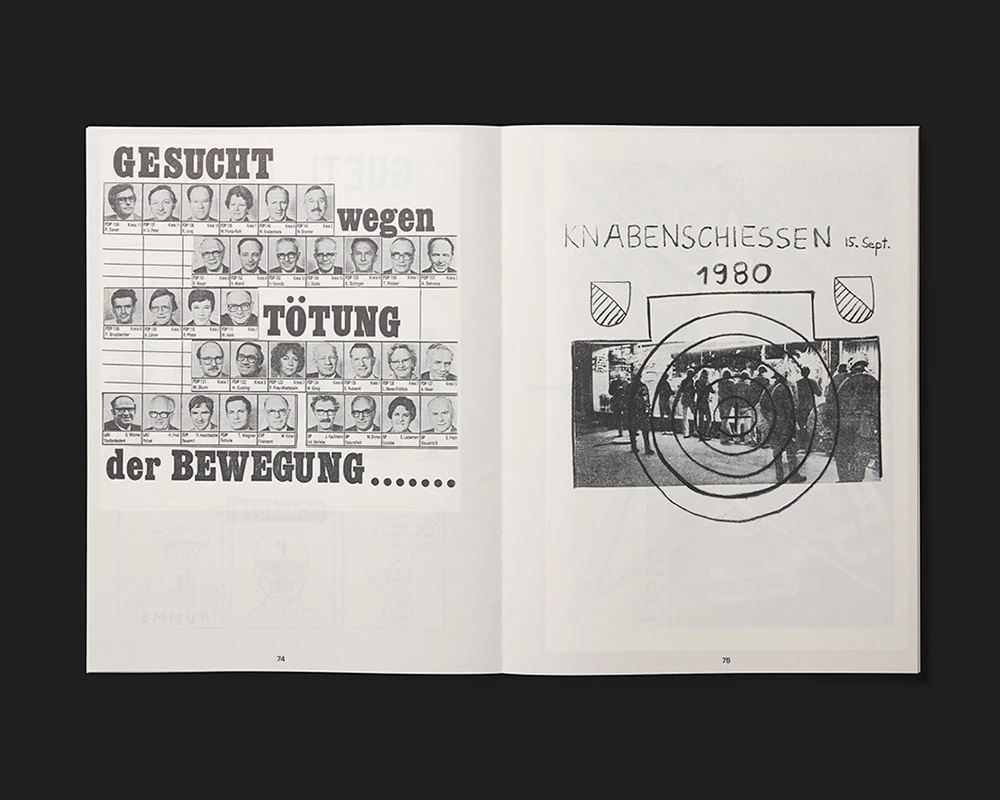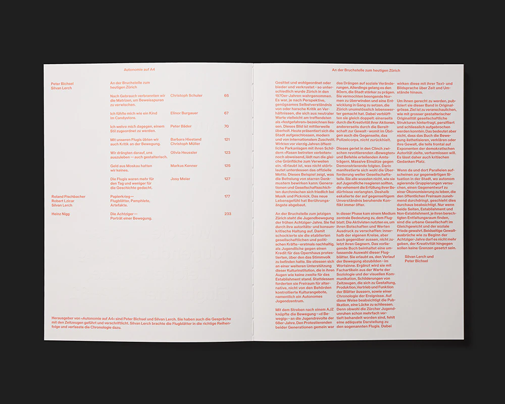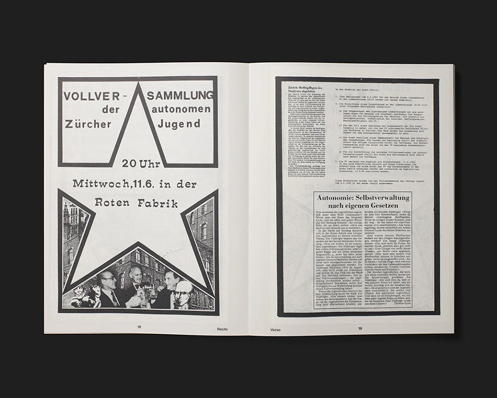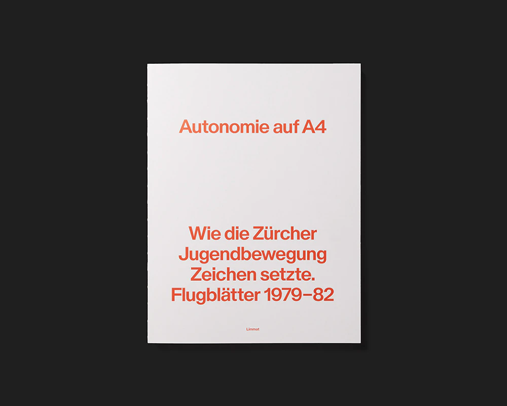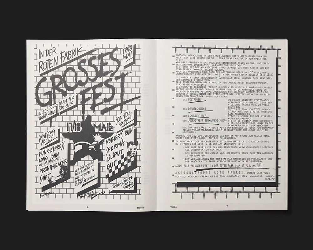 An archival book on flyers from Zurich’s youth movement gives the historical material a powerful presence using a small number of design interventions. The black texts and drawings on the A4 pages are printed in original size on a triple-white base which leaves a narrow margin around the pages. Where a flyer was printed on both sides, this is transposed to the front and reverse of a page in the book. Free pages contain brief chronological entries on city politics and the youth movement in which symmetrically typeset dates and explanations in upper case reinforce the design atmosphere of the flyers. The effect is of an artfully edited stack of individual sheets, and this impression is reinforced by the book’s open binding and the fact that further texts are relocated to separate sheets: the table of contents, introduction, and so on appear in red on the cover, which consists of two sheets of firm paper at front and back. Essays are inserted at regular intervals between the reproduced flyers on a discreetly marbled paper. Everything is tightly controlled.