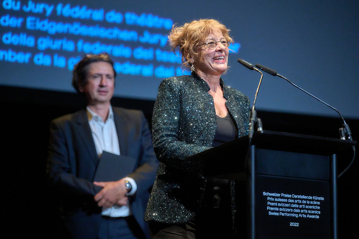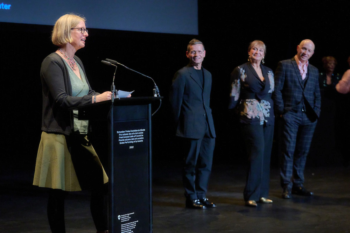 In the presence of Federal Councillor Alain Berset, the Federal Office of Culture awarded the Swiss Performing Arts Awards for the second time on 21 October 2022 at the newly built Théâtre de Carouge. The Swiss Grand Award for the Performing Arts / Hans Reinhart Ring 2022 went to director and artistic director Barbara Frey. Other prizes received Frida León Beraud, Marco Berrettini, Sophie Gardaz, Geschwister Pfister, Paola Gianoli, Yann Marussich, Mike Müller, Susanne Schneider/BewegGrund, Ticino is Burning, "La Peau de l'Espace" by Yasmine Hugonnet, "Manuel d'exil" by Maya Bösch and the collective InQdrt.