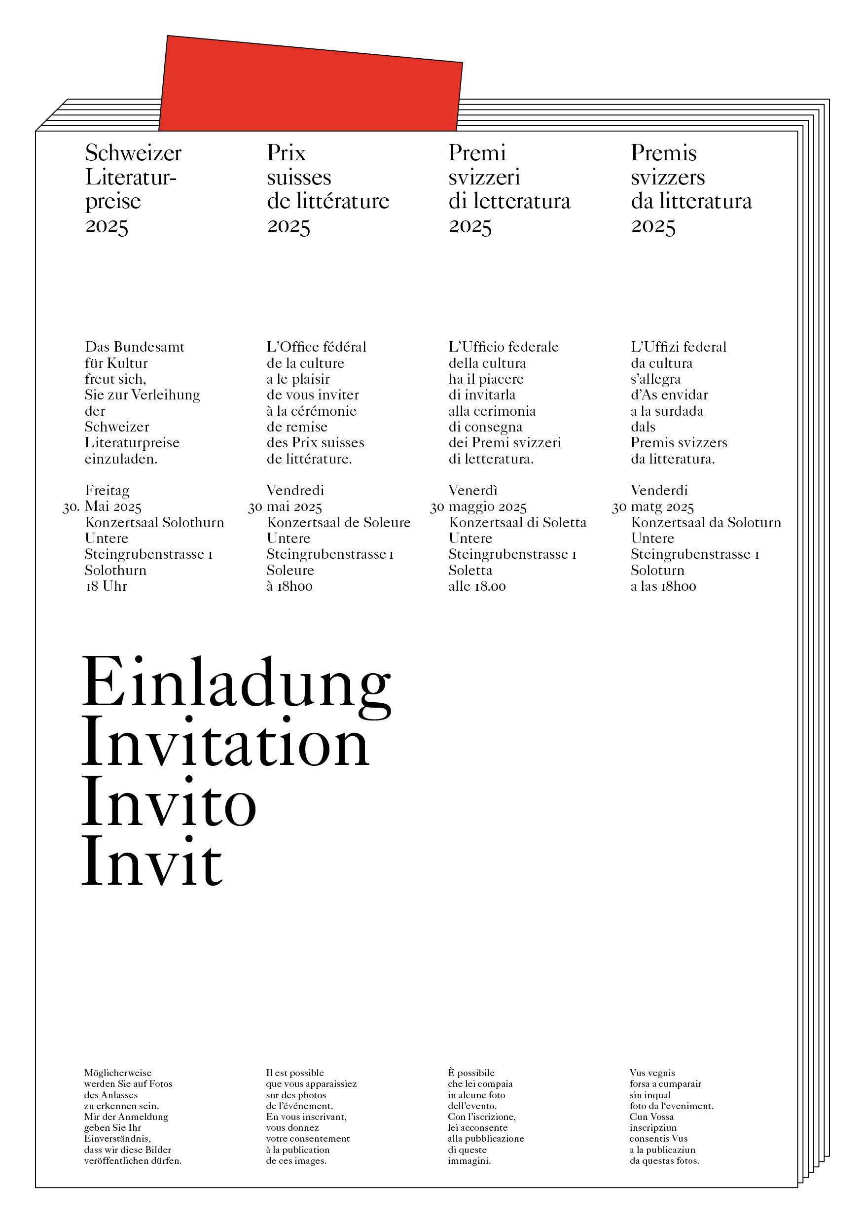 The twelfth Swiss Literature Prize ceremony took place on May 30, 2025, as part of the Solothurn Literature Days at the Concert Hall of Solothurn, in the presence of Federal Councillor Elisabeth Baume-Schneider.