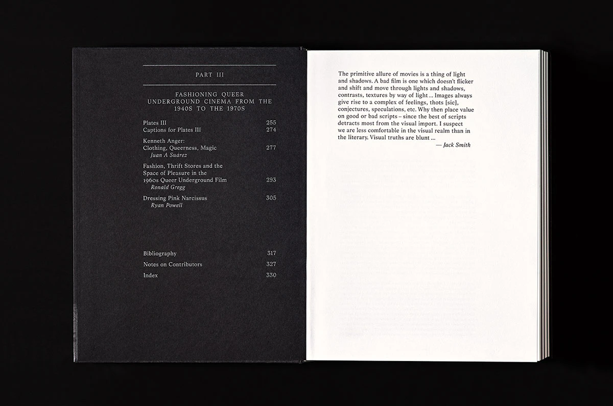 The design of this scholarly anthology on opulent film costumes from 1900 to 1960 skilfully transfers the subject of spectacular costume into the medium of the book. In three image sections, each introducing a group of thematic essays, monochrome and colour film stills are printed using silver on black paper. The effect is astonishing and almost magical and goes far beyond mere picture reproduction. Without being nostalgic, it recalls early film screenings in which the light was projected through the dark room onto a silver-coated screen. At the same time, it gives the volume a glamorous and sombre atmosphere that is particularly appropriate for the ‘underground queer cinema’ scene circa 1960 treated in the third section. The text sections have a calm design, and skilful placement of small-format film stills provides optimal support for the reading material. All of this helps to make the volume with its dense content both accessible and eminently readable throughout.