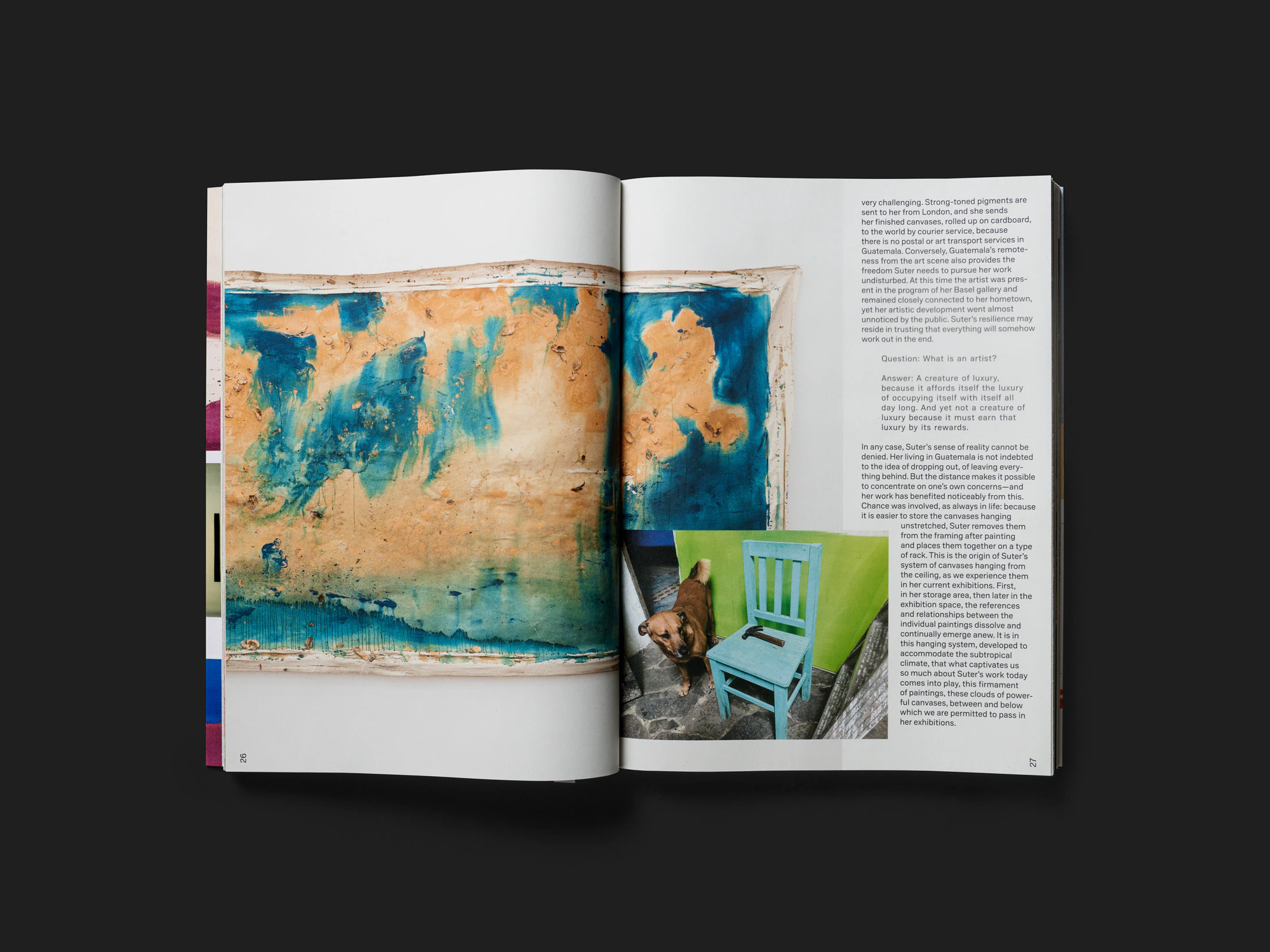 The exhibition catalogue from the Kunstmuseum Luzern transposes the artistic method of Vivian Suter into a highly individual book by means of some unconventional design choices. A folded softcover, thin paper and a Japanese binding render the object soft and pliable, in a nod to the canvases that Suter hangs freely in space. The layouts often change from page to page, with variable indents for individual blocks of text, mirroring Suter’s often random compositions of abstract forms. The suspended canvases are presented as silhouetted illustrations in the book, in most cases singly on a page; consequently, there are no exact rectangles but rather a succession of slightly varying formats. Suter’s works on paper are also presented in isolation, often at a very slight angle as if laid on the page by hand. The overall effect is very dynamic and free, and one is constantly aware that the chosen arrangement and presentation could just as well have been different. Rather than constraining the artistic oeuvre within a design system, the volume challenges established hierarchies of book design but without making a programmatic statement, as the interventions always take place directly in practice.