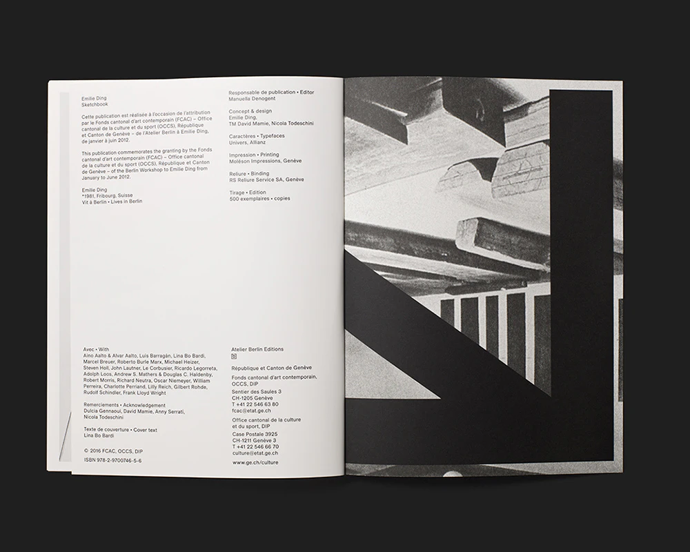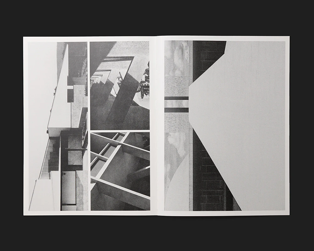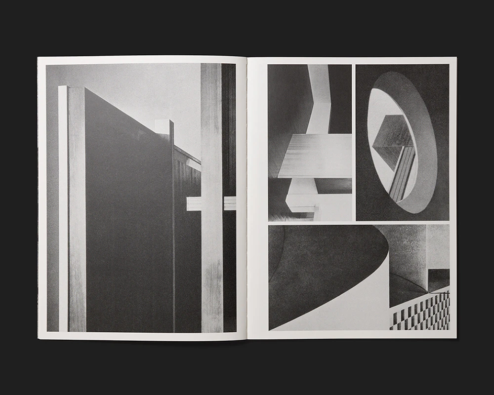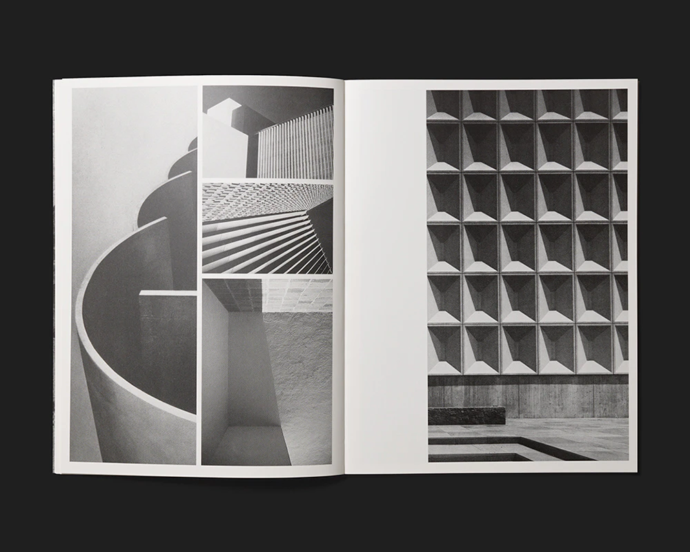 A slender, medium-format artist’s book by the Swiss Émilie Ding offers an indirect but enlightening insight into her work. Rather than her abstract concrete sculptures or geometrically patterned black-and-white paintings, Ding here presents black-and-white photos of Brutalist concrete architecture arranged to fill each page. Between two and four illustrations of varying sizes and formats are positioned on each page to leave narrow white margins between and around them. Adept formal deployment of cropped details and alternating perspectives creates a unique picture space that is sometimes reminiscent of abstract paintings and sometimes has elements of the three-dimensional and sculptural. The work can thus be seen as an agreeably unpretentious artist’s sketchbook. The text is pared down to the essentials: apart from the unconventional five-line title creating an aura of mystery in the top left-hand corner of the white front cover, the only other text is the colophon on the book’s last page.