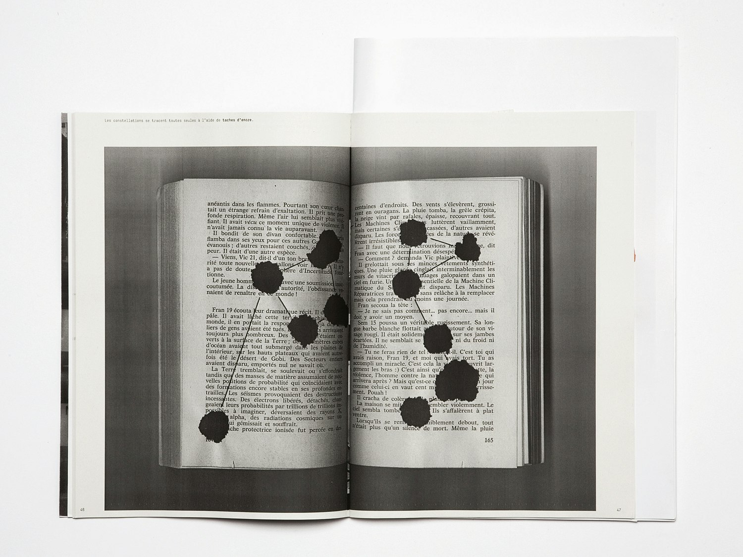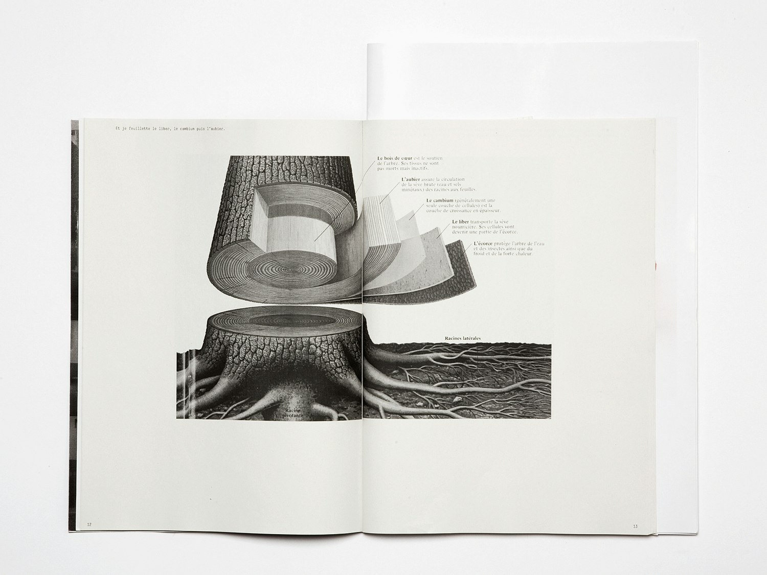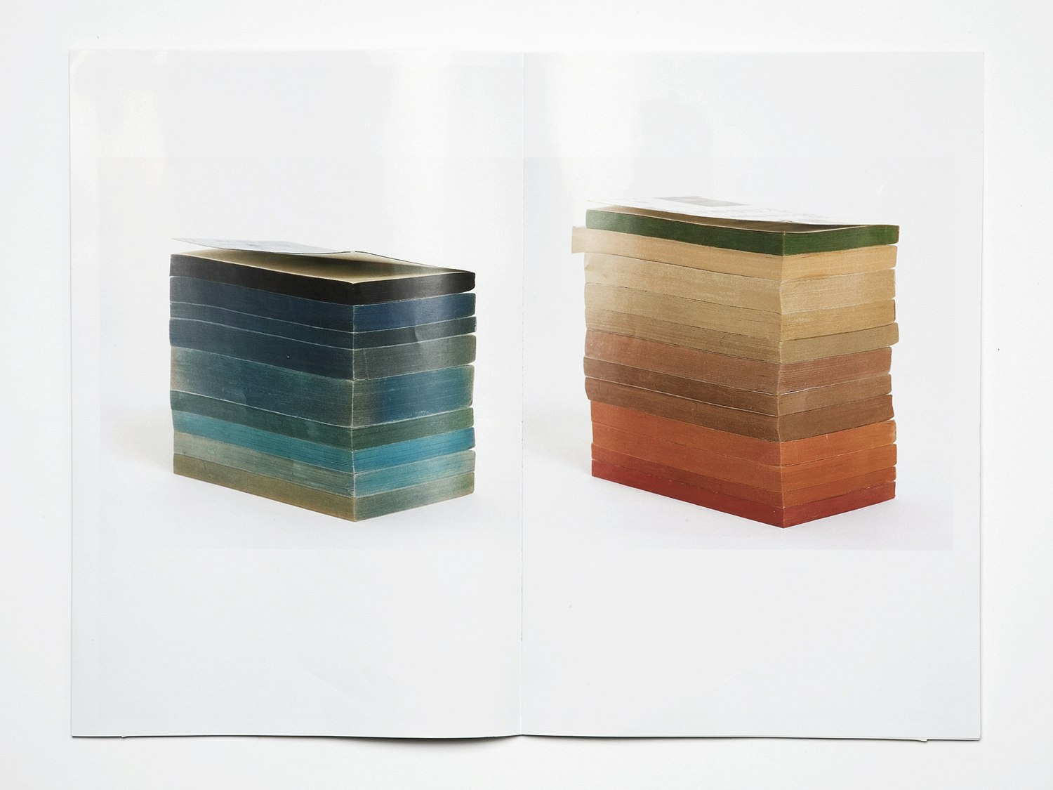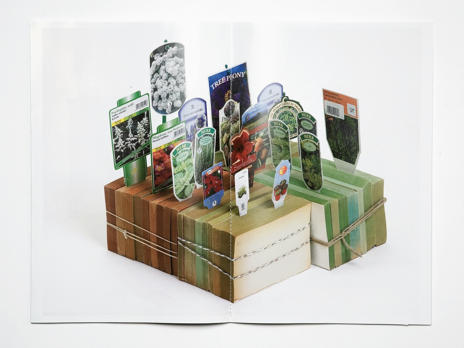 What have graphic design and entomology in common? Graphic artist and insect collector Camille Sauthier asked himself this question. Are there parallels in the two passions? He was struck by the fact that both the boxes he kept his insects in and the program background for 'InDesign' feature grids. He enjoyed placing elements on both grids. In order to answer his own question he looked for images in both subject areas and compared them. He produced a record of his research in the early part of his book 'Mise en pages. Mise en cage'. This part is in black and white. On a double page, we see a photograph of the spine of a book detaching itself from the cover and on the right a photograph of a tree with the bark peeling off. Camille Sauthier shows elements in common at a visual level – these are playful comparisons. The graphic designer explains that he tried to design the book like a terrarium, an eco-system, a little thematic world. His reflections and inspirations from research lead on to a colour section of the book. Here we find items from books that Sauthier designed himself. Items that are beautiful but at the same time alienating. An installation, for example, looks like a little flower garden: the designer has pushed little labels that are usually found in beds or pots to give information about the seeds into bundles of books. He explains that here he is comparing the little labels from the plant world with bookmarks, because they are similar to each other. On another double page are two piles of books with coloured pages. One gets bluer and bluer, the other goes from brownish-red to green. The designer says this is a juxtaposition of heaven and earth. We find the key to these objects on the last of the coloured pages. Here we see his object confronted with one from the science that provided his inspiration. Camille Sauthier's work mingles the worlds of his two passions poetically, and thus creates a new one – his own personal world. The switch has been made, the question about common ground answered visually, if not completely resolved scientifically – but who minds about that.