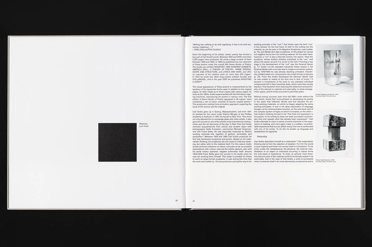 This catalogue of Carl Andre’s poems, produced in collaboration with the Museum zu Allerheiligen in Schaffhausen, is a good example of the way in which book design is capable of developing within the context of a publishing programme. Although the unusual, almost square format and certain design decisions were already present in earlier artists’ monographs published by the company ─ such as the volume on Pierrette Bloch that received an award in last year’s Most Beautiful Swiss Books competition ─ the new book does not look like a mere repetition. It approaches Andre’s material carefully and displays it to its best advantage. Despite the routine, every detail of the design is well considered and confident. The consistent arrangement of two or four illustrations of works on each double-page spread allows optimal integration of varying portrait and landscape formats. The quality of the reproduction is high. The design team works without irony here and does not shy away from elegance. The approach does not have an old-fashioned effect, however; instead, it could be described as a new and quite original classic style.