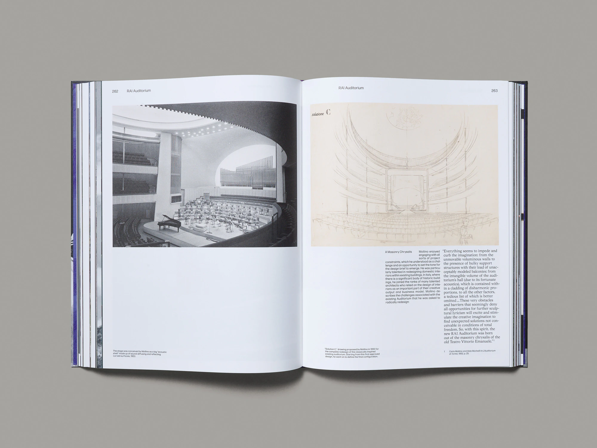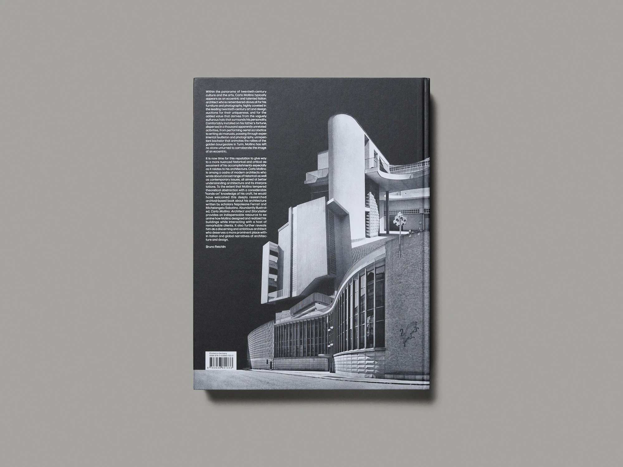 Beneath the black-and-white cover of this coffee-table book on the Italian architect Carlo Mollino (1905–1973) lies an impeccably researched archival publication that has been organised in a very approachable fashion. The biographical introduction and each of the six chapters on the different periods of his work begin with a page containing detailed picture captions. While this might appear puzzling at first glance, that puzzle is resolved by the picture sections which follow, consisting of 10 to 15 full-bleed photographs, that can now be read as a coherent story told through images. The individual projects are then presented chronologically with historical plans, models, photographs and texts, accompanied by brief academic descriptions. The extensive, largely unknown archive material always offers something new to discover, and the well-organised layout features numerous variations. The finely reproduced photographs and the combination of two different typefaces create some noise, but without the volume ever becoming excessive. The excellent rhythm and sequencing creates a dynamic narrative flow, appearing at times to reflect the energetic architectural forms of the photographed buildings.