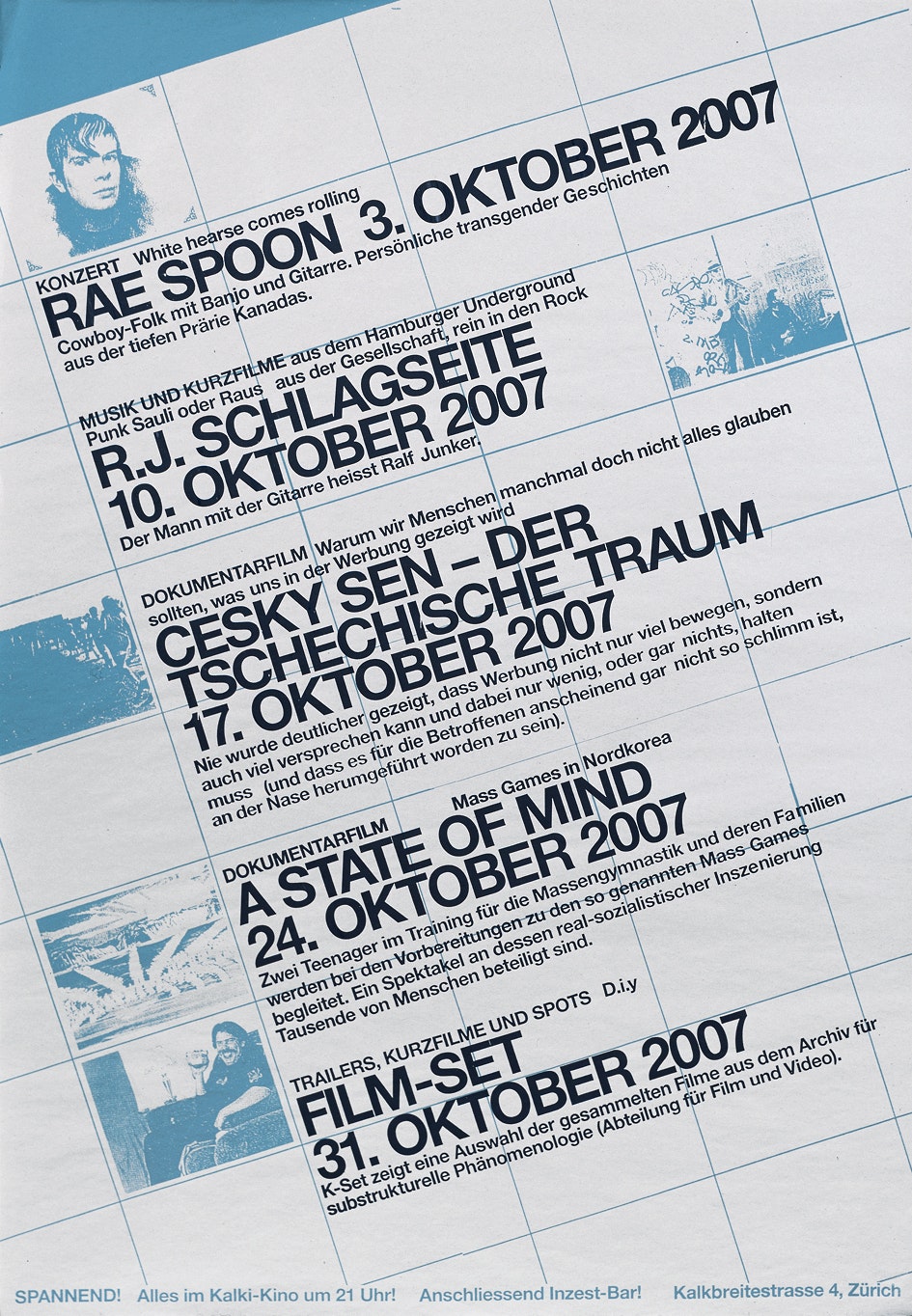It is important for her to know who and what is behind any work that is commissioned, because it is the personality, the music or the style of the client that inspires the composition and expression of her posters. For the poster advertising a concert she enlarged and copied a film still until she had achieved the desired graininess. Although the choice of lettering and structure are fairly classical, she has added a contemporary slant by tinting the text and image of the A2 poster in deep cyan.