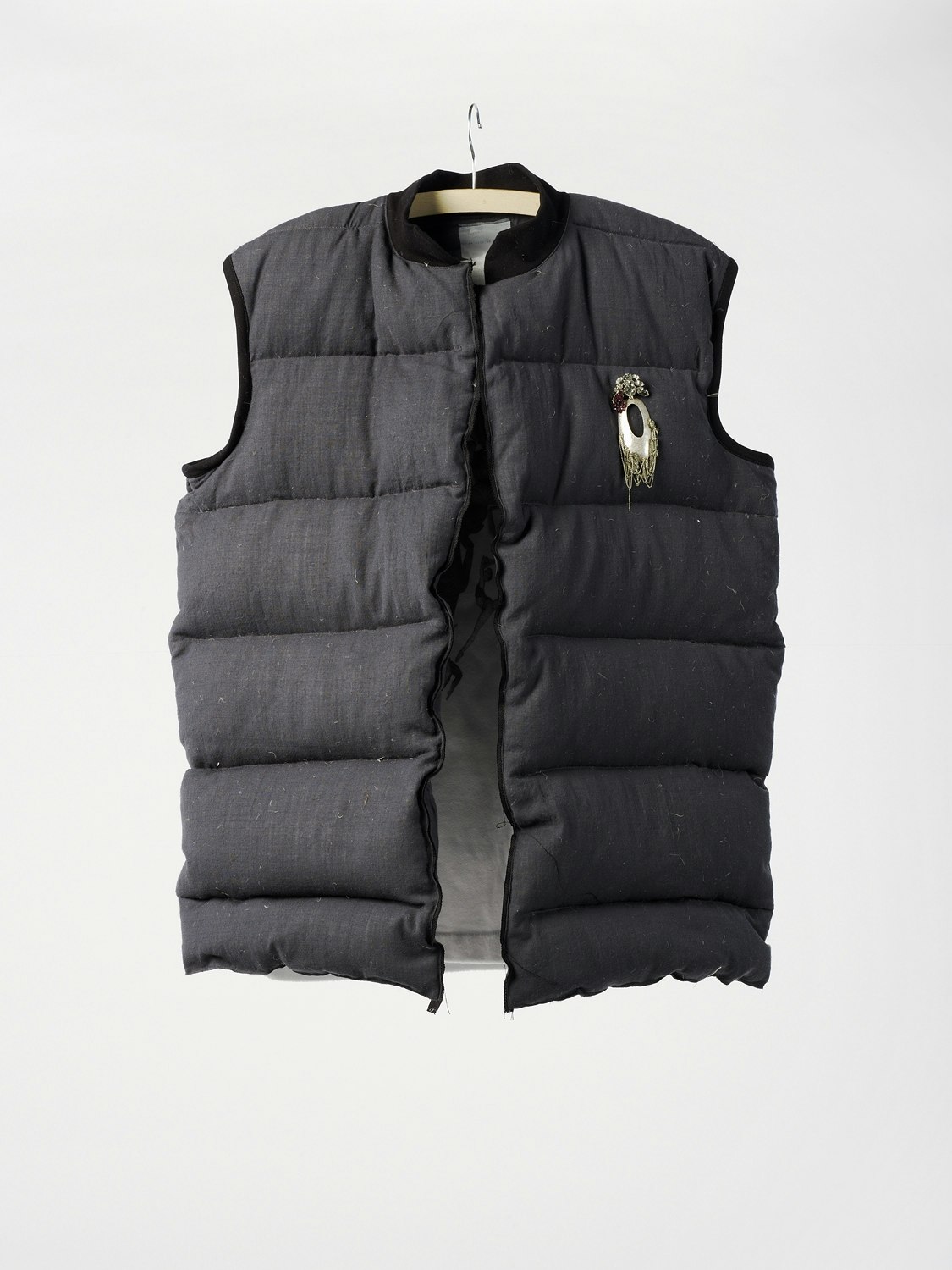 Buehrer's work started with some old items of clothing. She experimented with their form and function: a simple pullover with a third arm sewn onto the chest, a classic blazer buttoned up askew, a sneaker without laces or logos, pared down to the minimum. The outfits are then completed and complemented by unusual accessories: sumptuous feathers gracing a shoulder, or a golden bow adorning a man's neck. Each piece can be playfully mixed and matched with any other piece.