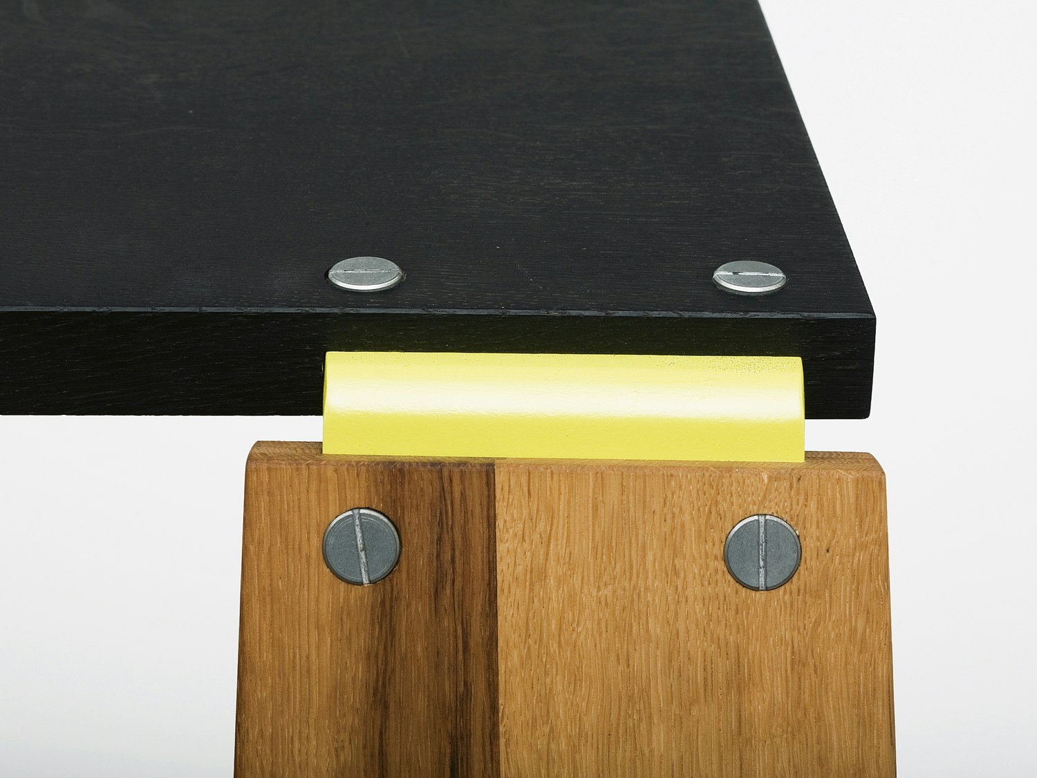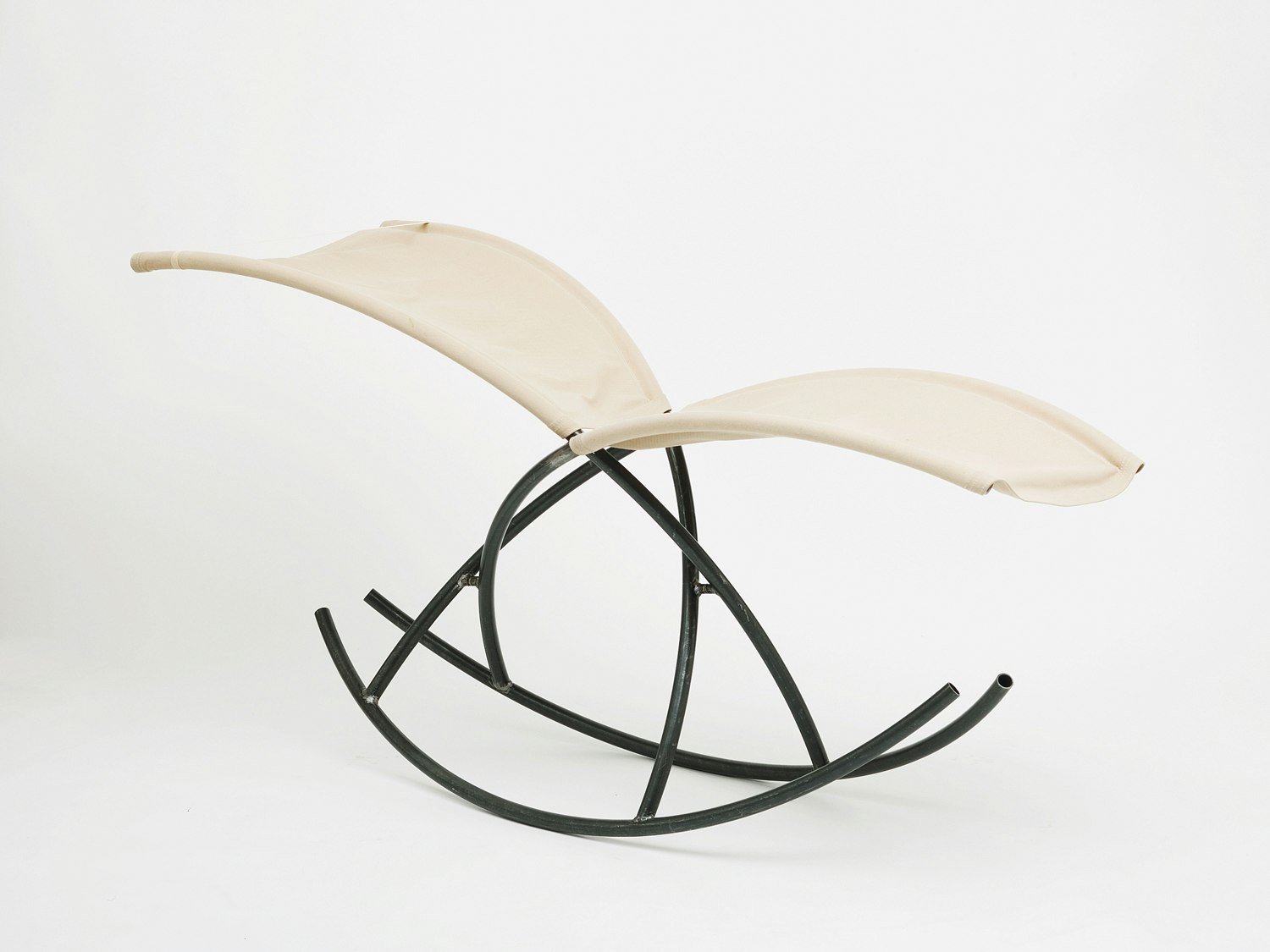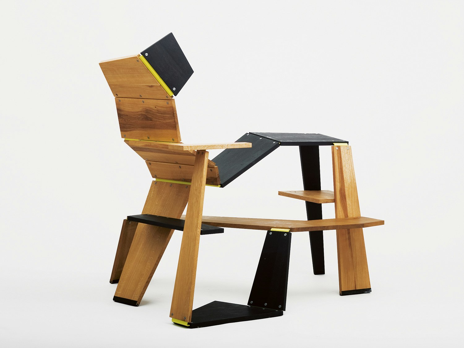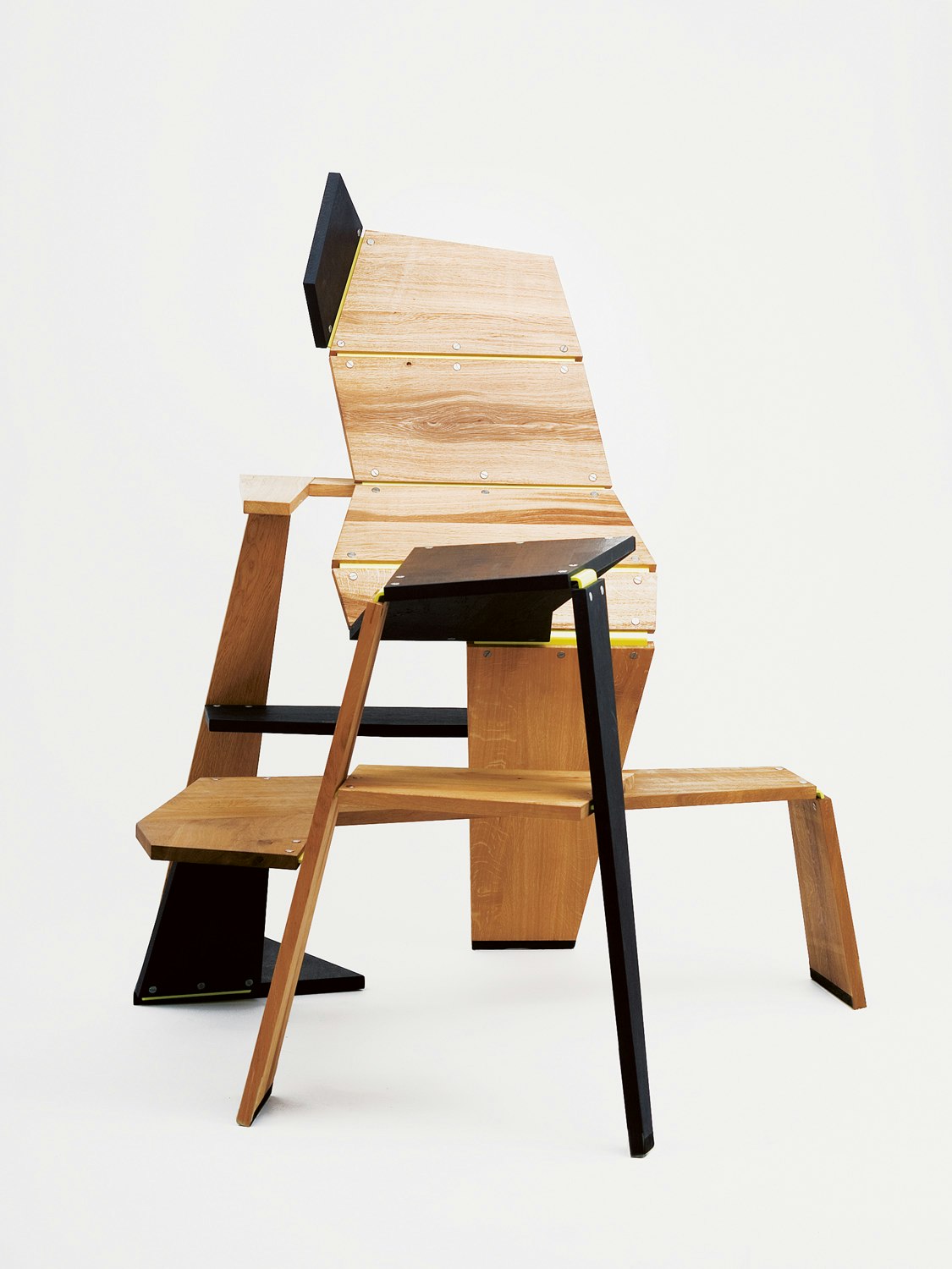 Christian Horisberger's entry for the Swiss Federal Design Competition includes three seats and a lamp. These are functioning models that he has built himself. Grouped together, they look like an installation. The furniture typologies are unusual and the formal language moves away from the furniture industry's usual clear lines. Some of the designs look heavy, rough and angular. The structure is emphasized. For example, the connection plates in the large 'Sitzliege' (literally 'Sitting Lounger') are painted yellow and the screw-heads chosen are large and visible. We have to get used to the objects, and accept their individuality. The jury did not like this furniture immediately, but the independence of their construction and expressive quality, and also the designer's working processes, aroused the experts' interest and enthusiasm as time passed. The most striking item, because it is the largest and most unusual, is the 'Sitzliege'. As its name suggests, this piece of furniture is a structure offering various different possibilities for sitting and lying down. The shape is derived from a variety of strips of wood, angled in various directions. Owners can choose whether to use these surfaces as stands or shelves, as a bench or lounger. The 'Schaukelliege' ('Rocking Lounger') is a folding lounger made of welded tubes bent in various directions. Two axes hold the frame together and make it possible to open the lounger or fold it up. Two fabric-covered sections, one for the back and the other for the legs, form a surface to lie down on, and also stabilize the structure when it is open.