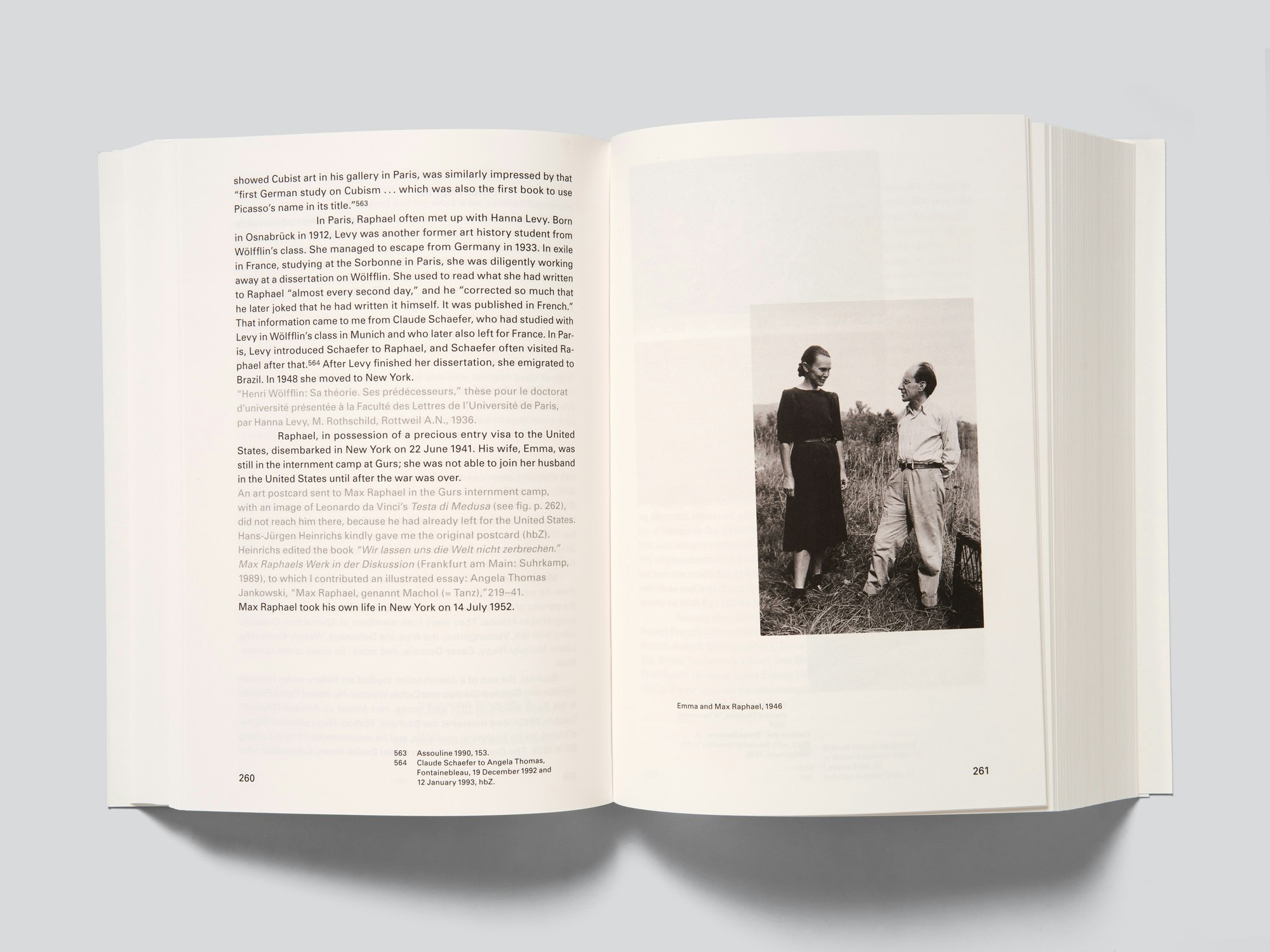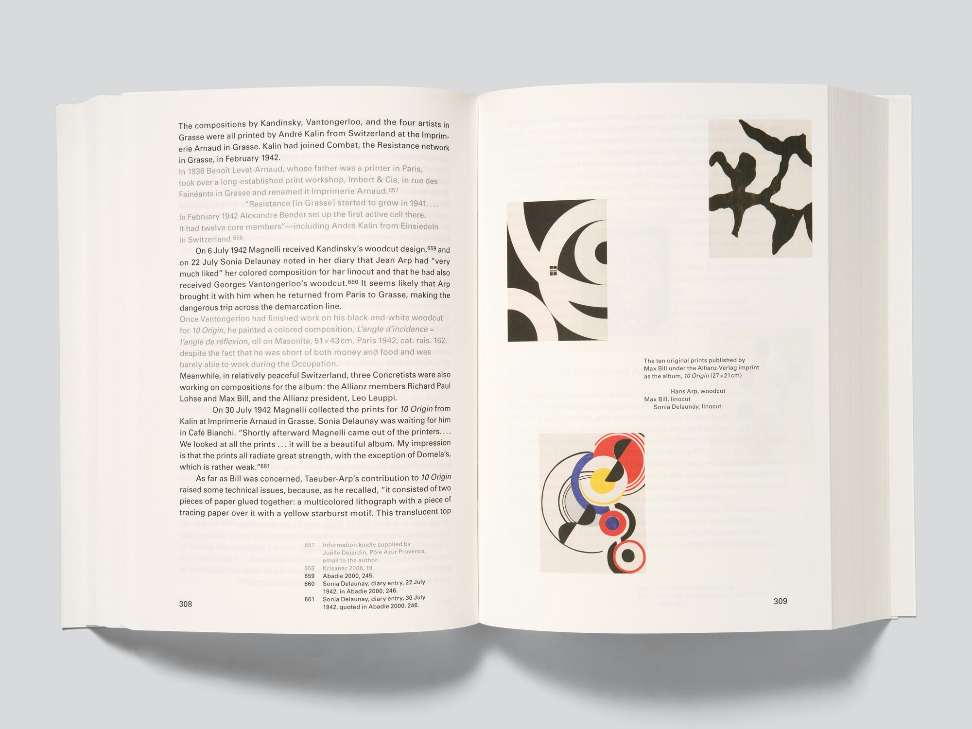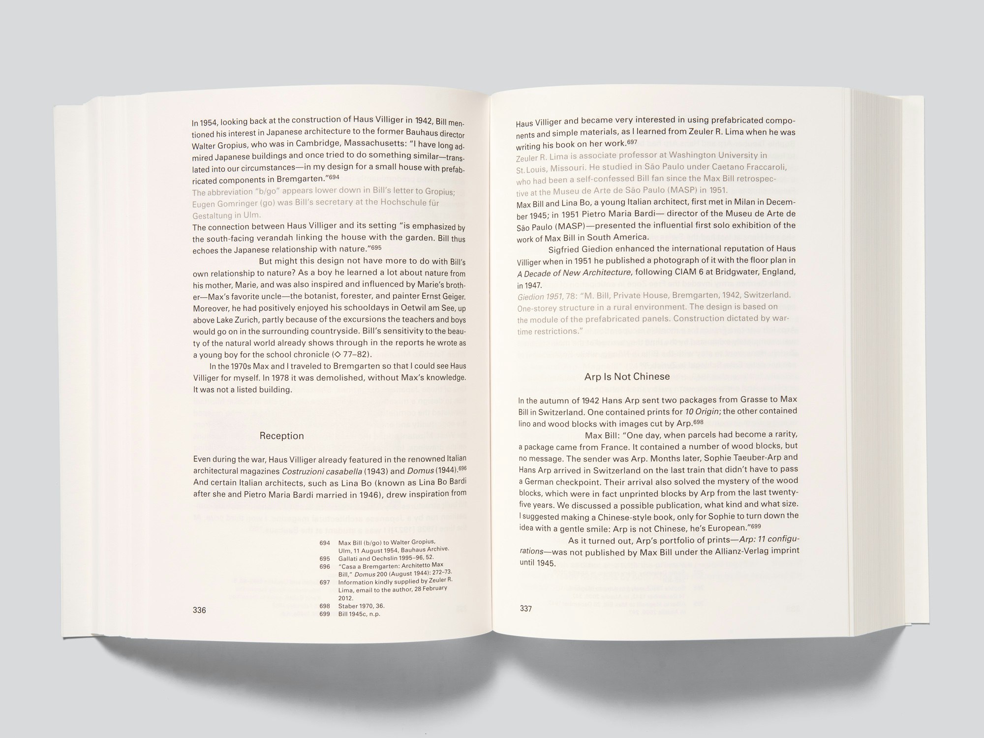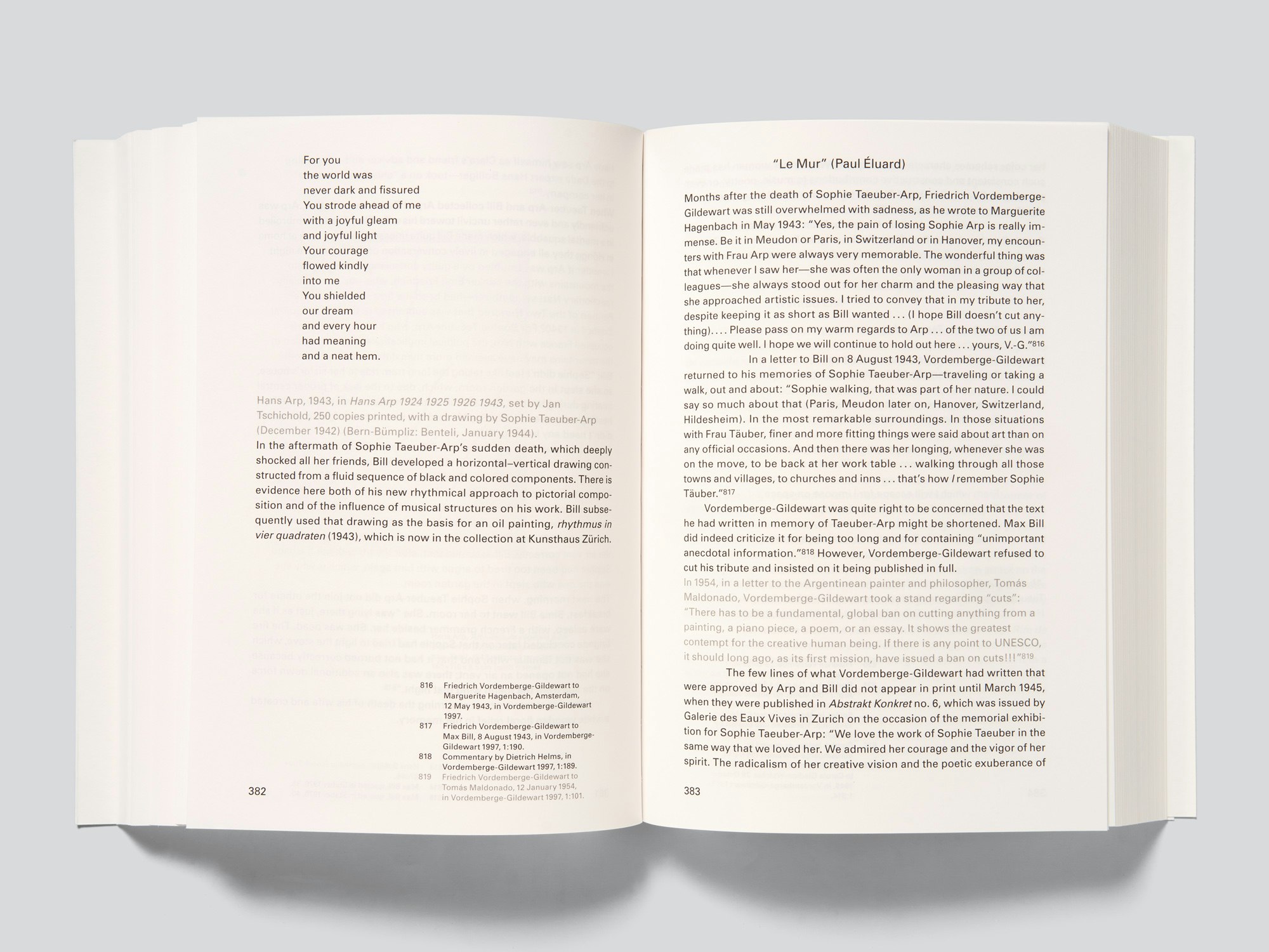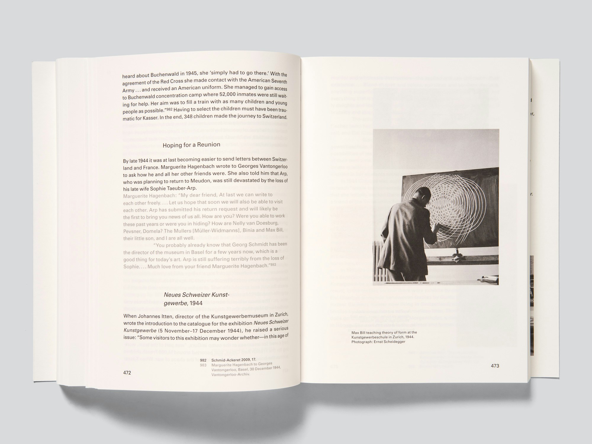 In this 800-page volume of notes by Angela Thomas, Max Bill’s (1908–1994) second wife, the design successfully organises the different narrative layers and contexts, rendering the content more accessible. The excellent typography is based on a single Univers weight in three sizes, yet the use of black and grey type delineates two strands of text that are seamlessly interwoven across the many short chapters and paragraphs. Whereas the majority of the paragraphs are printed in black and reconstruct ever-new episodes from Bill’s life using a variety of sources, they are interspersed on each page with paragraphs printed in grey that provide the author’s personal references to biographies, relationships, literature, artworks and so on. (The footnotes at the bottom of the page are strictly limited to bibliographical references.) A further layer of the design are the numerous pages containing between one and three small-format images, providing additional context without allowing Bill’s own aesthetic to dominate. The varying sizes and largely free placement of the images are different on each page, and this is reflected in the captions via a subtle system. A great deal of white space is left on the image pages, which, along with the excellent organisation of the material, helps make the book’s content feel surprisingly light and accessible. The dust jacket of thin paper and the softcover give this heavy object a surprisingly soft feel. While the large black-and-white portrait on the cover leaves no doubt as to who is being celebrated here, the authority belongs to the omniscient narrator, whose name appears in the same size type as that of her husband in the freely positioned title.