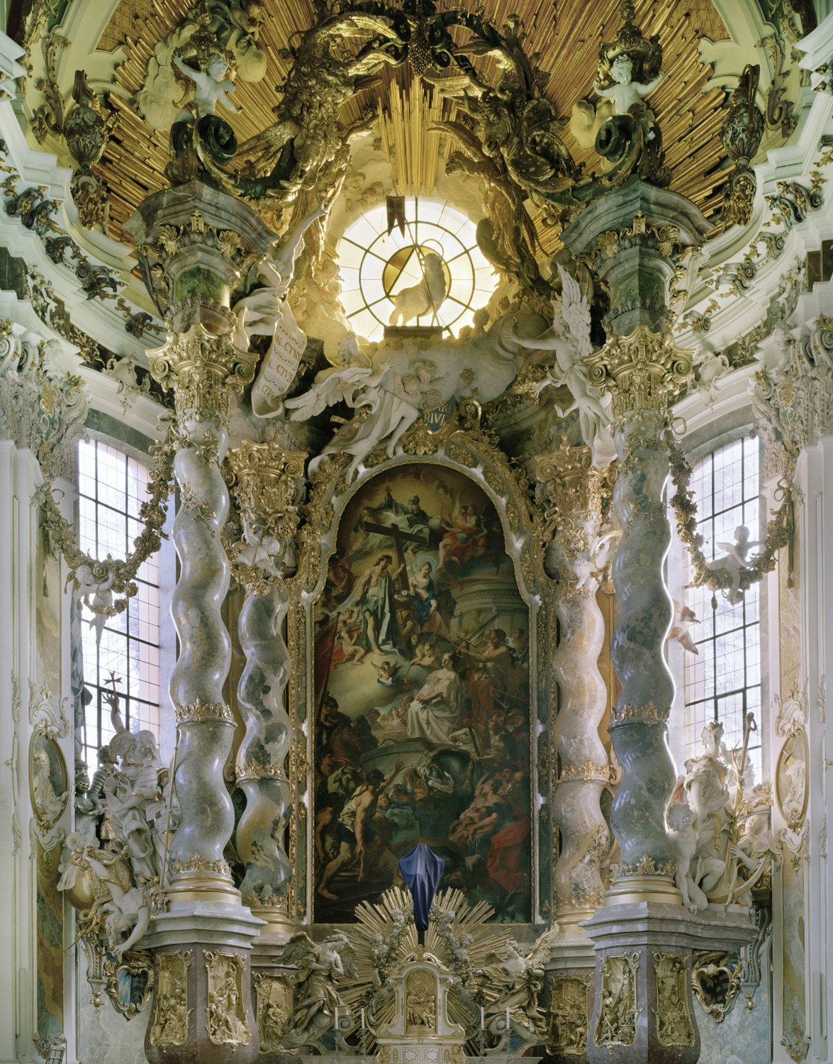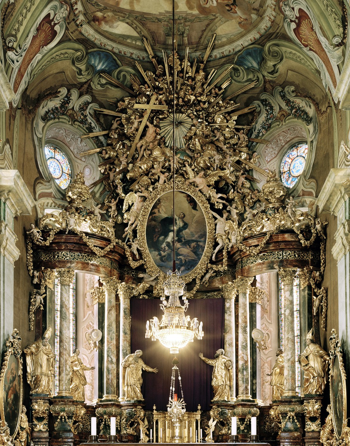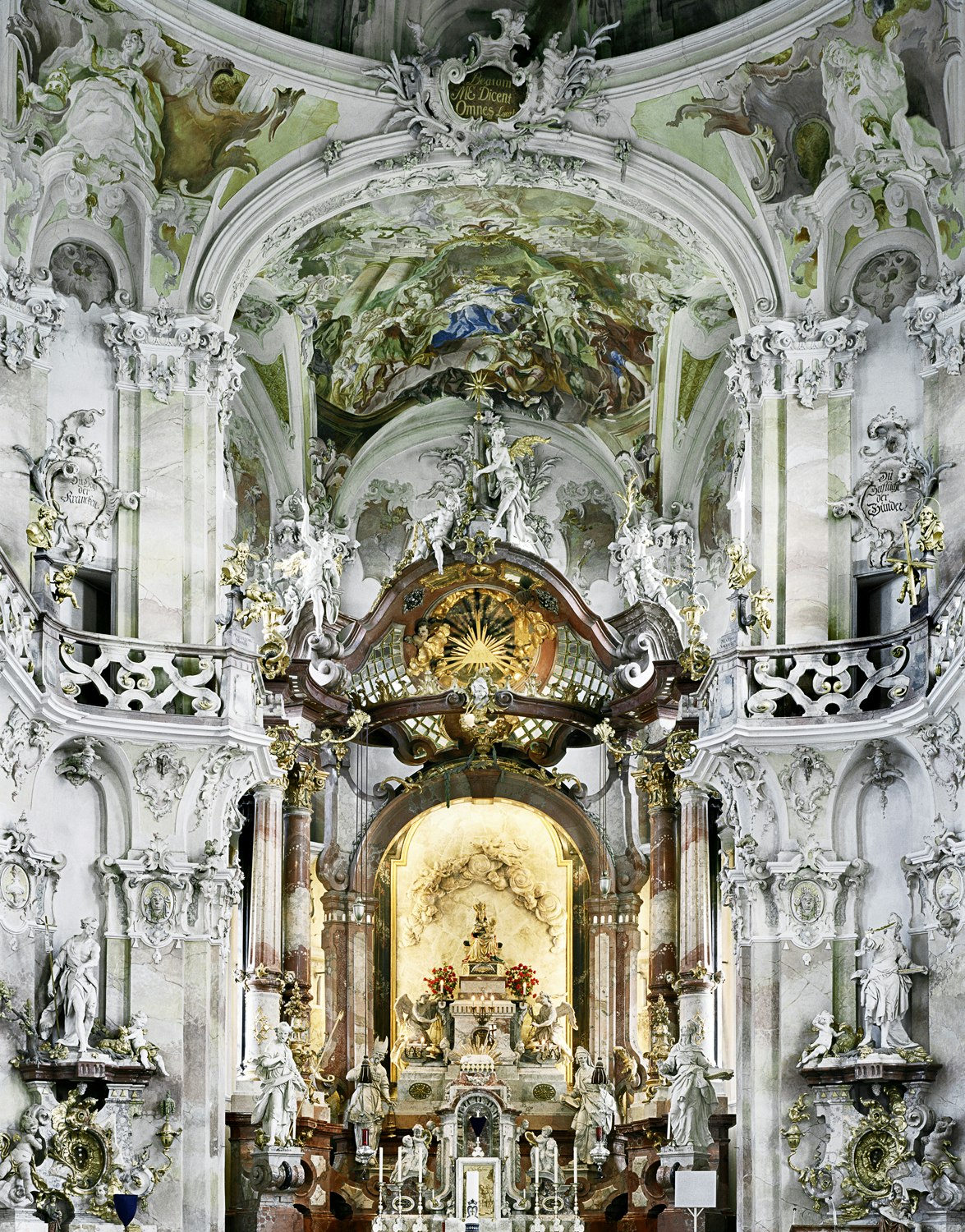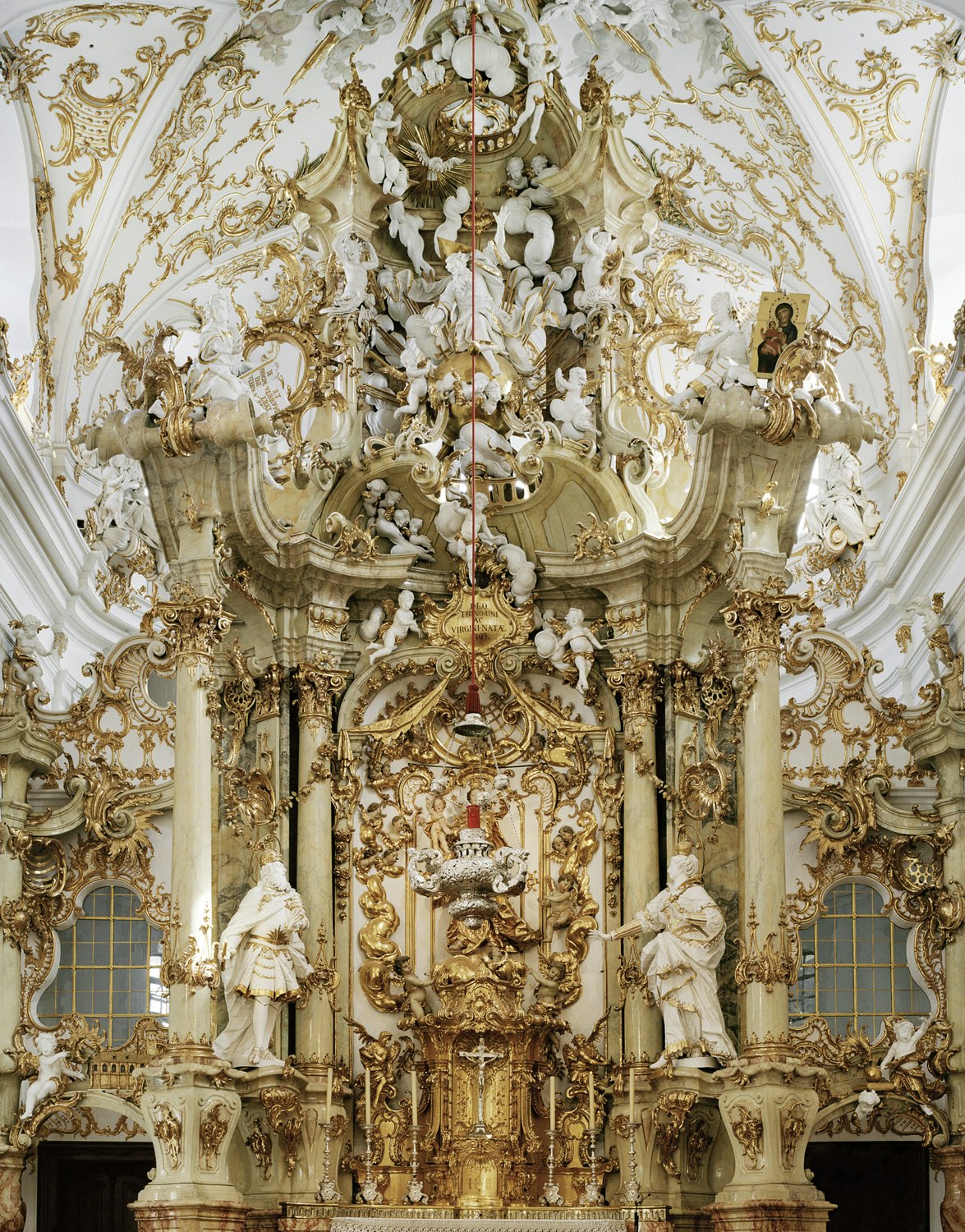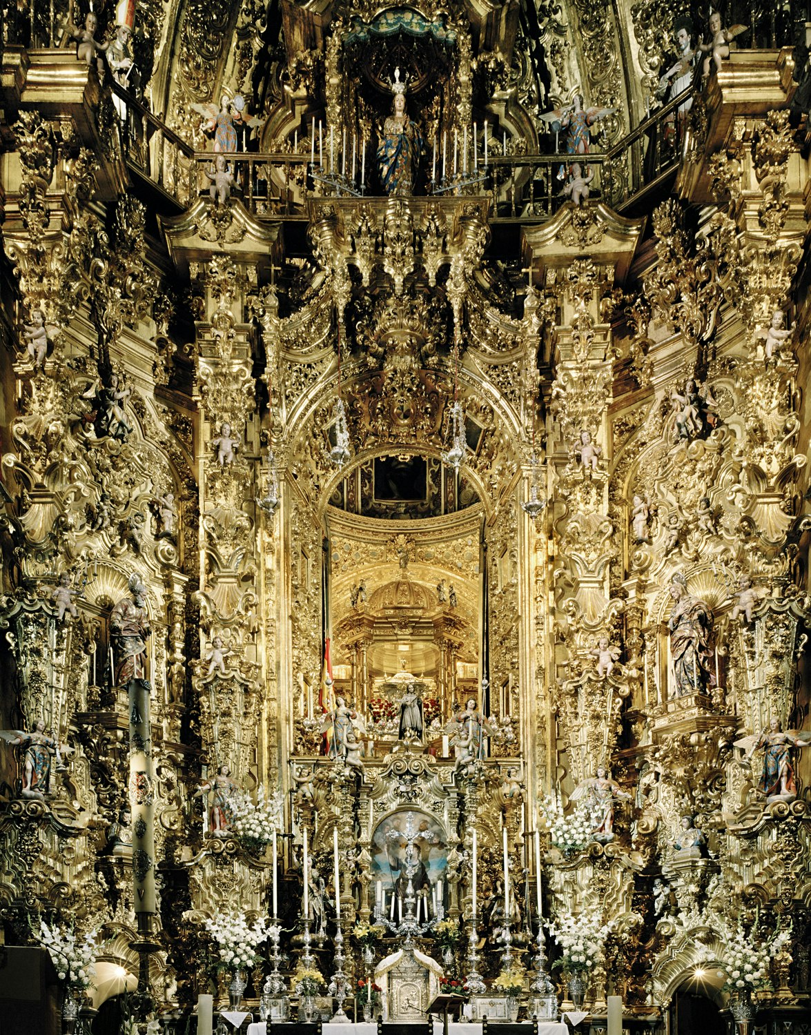 Golden angels, sumptuously decorated altars, magnificently ornate columns and dynamic sculptures create a dense and symbol-laden image of the church interior. The sheer wealth of imagery, the carefully orchestrated colours and the surprisingly large format all combine to create an overwhelming effect, which is further intensified by the juxtaposition of the photographs with variations on the same motif.