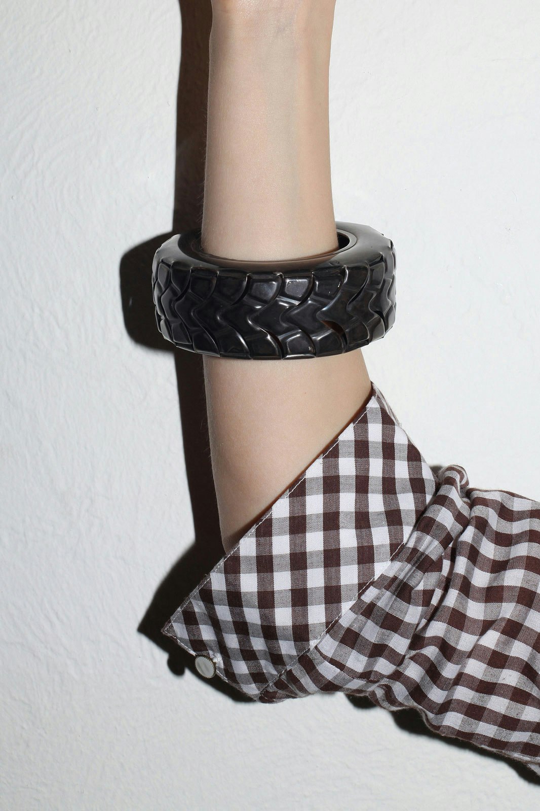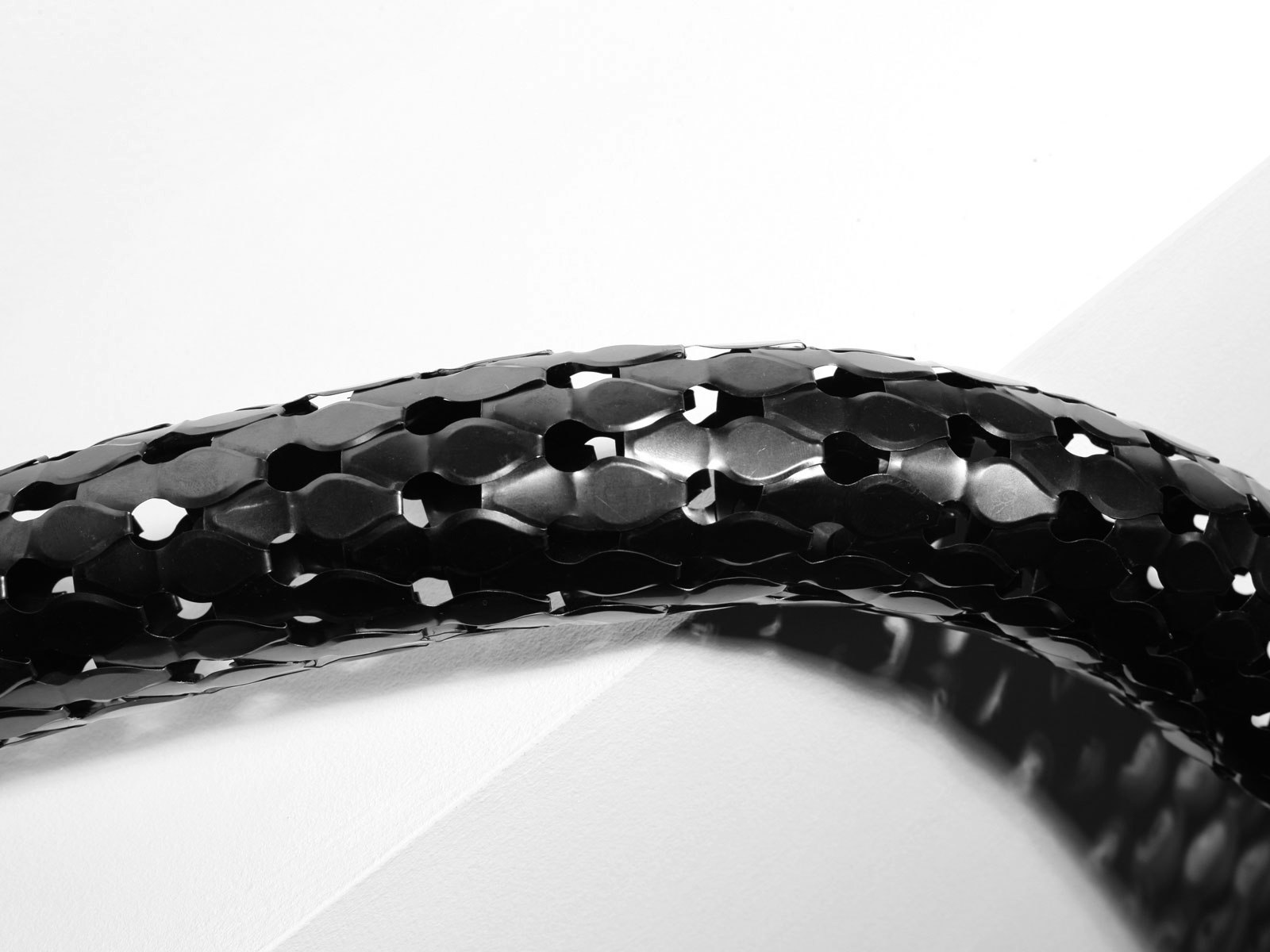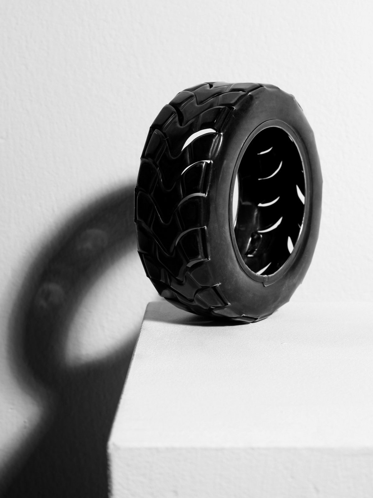 This kind of ambiguity is an integral part of all his designs. In 2002, after training as a goldsmith in Basel, he completed his master's degree at the Akademie der Bildenden Künste in Munich under Otto Künzli. The influence of his teacher can readily be recognised - a rounded, many-faceted education expressed in a sure knowledge of materials and in skilled craftsmanship. His creations are distinct, to a certain degree, from traditional decorative art. They retain their function as ornaments, but the downright banal character of these everyday shapes is startling. A silver slug to be worn as a brooch? A bracelet shaped like a tyre? A necklace of wooden weisswurst?