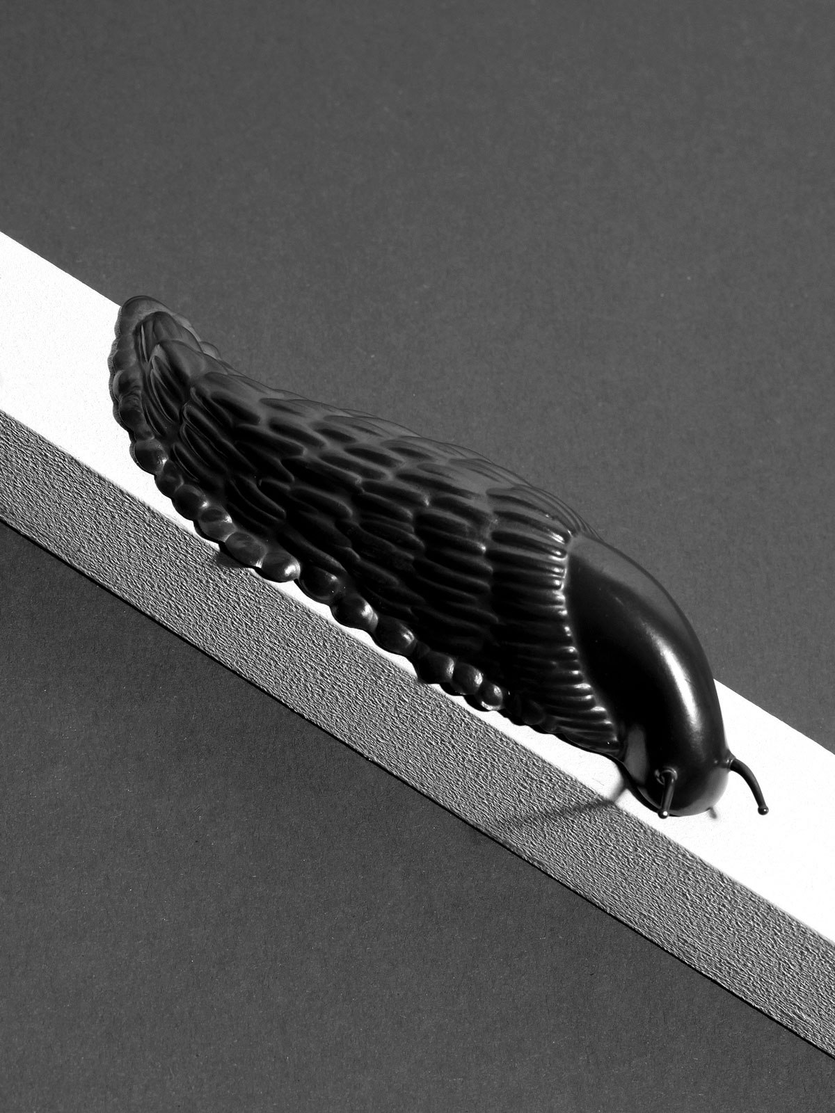 For the ‘Mistkäfer' (dung beetle) he again makes use of an existing shape: a steel teaspoon. In this case, nothing was cut away; instead, the whole spoon was transformed into a perfect dung beetle, complete with legs, wings and a proboscis, by cutting into and bending its metal. This is a process that we associate with magic tricks - but David Bielander performs it to perfection.