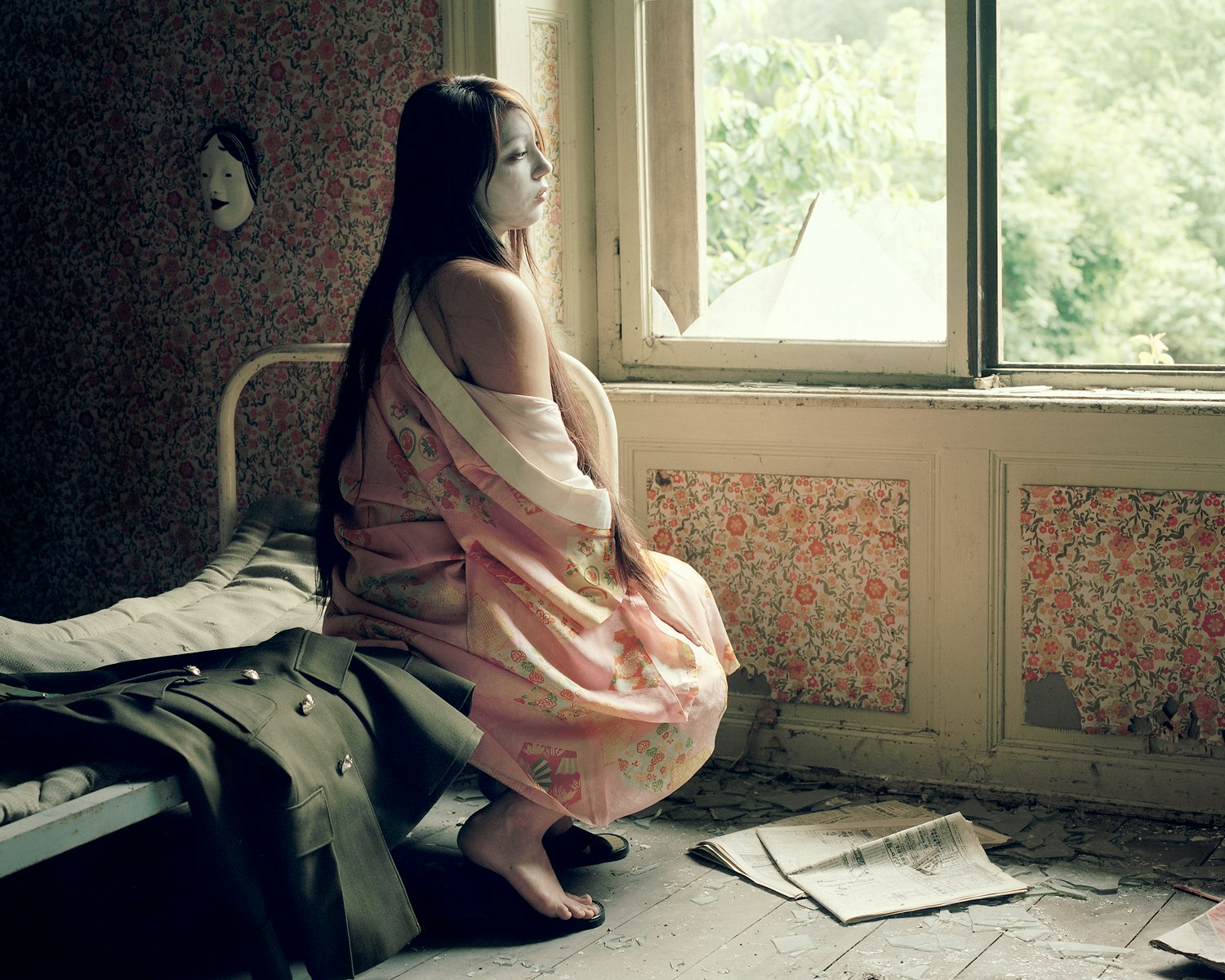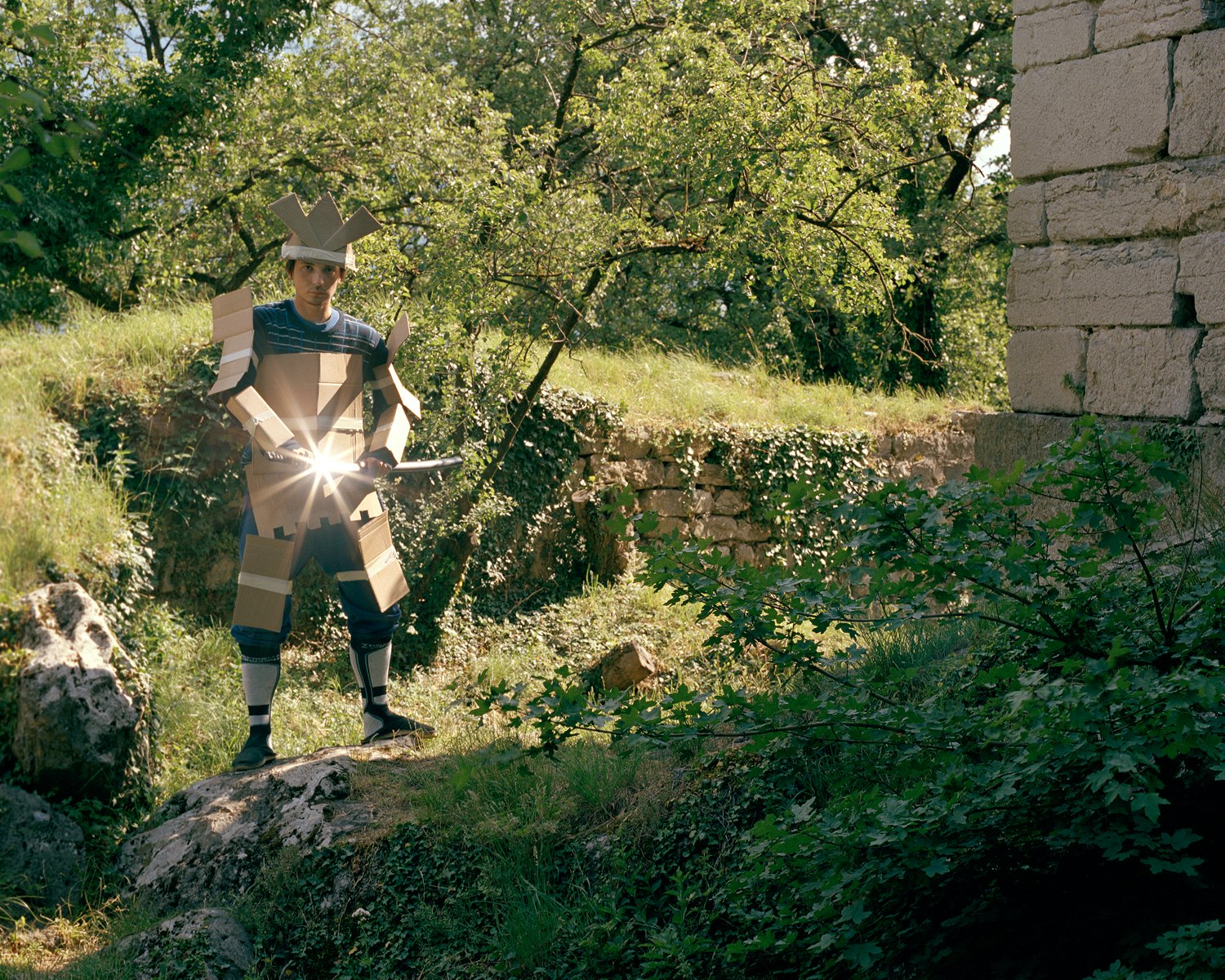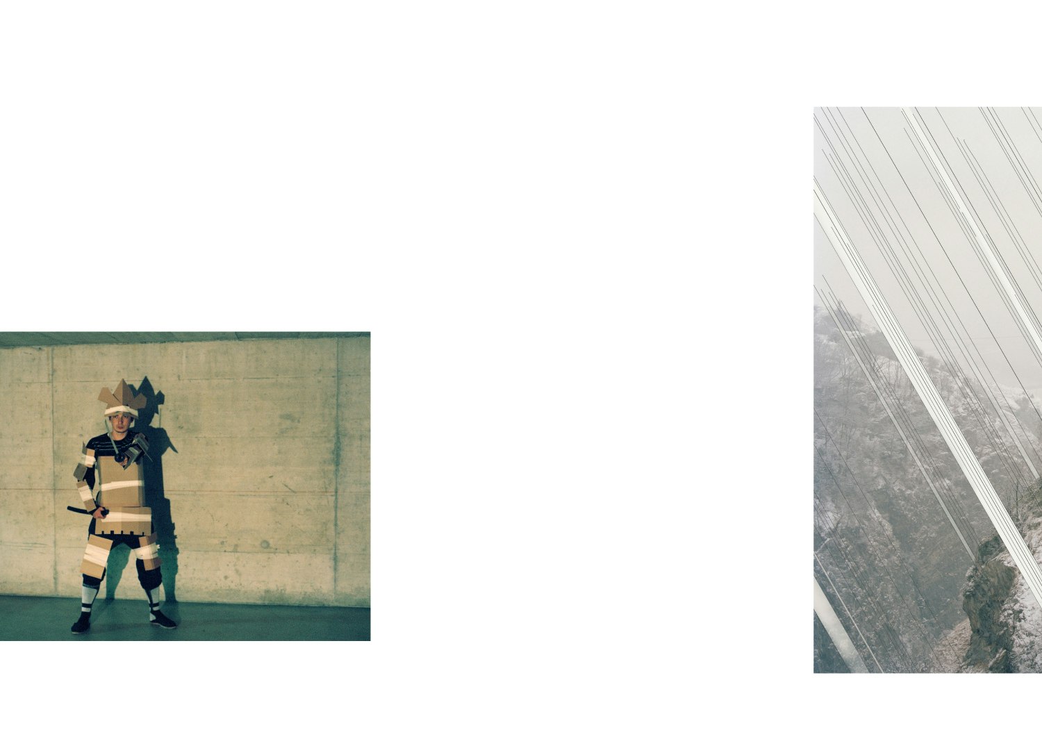 The visual universe of Favrod's photographs presents a profound and compelling reflection on his Japanese identity and the way he relates to Japan. All the images in the 22-part series were created in Switzerland. For Gaijin, this meant that the photographer had to use masks or costumes for his composition. Specifically, it meant that the Samurai warrior (Favrod himself) had to make do with armour made of cardboard. In some of the pictures, Favrod uses no such props: in his painterly landscapes, for instance, the supposedly Japanese aspect is artfully evoked by means of cleverly chosen moods and motifs.