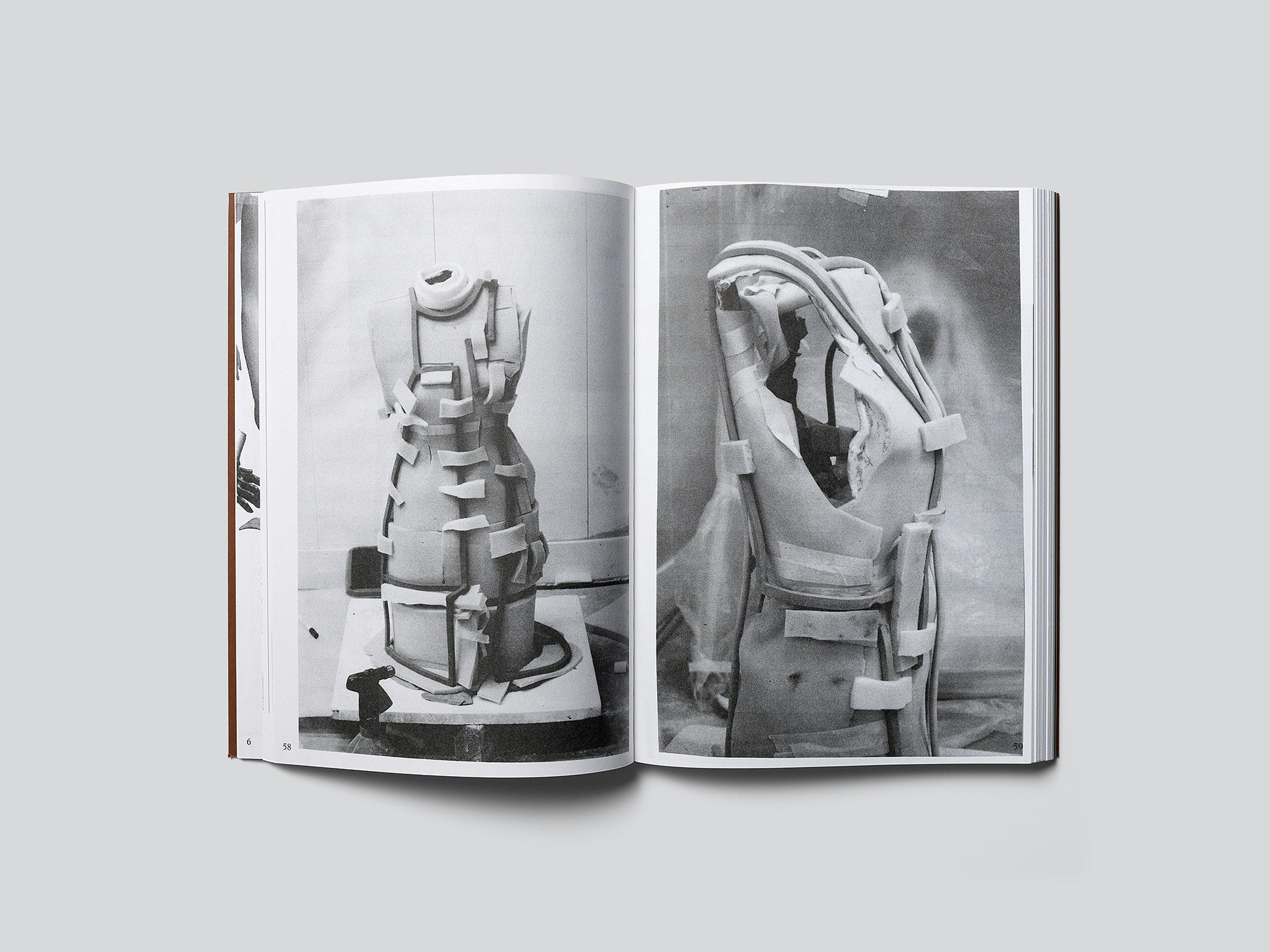 The artist Stephanie Baechler (b. 1983) comes from the world of fashion design, creating objects and installations from clay and textiles. In this monograph she presents a resolute way of presenting her works, in that she only documents the working processes involved. One of the principal components of the book are facsimile pages from Baechler’s sketchbooks, some of them with visible side margins. They are combined with photographs of individual stages in the works’ production arranged in irregular groups and at times placed at a slight angle on the page. The drawings and photographs interact effectively, giving rise to a consistent, seemingly organic publication that offers useful insight into how the artist works. The three different papers and slightly rough softcover also combine into a harmonious whole. Despite conspicuous details such as inserted ribbon bookmarks and drawings and signatures on the folded-in cover flaps, the design does not come across as pretentious. Two texts by the artist and two by external authors, placed on the insides of the cover and on loose sheets packed in an inserted cutting-pattern envelope respectively, elucidate the artist’s programme and practice in the form of letters written to elements and materials such as ‘Dear Silhouette’ and ‘Dear Clay’.