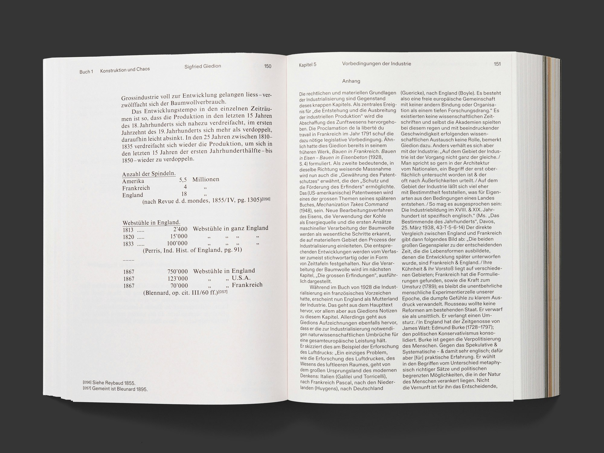 This academic treatment of an unfinished book project by Sigfried Giedion, dating back to the 1930s, captures the complex content exceptionally well thanks to the functional and clever design. The significance and structure of the work are apparent right from the broad spine, with the three sections of the book listed beneath the capitalised main title. Within the book block, the three sections are delineated from each other by individual sheets of the thick, rough cover paper, which serve as title pages explaining the different statuses of the sections. Only the first lengthy text was written by Giedion himself; the other two are described as ’summaries by the editors’ based on Giedion’s notes. The typographical design, which includes a serif and a sans-serif font, is elaborate but not overwhelming, as it is conditioned by the various paratexts such as page headings, footnotes, academic commentary and so forth. Three image sections stand out from the exterior owing to their coloured backgrounds, making them just as immediately accessible as the text sections. Despite the decidedly modern aesthetic, all the design decisions complement the archive material.