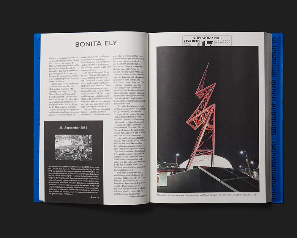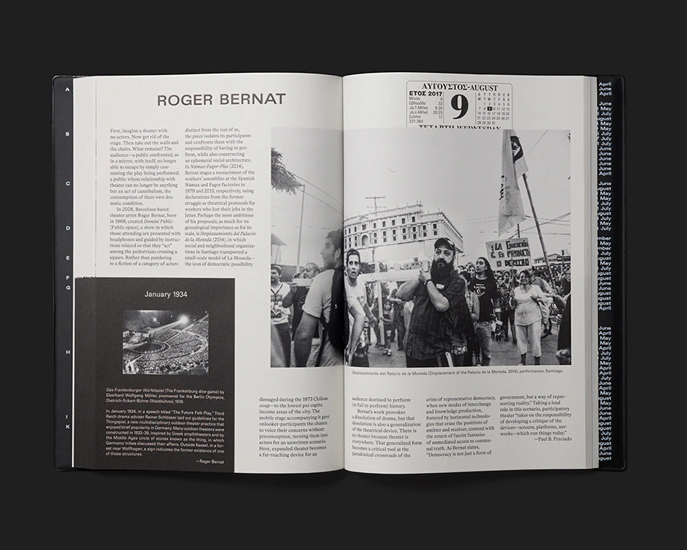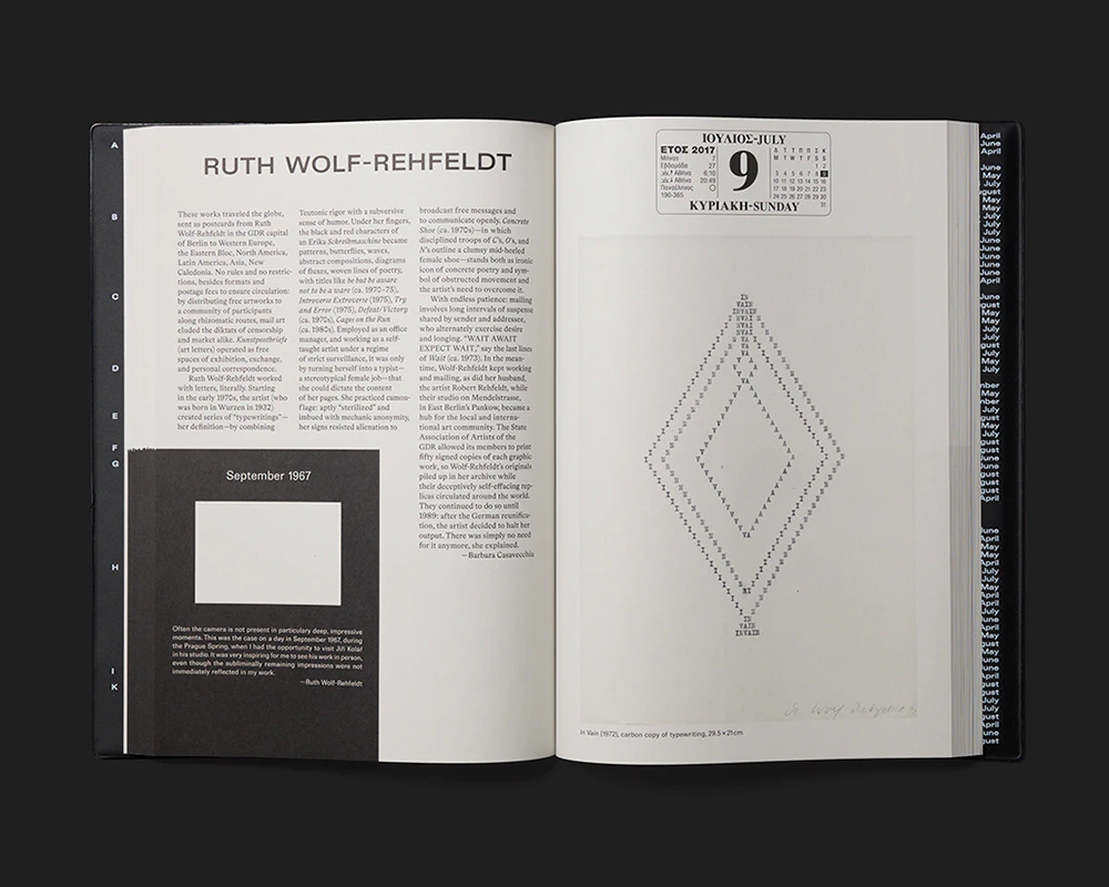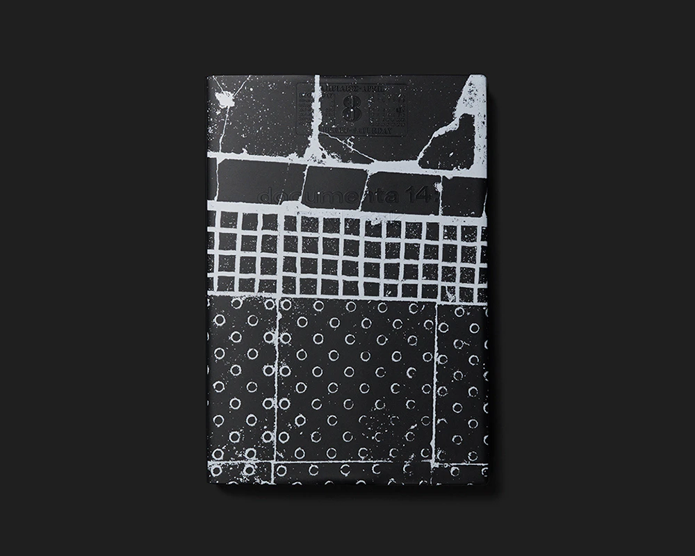 The exhibition guide to documenta 14 employs a dual chronology that imbues the ‘here and now’ of contemplating art with greater complexity. First, the duration of the exhibition is mirrored in the time taken to read the book, with the days of documenta 14 replacing the page numbers. They are placed at the top edge of each right-hand page in a calendar layout, so that the number of double pages in the book matches the number of days the show ran. Second, all the artists involved – each of whom is introduced with a picture and text on a double page – were asked to name a date from history that is important to their work. Those dates are each displayed in an identical black rectangle at the bottom left of a double page, with a small picture and a brief explanatory text. They are arranged in reverse chronological order and so dictate the order in which the artists appear in the book. The highly conceptual design adds value to the exhibition and at the same time creates a distinct atmosphere. An introduction headed ‘Dear Reader’ elucidates the design concept and guides the reader into the book.