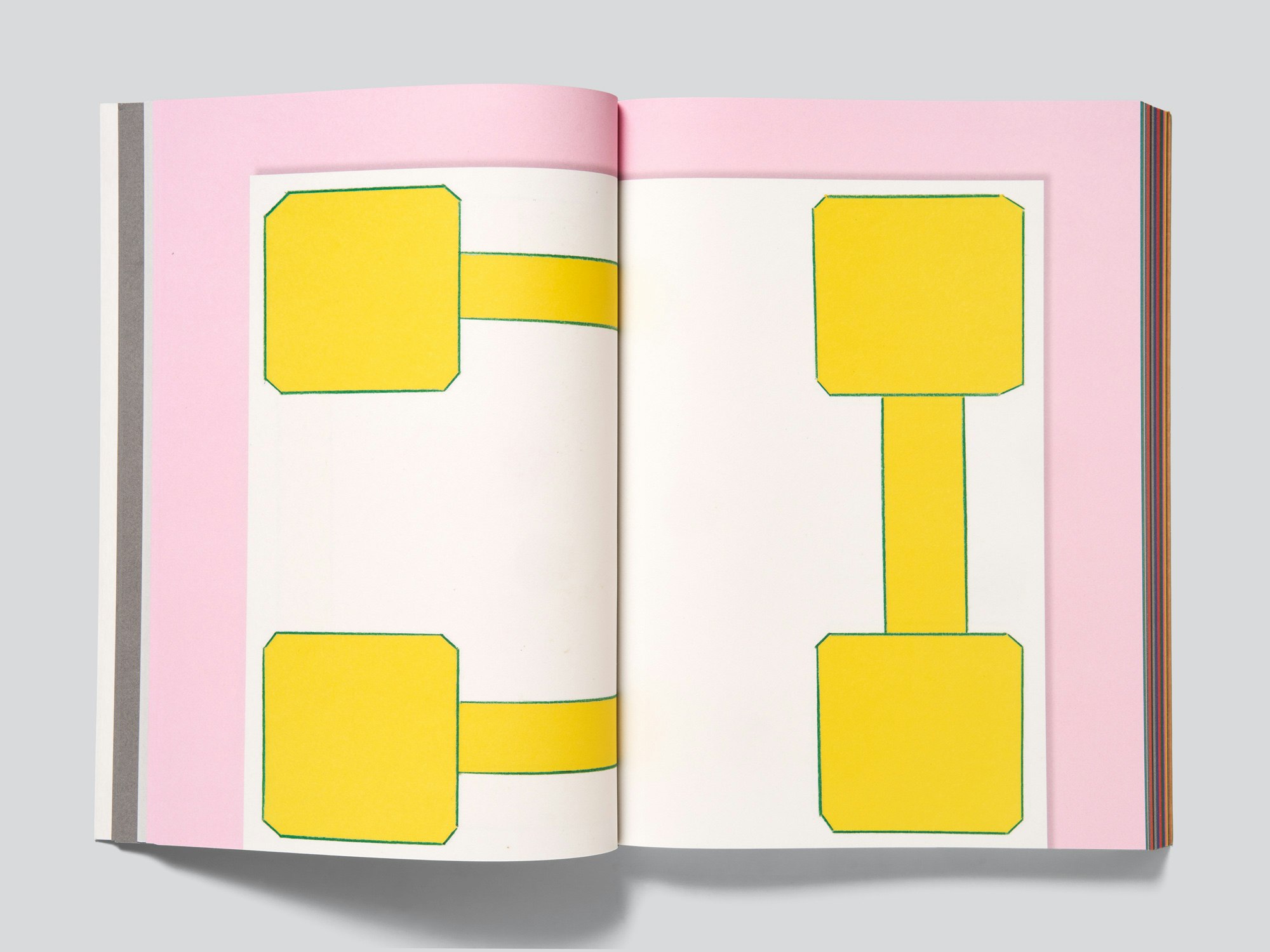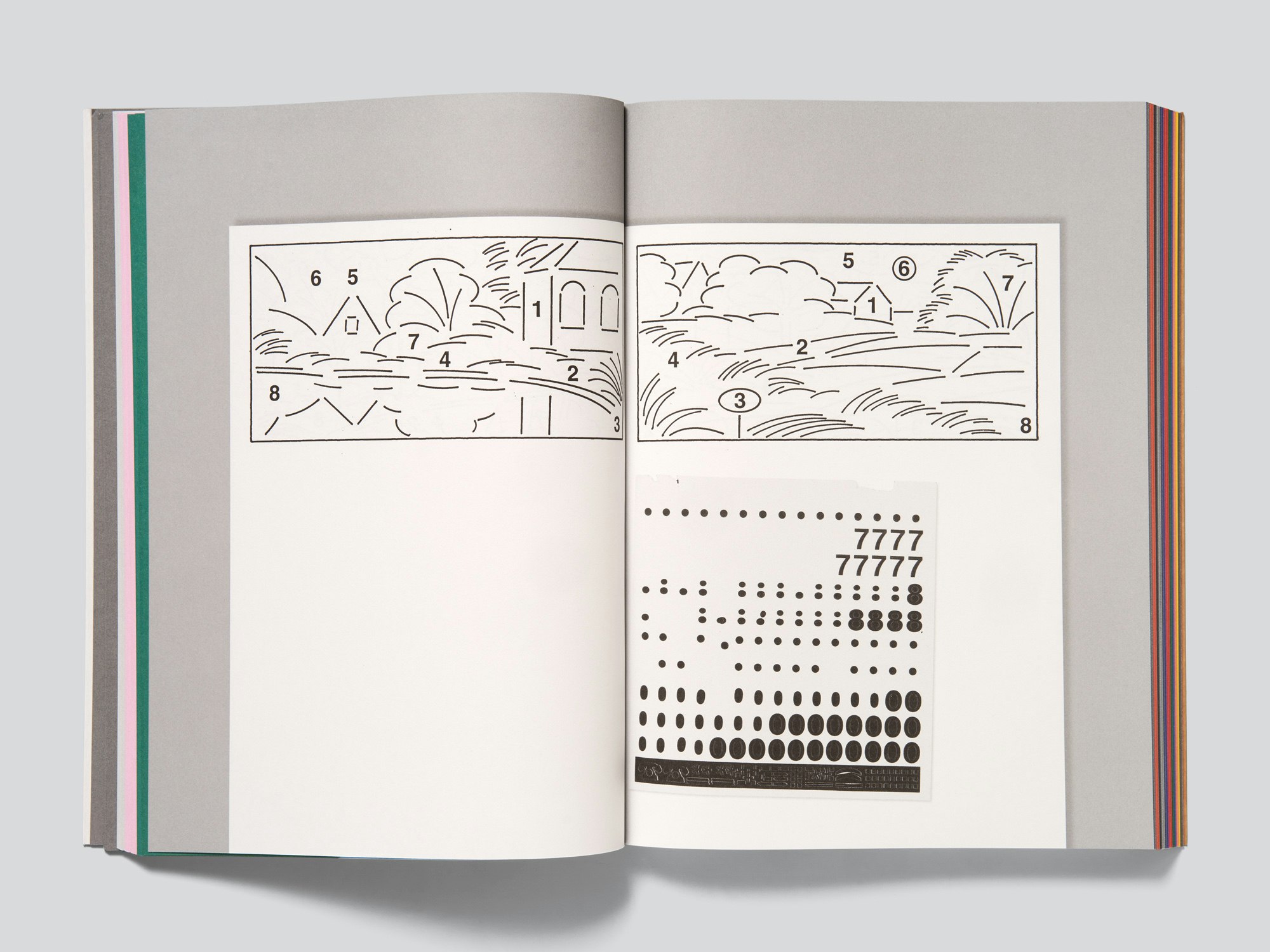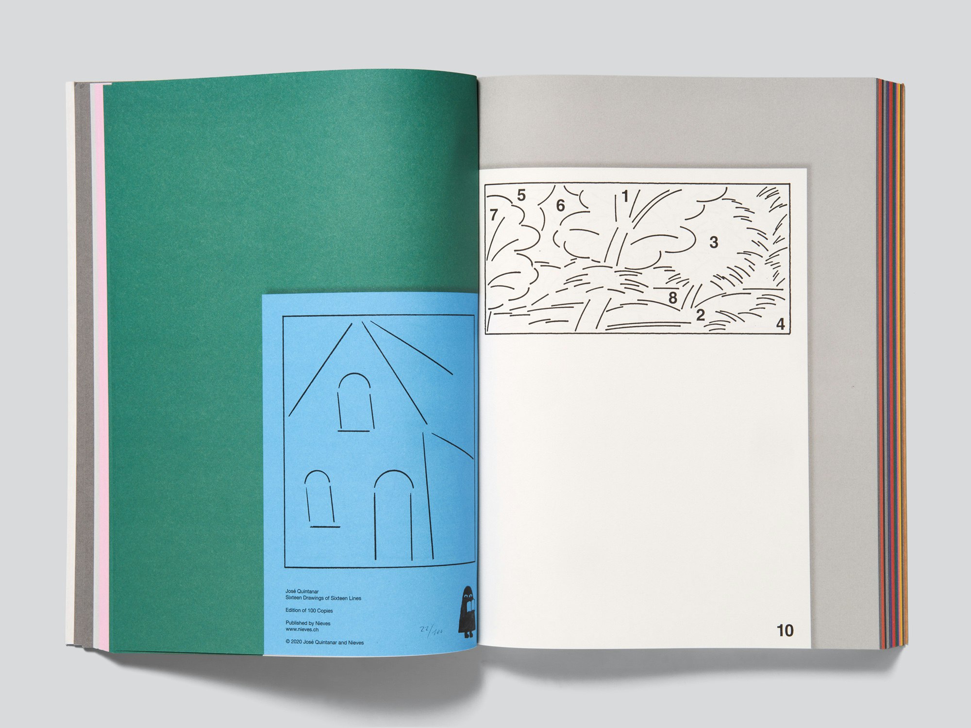 José Quintanar’s conceptual and witty series of line drawings which are presented in slim volumes that he produces at a prolific rate are brought together into coherent book form through two simple but powerful design ideas. The book itself is comprised of 19 volumes that were published over four years in different formats of between 8 and 34 pages and that are included in full as original-size facsimiles. A first clever design decision was to align all the facsimiles with the gutter and the bottom of the page. Thus when leafing through the pages it feels less like a reproduction and more like a simulation of the original volumes. The second choice is the large amount of blank space left on the book pages, providing a background to the much smaller page formats of the original volumes. Each of the volumes is given here its own background colour tone, chosen to complement the drawings. This creates a colourful and playful effect, such that at first glance it almost resembles a children’s colouring or activity book. There is no cover as such; rather, the book block is glued in a makeshift style into a semi-card with flaps, which will inevitably detach. The semi-card is entirely unprinted on the exterior, but an enclosed sheet with stickers – including the author’s name, book title and ISBN – suggests that the cover design is not as yet final. Everything is contemporary and engaging, especially as there is so much to discover in the individual volumes. This publication is a good example of how the task of creating a book can be accomplished with minimal design means and a comparatively small budget.