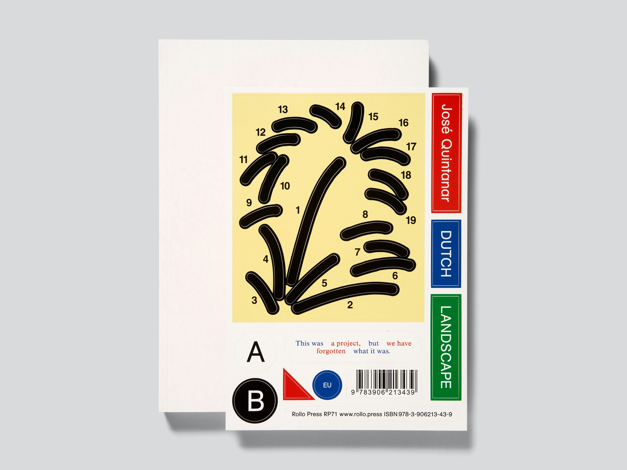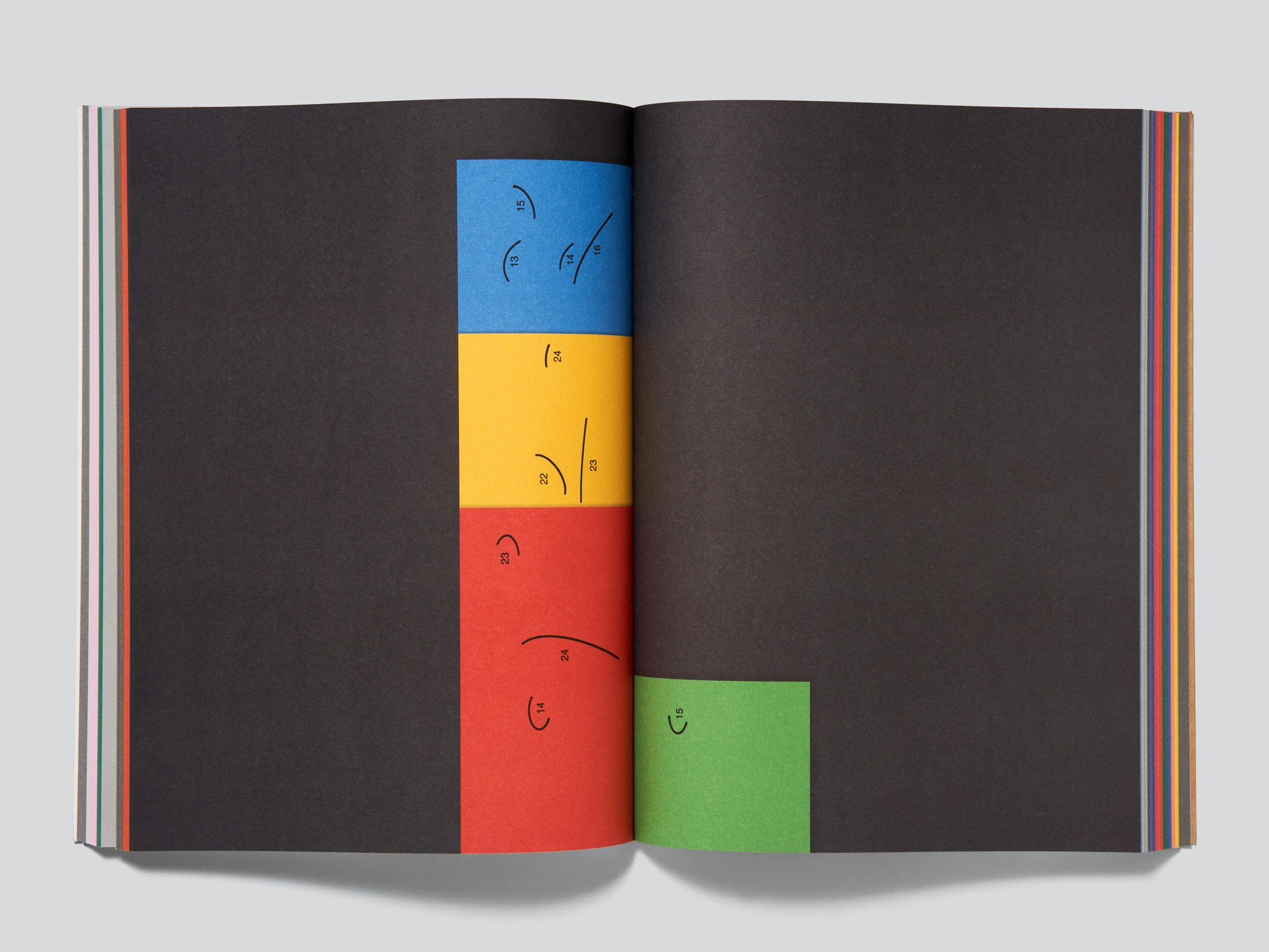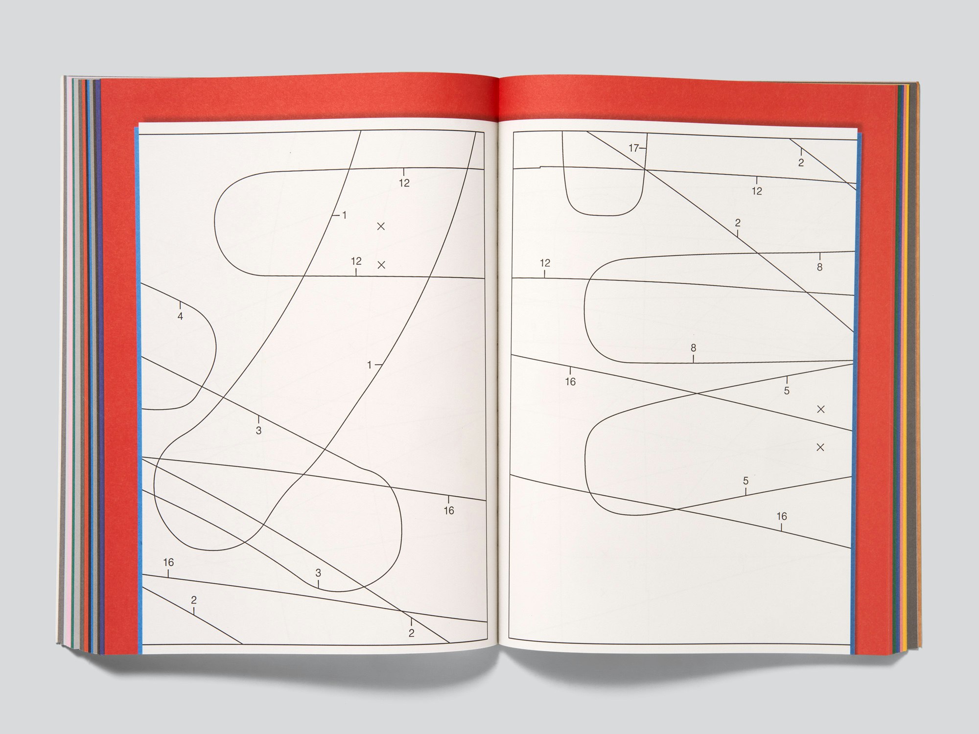 José Quintanar’s conceptual and witty series of line drawings which are presented in slim volumes that he produces at a prolific rate are brought together into coherent book form through two simple but powerful design ideas. The book itself is comprised of 19 volumes that were published over four years in different formats of between 8 and 34 pages and that are included in full as original-size facsimiles. A first clever design decision was to align all the facsimiles with the gutter and the bottom of the page. Thus when leafing through the pages it feels less like a reproduction and more like a simulation of the original volumes. The second choice is the large amount of blank space left on the book pages, providing a background to the much smaller page formats of the original volumes. Each of the volumes is given here its own background colour tone, chosen to complement the drawings. This creates a colourful and playful effect, such that at first glance it almost resembles a children’s colouring or activity book. There is no cover as such; rather, the book block is glued in a makeshift style into a semi-card with flaps, which will inevitably detach. The semi-card is entirely unprinted on the exterior, but an enclosed sheet with stickers – including the author’s name, book title and ISBN – suggests that the cover design is not as yet final. Everything is contemporary and engaging, especially as there is so much to discover in the individual volumes. This publication is a good example of how the task of creating a book can be accomplished with minimal design means and a comparatively small budget.