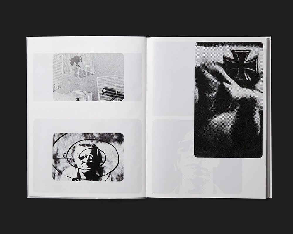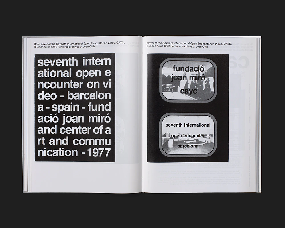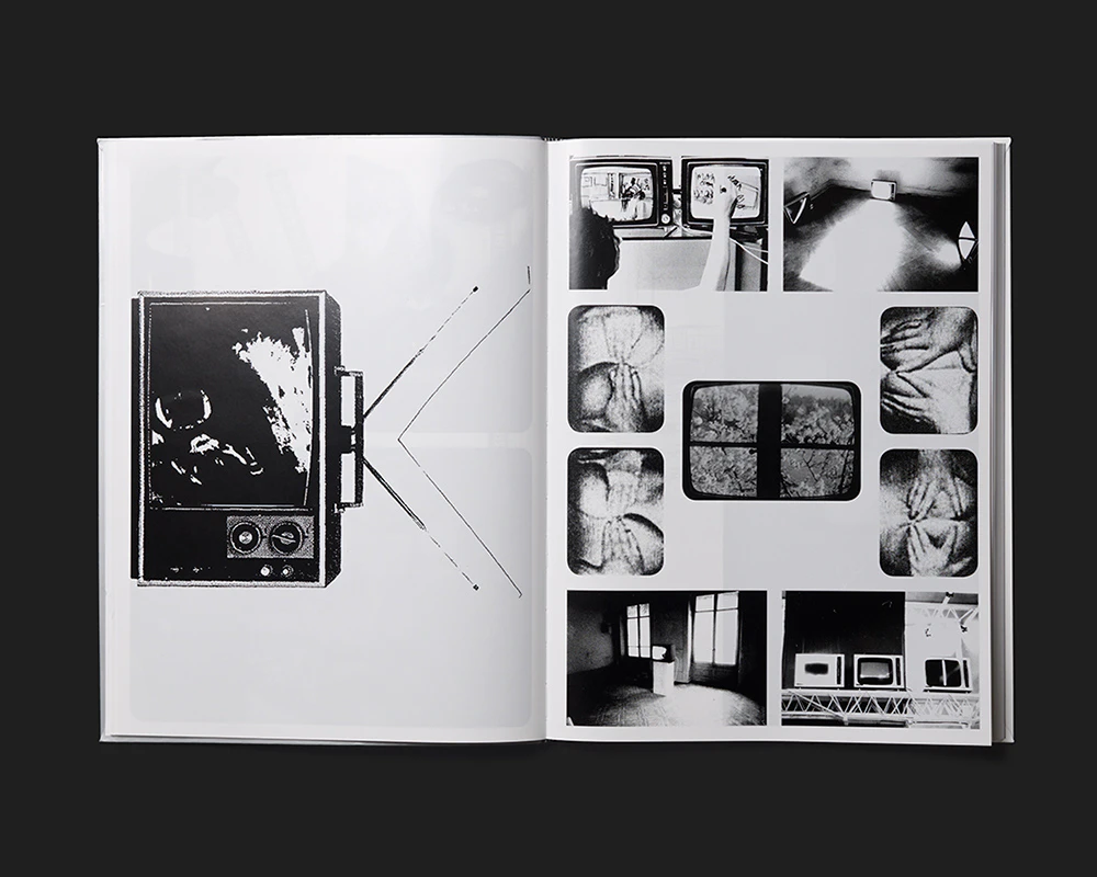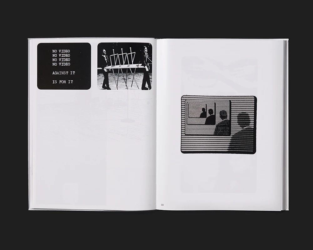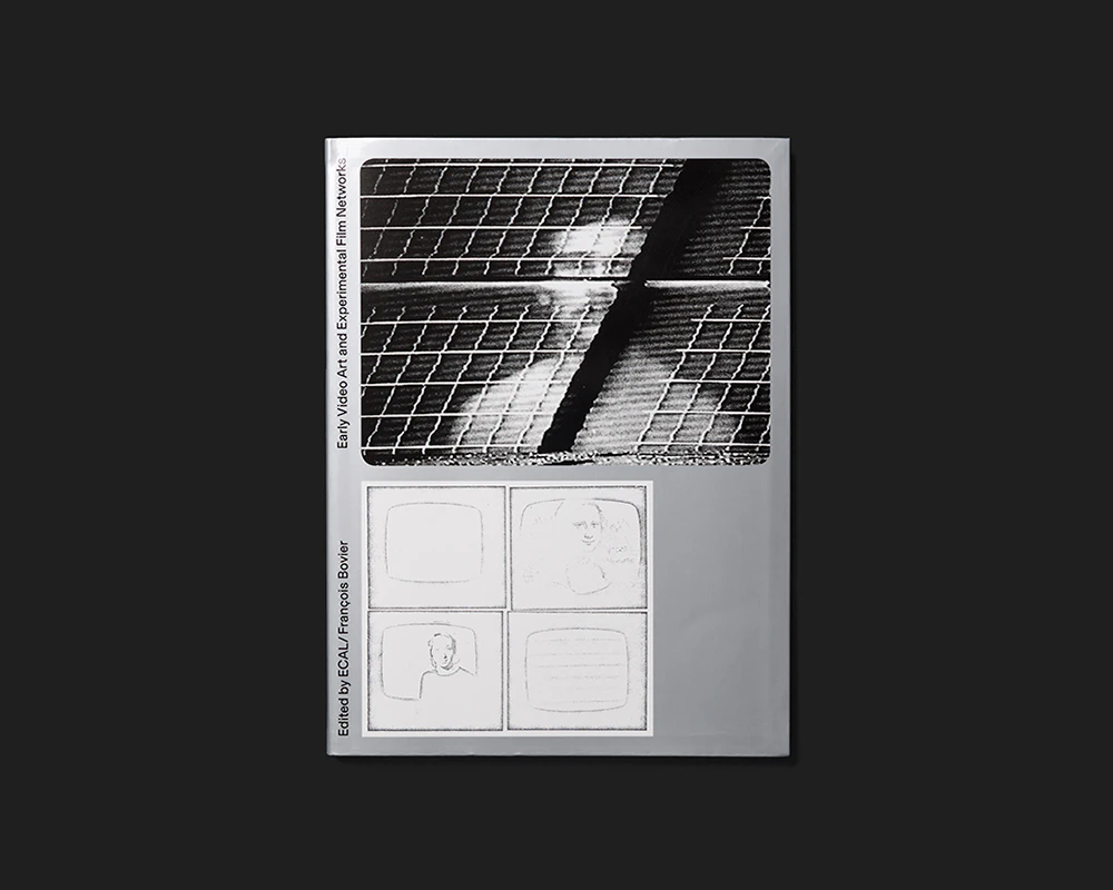 A large-format black, white and silver volume with a flexcover exploring the video art scene in French-speaking Switzerland in 1974 finds an effective approach to a medium that is difficult to deal with in a book. Rather than focusing on technical characteristics or details of content, the design allows readers to engage playfully with the aesthetic of the images. The stills, most of them relatively large, exhibit varying colourations – black and white; silver and white; black and silver; black, silver and white – thus accentuating different image compositions. In an introductory section, two to ten stills per double page are arranged into graphic compositions in a text-free grid layout. The scholarly articles that follow are set in four columns on a double page, with the first being used for the copious footnotes. Each article is followed by a series of reference images and text documents, mostly placed alone or in pairs on a page with explanations. Strong contrasts unify the look of image and text, so that the video aesthetic pervades the book’s entire appearance; yet at the same time it is not overdesigned.