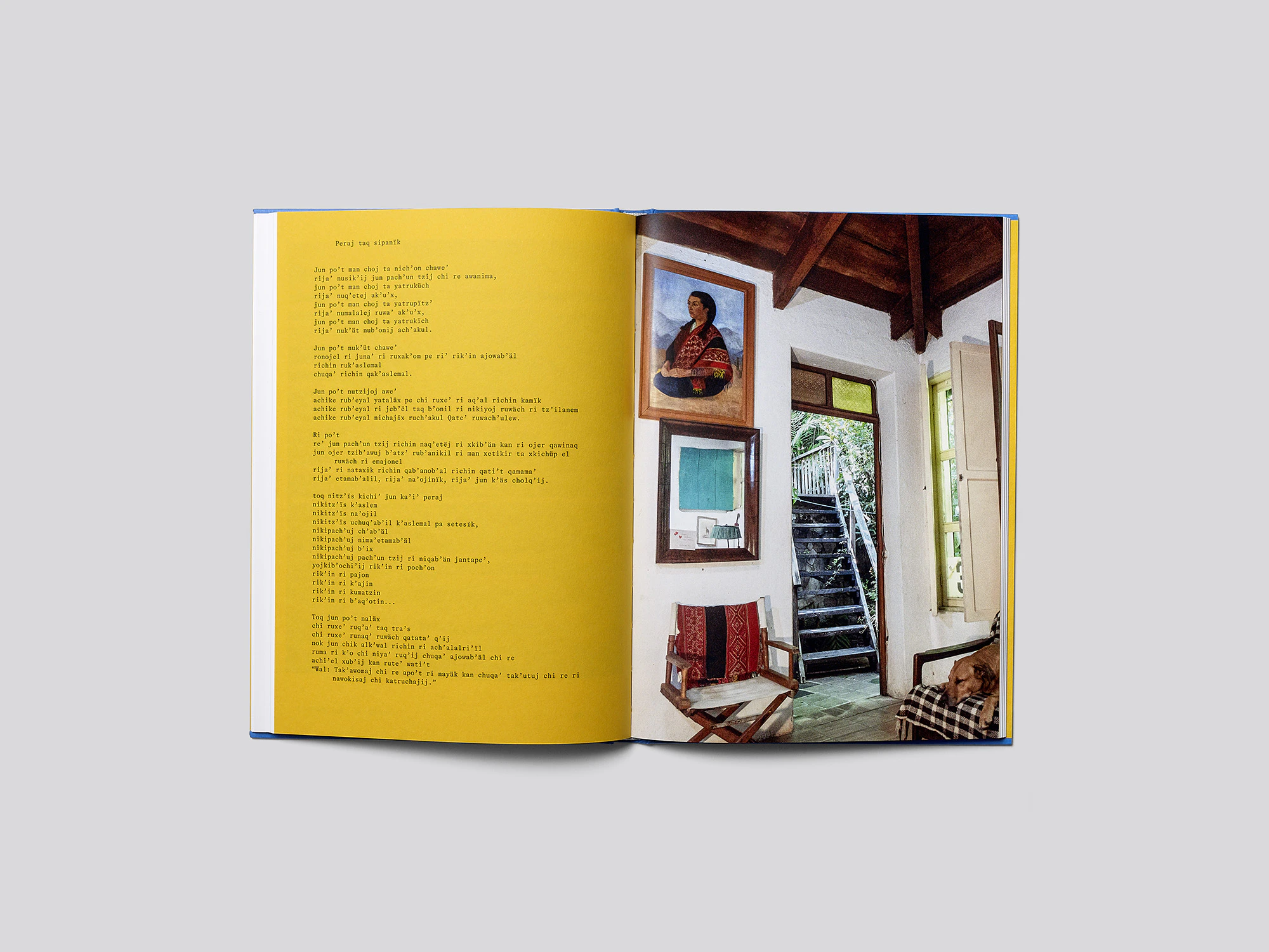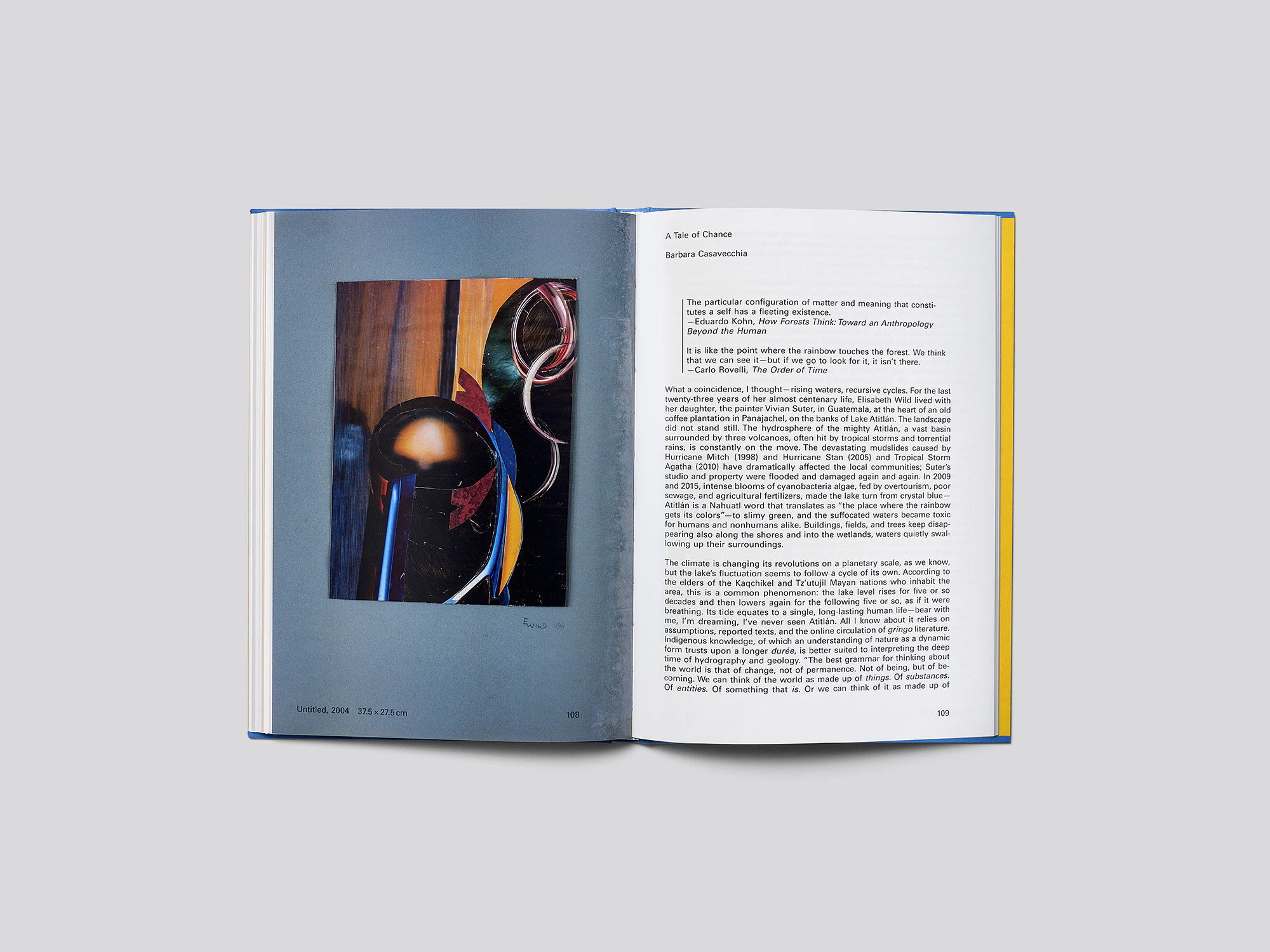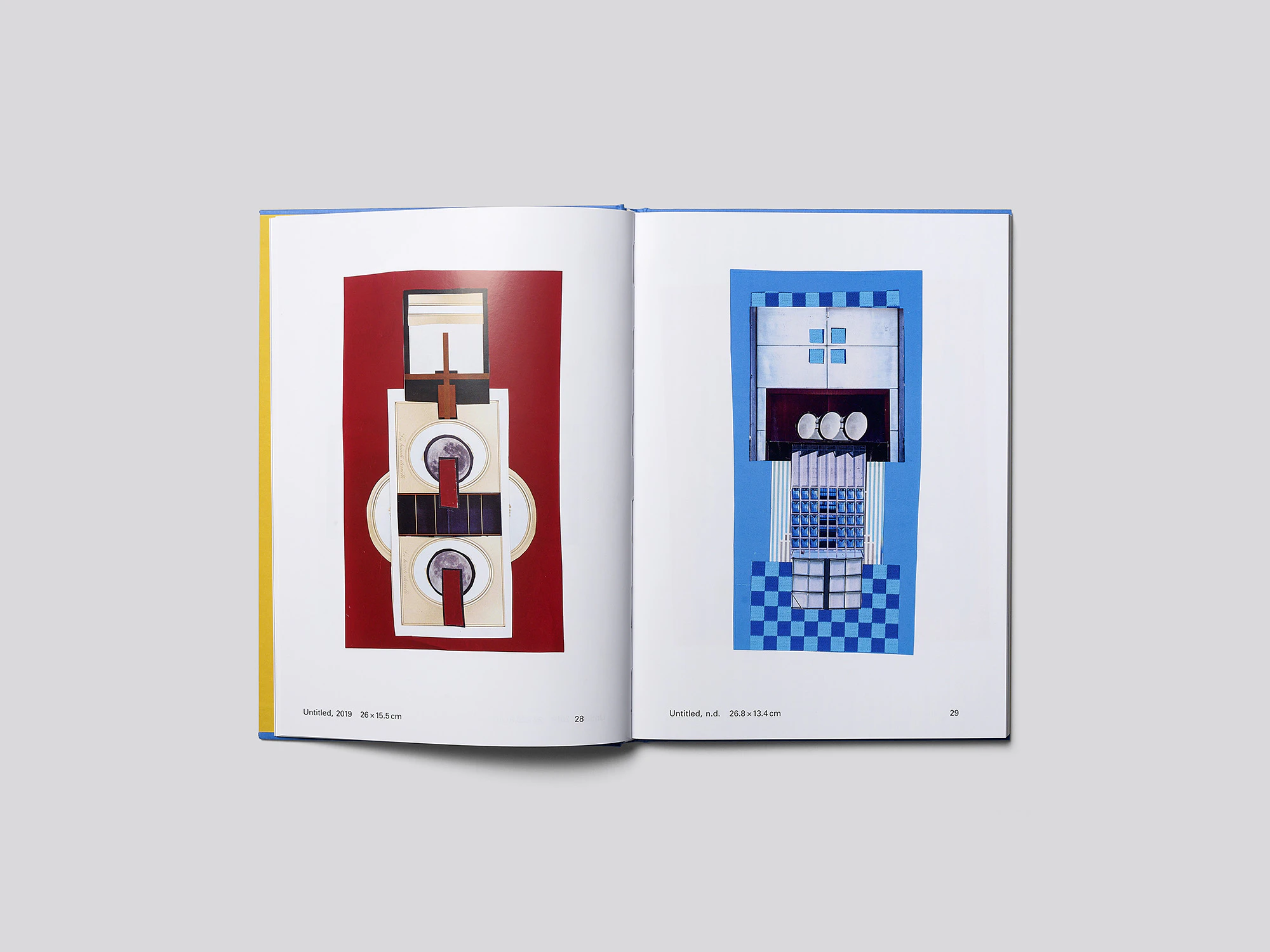In a monograph about the antiques dealer and artist Elisabeth Wild (1922–2020) from Basel, the design reacts to the work with strong gestures but without thrusting itself into the foreground. Wild moved to Guatemala in 2007 to live with her daughter and there, late in life, she created abstract, slightly misshapen and often brightly coloured collages using pieces cut from glossy magazines and pasted one on top of another. The book object references the cut-out technique at a first glance, as its light-blue cover and all of the pages are cut off at the right-hand edge. Meanwhile, the collage process is exemplified by an abstract title image made from a piece of pink paper pasted – most unusually – at a slight slant directly onto the book cover, without pre-embossing the respective area, so as to partially obscure some letters of the embossed title. With its matt colours, the cover design also makes for a fascinating contrast with the gaudy contents on high-gloss paper. In some of the illustrated essays, Wild’s slightly misshapen collages are randomly located unusually close to the text, just like the piece of paper on the cover. In between are numerous pages of pictures presenting between one and three works, often standing freely. The endpaper and a small number of pages are made of dark yellow paper and contain poems by the Guatemalan artist Negma Coy. Despite the richness of the material, the overall effect is light and playful.