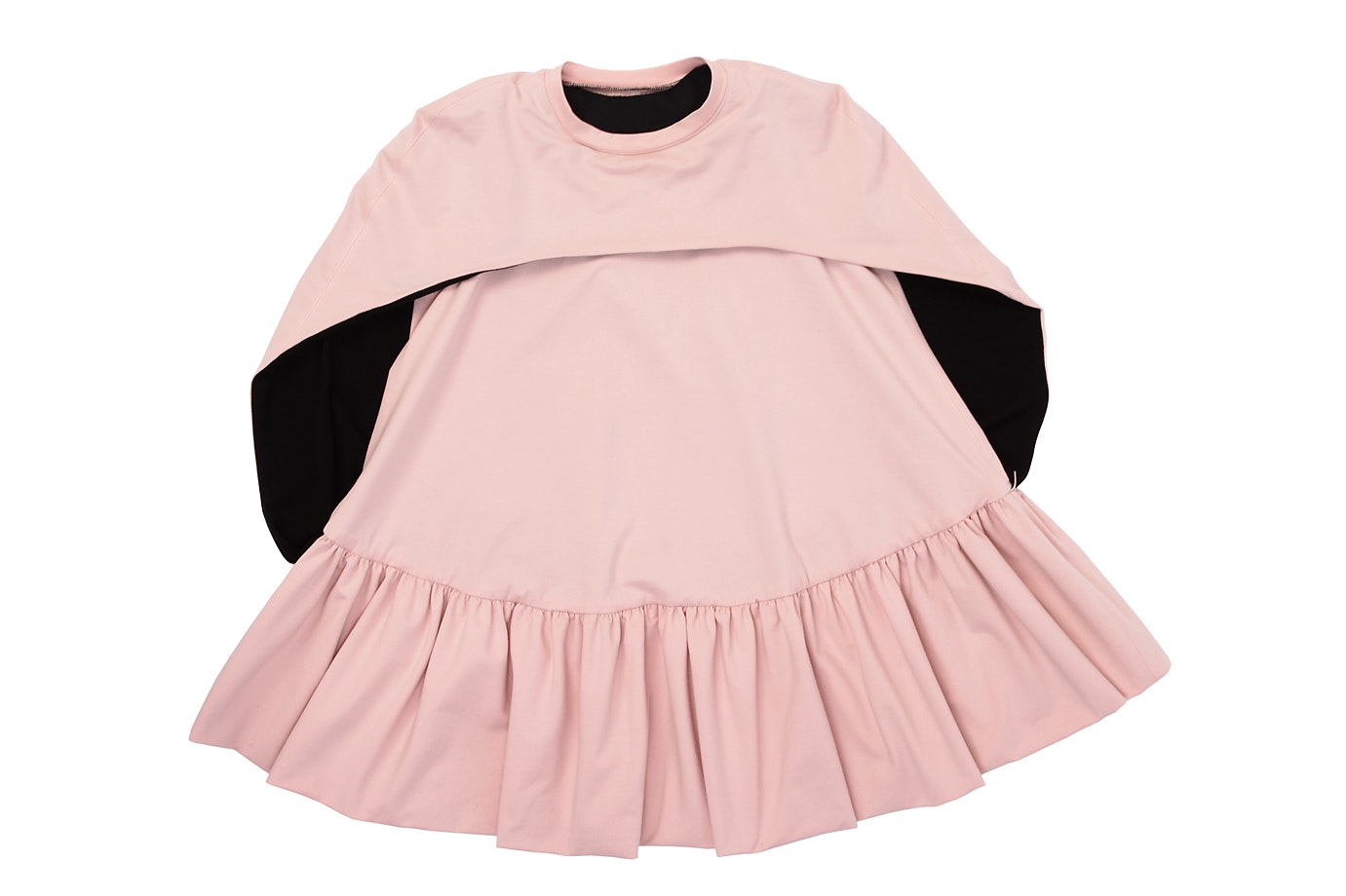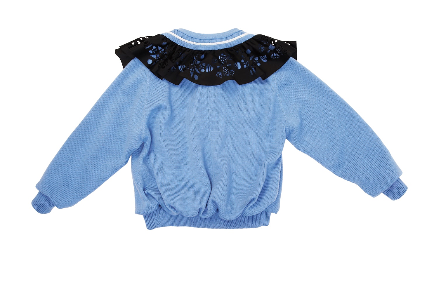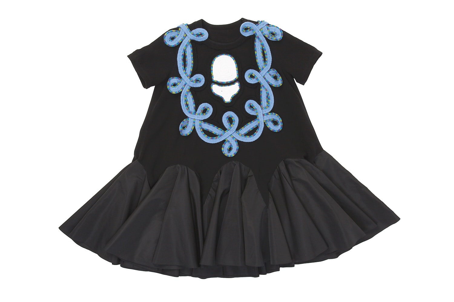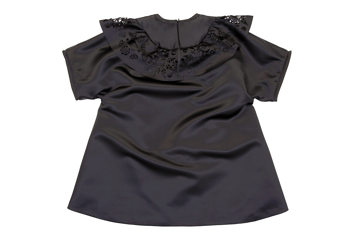 'Dumbalicious', the name of the collection, plays – as do her two other collections – with the clichés that often guide our society's gaze. As Emilie Meldem herself points out her 'naïve' starting point was the cliché of the 'woman who has to be dumb and beautiful, but is secretly clever in order to manipulate people'. Her collection plays with this fictitious female role and undermines, criticises and ironises it. This ambiguous play with ambiguity, closeness and distance is successful. The collection (skirts, tops, dresses, hot pants, coat jacket and ear jewellery) is based on A and U shapes, and the pieces are made of jersey, polyester, satin polyester, satin, cotton or wool. What most of them share are typical classic decorations such as passamenterie and embroidery. The passamenterie is made of embroidered ribbons and stitched onto the clothes. Emilie Meldem plays with techniques and makes the decorations look deliberately 'cheap' and, with the motifs she uses, also 'more naïve'. Many of the clothing items have laser-cut borders that look like silhouettes and sometimes like frills, or she uses other lasered shapes that are appliquéd or used as an integral part of the clothes. These shapes speak ironic volumes. We can see rolling pins, ice cream, flowers, diamonds and whipped cream: the sweet life.