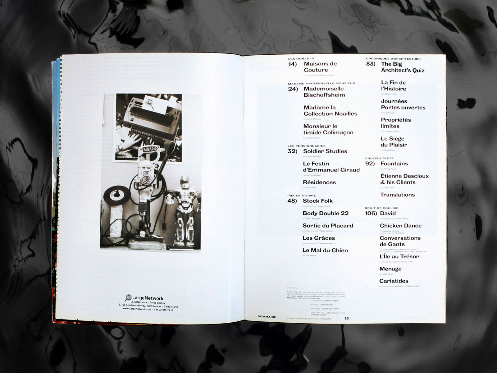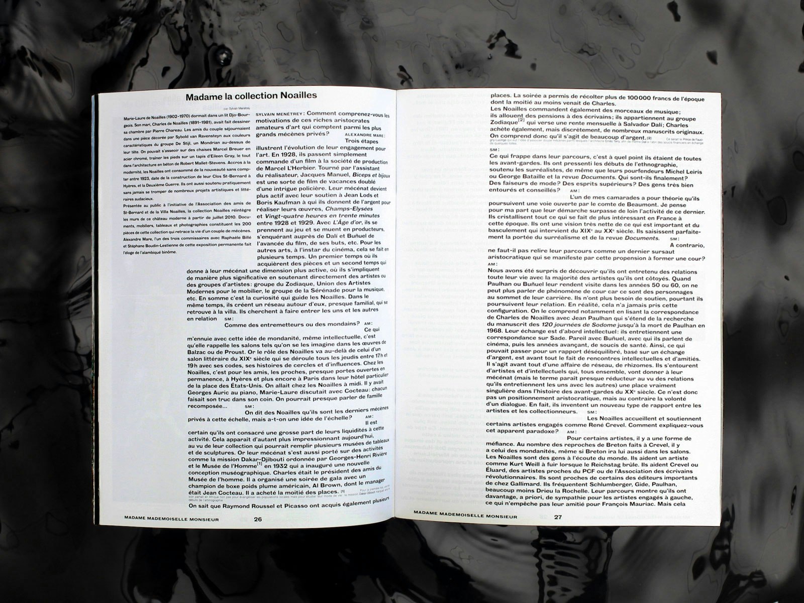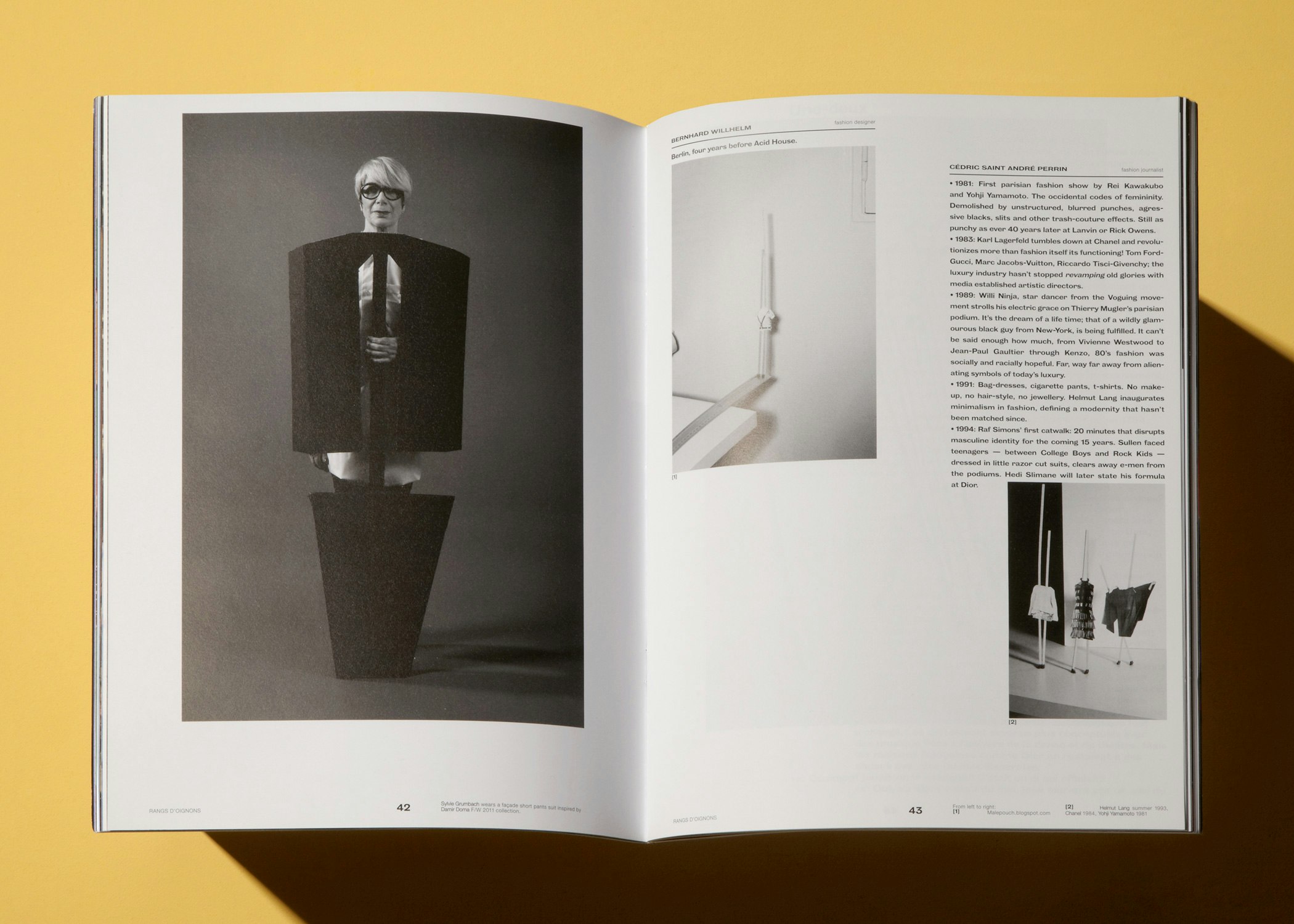 The text section is also intended to be a laboratory for creativity, in which a number of different authors seek to discover new forms. The texts are based on traditional templates such as the interview, but they take them in directions that create a state of ad absurdum - for instance, a dress speaks about the work of the designer who created it, instead of the designer speaking about himself. The people behind the magazine feel that it is important to cultivate a critical attitude of mind in their readers, so that they do not see the texts as separate entities or as pure sources of information, but as part of an exhibition.