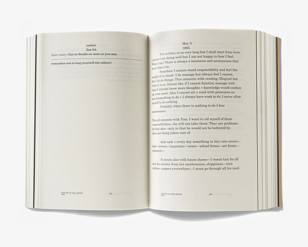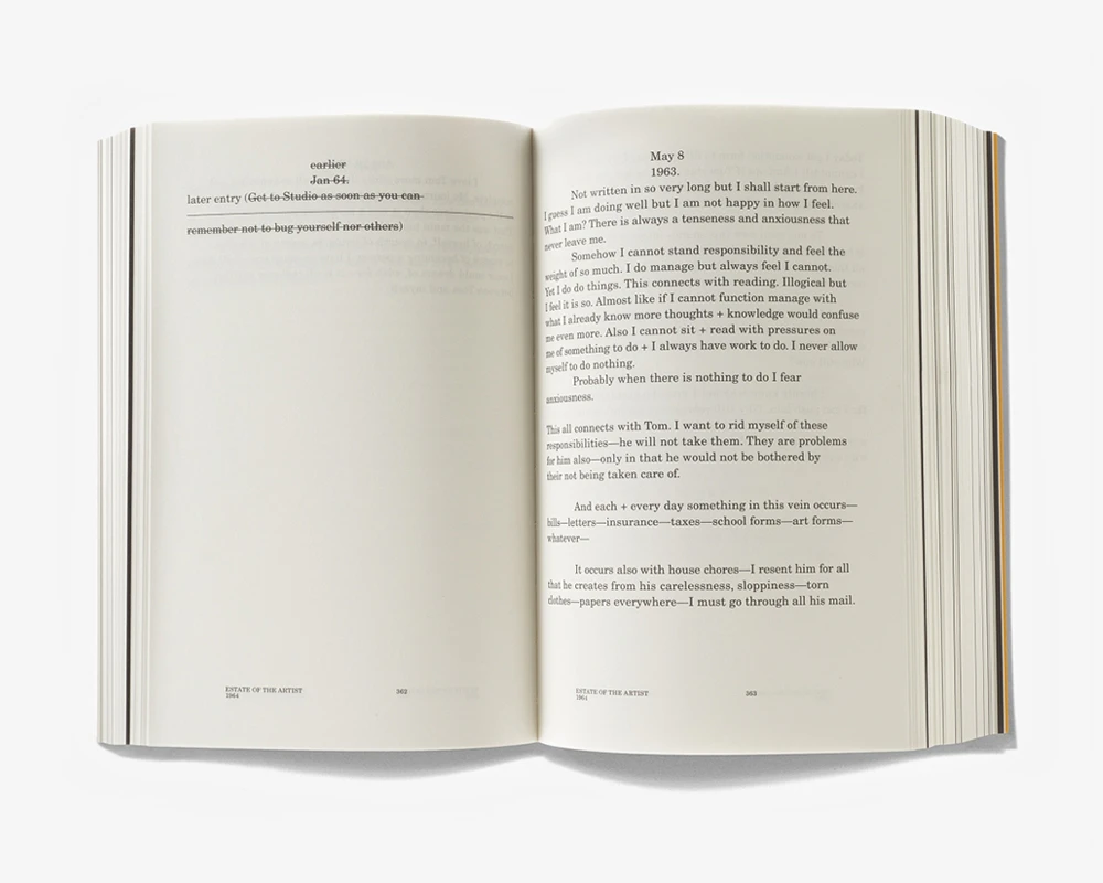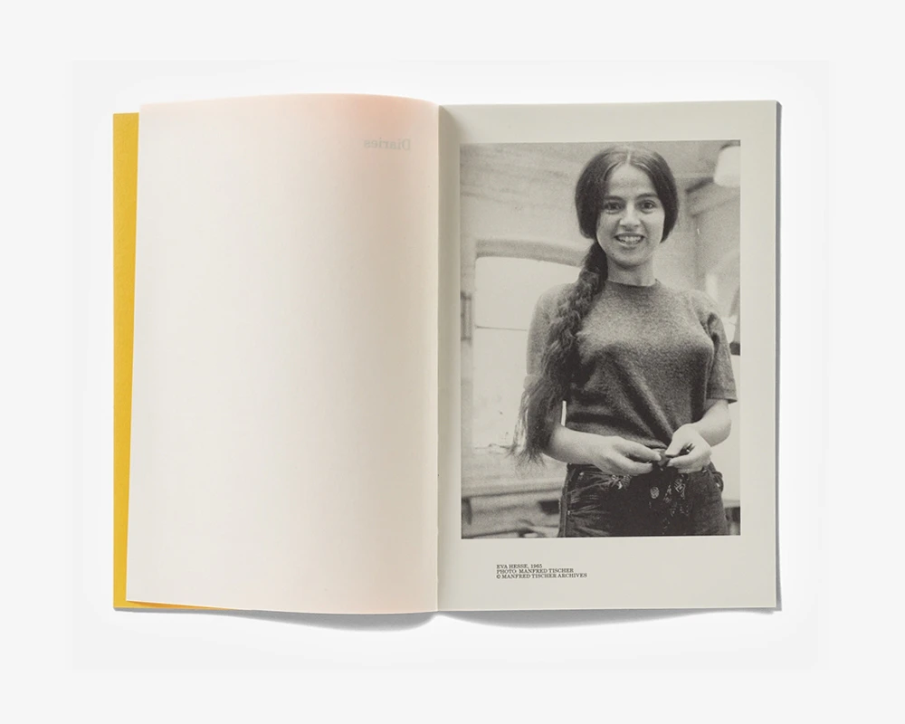 A dozen volumes containing handwritten diary notes by Eva Hesse from the age of 18 to her early death at 34 in 1970 are presented in a 900-page book of text with a mauve laminated softcover. The typography used for representing the manuscripts is especially compelling. An example explains that the manuscript pages were divided into eight columns, providing the book's typographic grid. The font size has been standardised, while upper case, underlining and crossings-out are retained. Other details inform the volume's highly distinctive character: a yellow endpaper, a portrait of Hesse by way of lead-in, a bound bookmark and the use of two black pages visible edge-on to separate the volumes from each other. Thanks to its softcover and sewn and glued sections, the book lies comfortably in the hand despite its considerable size and weight. The calm and meticulous design enhances the reading experience in every respect.