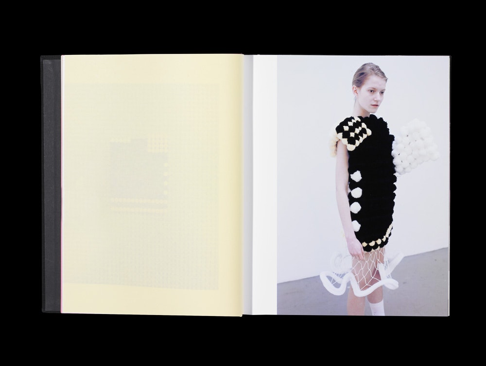 The basic modules for the clothes are in simple black and white; base colours emphasise the structure of the designs, while pastels create isolated highlights. To give the silhouette a more graceful appearance, the designer uses black tulle meshes which give the woollen pompoms a sense of lightness that belies their heaviness and density.