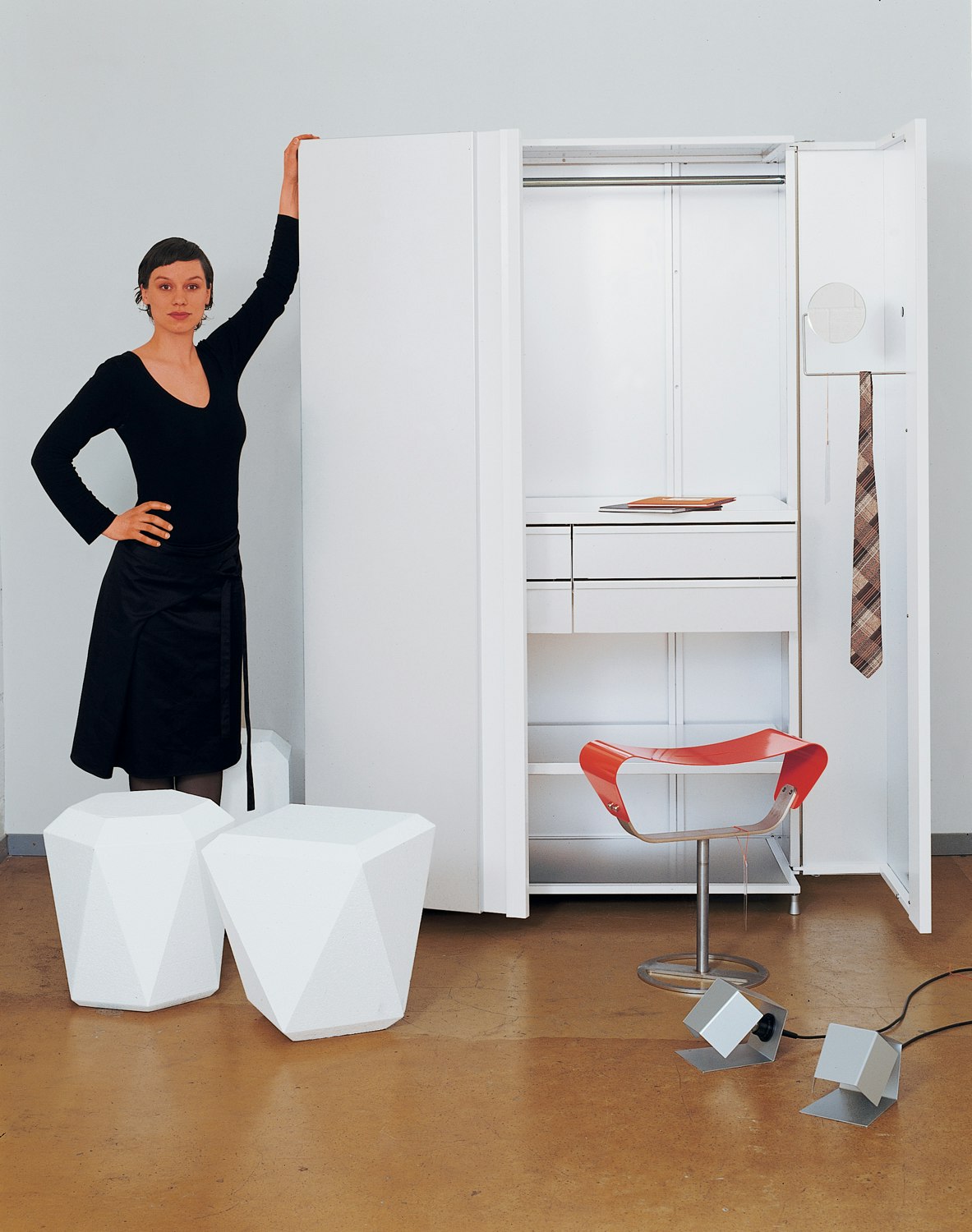 The submitted objects represent Frédéric Dedelley's wide range of work as a product designer. The pieces are characterised by clear lines and unadorned, intelligent design. At the same time, however, they are not just reasonably and ascetically designed objects, because they all radiate sensual dignity. They thus also reveal Frédéric Dedelley's marked sensitivity for spatial design. The wardrobe opens up a well-designed internal world, an independent space, which - as a boudoir - can be individually adapted to one's personal needs. The polystyrene stools, which are representative of the exhibition design of ‘Swiss Design 2003', are reminiscent of the atmospheric and respectful exhibition design at mu.dac in Lausanne. The polystyrene furniture, as a clear optical connection of the independent exhibition objects, pervaded the rooms, which were designed with a convincing colour concept, as if by prominent and clearly legible graphic art. Only details (such as the doors and drawers, which are somewhat noisy upon closing, and the white lacquered plate of the wardrobe) form a contrast to the otherwise extremely professional and coherent design and working.