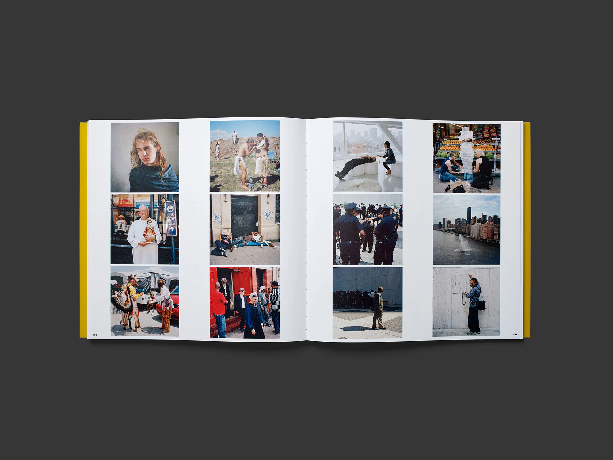 This large square photo book with a softcover and yellow dust jacket made of an unusual paper combines extremely pared-down design with elaborate, manual image management. Over 1,500 square photos by Jiří Makovec are arranged on a double page in four columns of three images each. The only typographical element is the page numbers at the outside bottom corners. The list of images is included as an insert in a somewhat smaller format and makes clear that the photos are grouped in a reverse chronology from 2018 to 2002 but have been freely arranged within each year. The composition on the double pages is matched to the form and content of the individual photos with great subtlety. The unusual public scenes that Makovec frequently captures combine to create enigmatic and highly allusive narratives, blending archival presentation with the appearance of a travel diary. Due to its weight and size – identical to that of a record sleeve – and its softcover, the object is not entirely easy to hold in one’s hands. The weightiness of the content is such as to question the book’s very form.